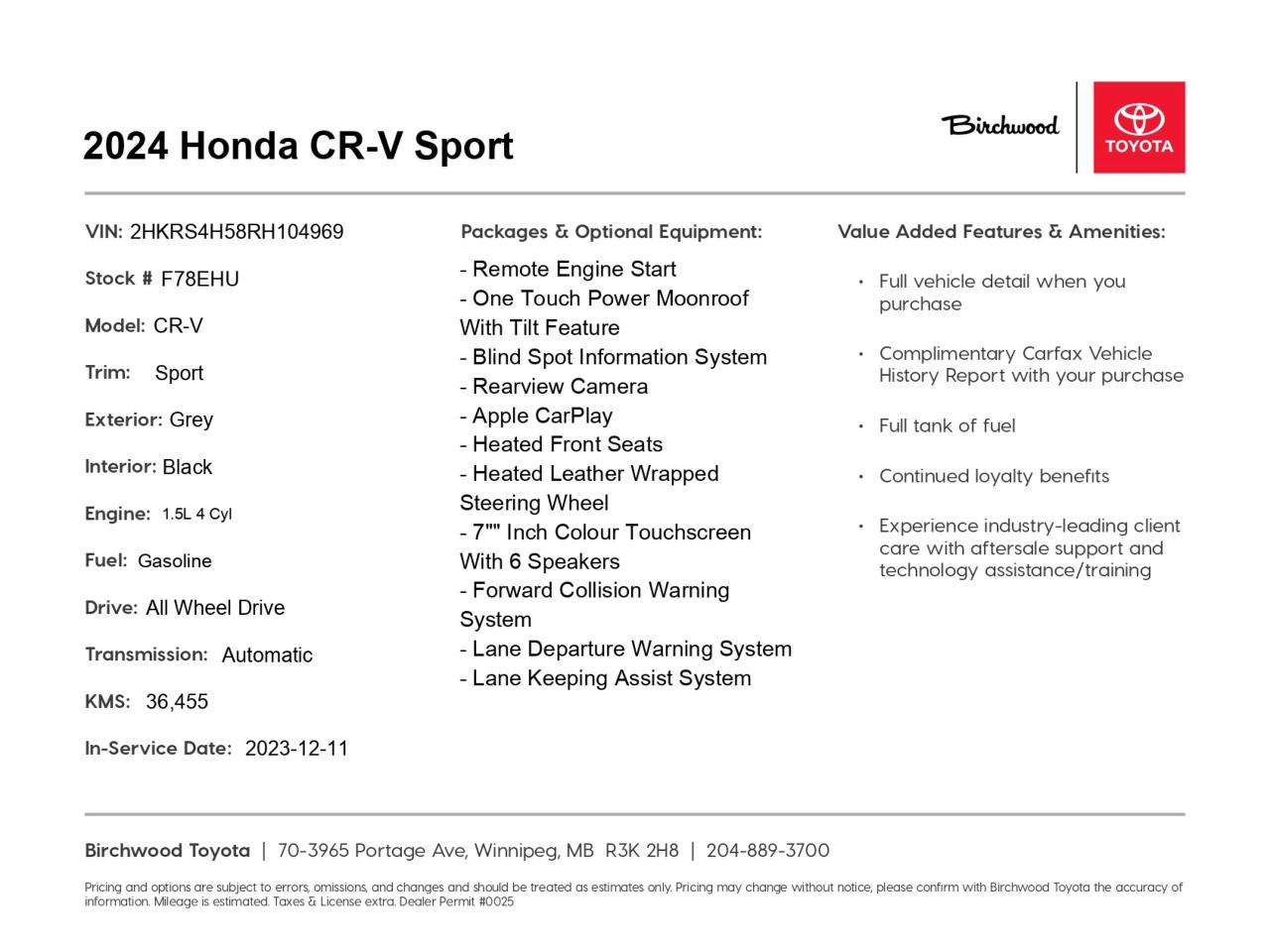 Don't miss out on this exceptional Honda CR-V! Visit Birchwood Toyota today to take it for a test drive. Our friendly staff is ready to answer any questions and help you explore financing options. Reserve your spot now or start your purchase journey online your perfect SUV is just a click away!