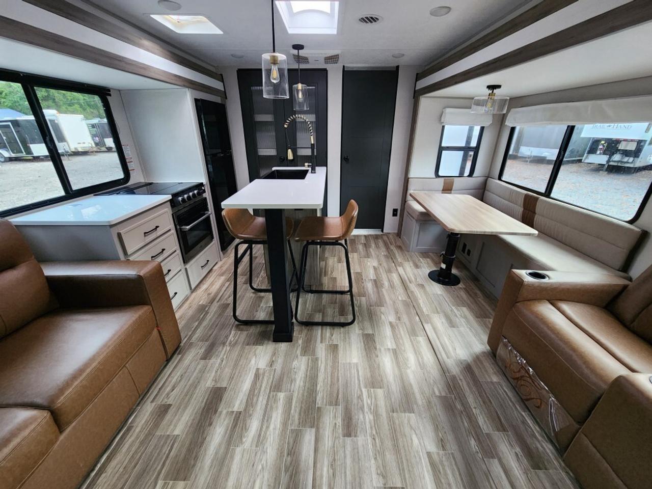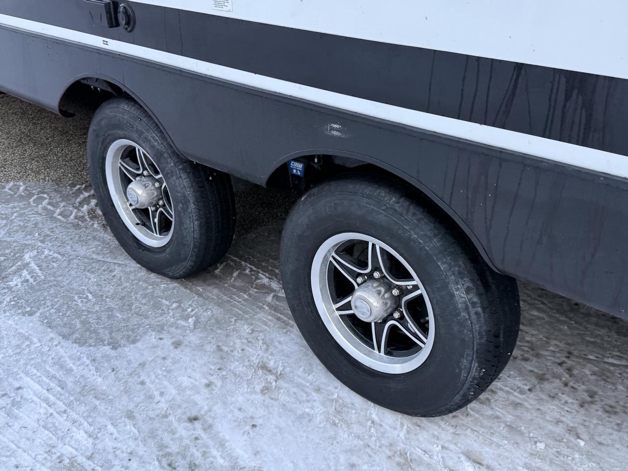 It’s also built for extended stays with practical features that matter: strong storage, a big awning for outdoor living, tankless hot water convenience, and modern preps like solar and backup camera capability (depending on how the unit was ordered). Combine that with high holding capacity—especially the 106-gallon grey tank—and you’ve got a trailer that’s ready for busy campgrounds, family trips, and full-week adventures.