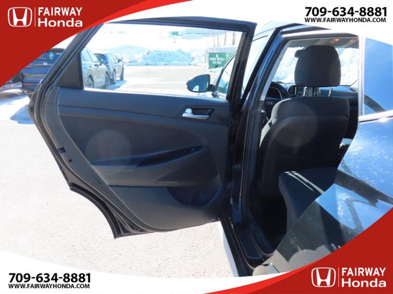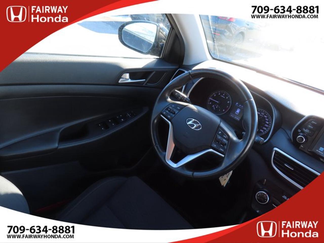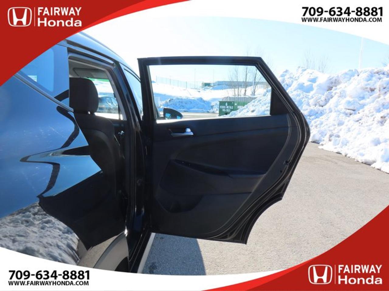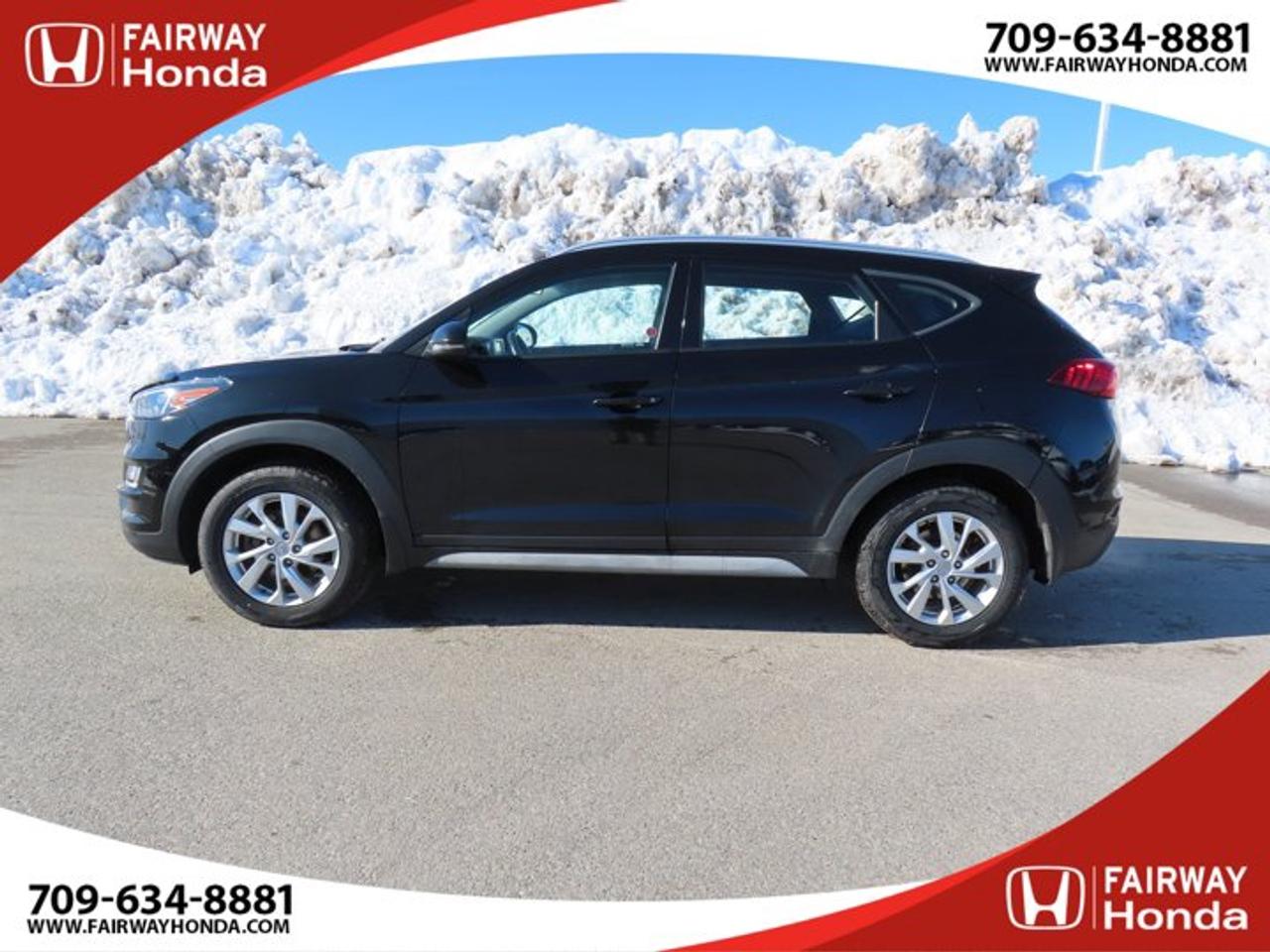 Recent Arrival!Black Noir Pearl 2019 Hyundai Tucson Preferred AWD 6-Speed Automatic with Overdrive 2.0L I4 DGI DOHC 16V LEV3-ULEV70 161hp*Professionally Detailed**Market Value Pricing*, AWD, 3.648 Axle Ratio, 4-Wheel Disc Brakes, 6 Speakers, ABS brakes, Air Conditioning, Alloy wheels, AM/FM radio, Anti-whiplash front head restraints, AppLink/Apple CarPlay and Android Auto, Brake assist, Bumpers: body-colour, Cloth Seat Trim, Delay-off headlights, Driver door bin, Driver vanity mirror, Dual front impact airbags, Dual front side impact airbags, Electronic Stability Control, Exterior Parking Camera Rear, Four wheel independent suspension, Front anti-roll bar, Front Bucket Seats, Front fog lights, Front reading lights, Fully automatic headlights, Heated door mirrors, Heated Front Bucket Seats (3-Steps), Heated front seats, Heated rear seats, Heated steering wheel, Illuminated entry, Leather Shift Knob, Occupant sensing airbag, Outside temperature display, Overhead airbag, Overhead console, Panic alarm, Passenger door bin, Passenger vanity mirror, Power door mirrors, Power steering, Power windows, Radio: AM/FM/MP3 Audio System, Rear anti-roll bar, Rear window defroster, Rear window wiper, Remote keyless entry, Roof rack: rails only, Security system, Speed control, Split folding rear seat, Spoiler, Steering wheel mounted audio controls, Tachometer, Telescoping steering wheel, Tilt steering wheel, Traction control, Trip computer, Turn signal indicator mirrors, Variably intermittent wipers, Wheels: 17" x 7.0J Aluminum.Reviews:* Most owners say this era of Tucson attracted their attention with unique exterior styling, and sealed the deal with a great balance of comfortable ride quality and sporty, spirited driving dynamics. Bang-for-the-buck was highly rated as well. Source: autoTRADER.caFairway Honda - Community Driven!