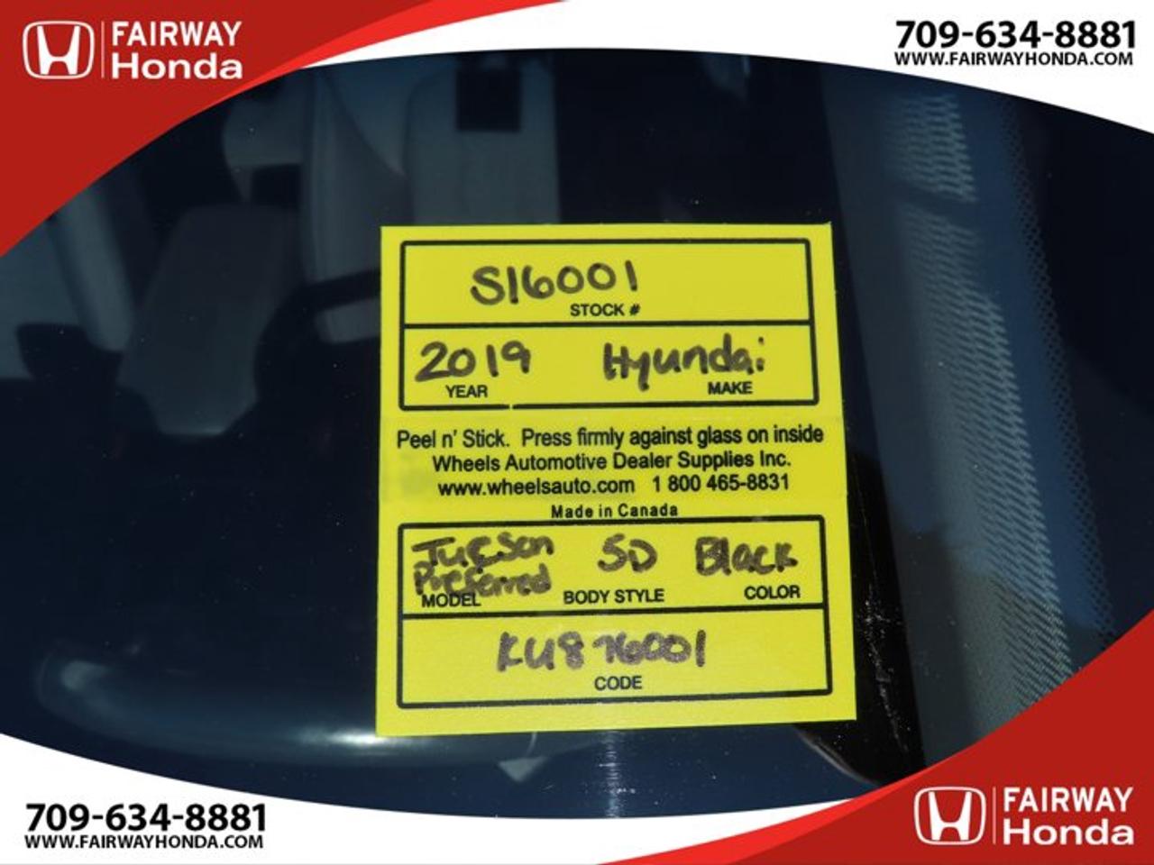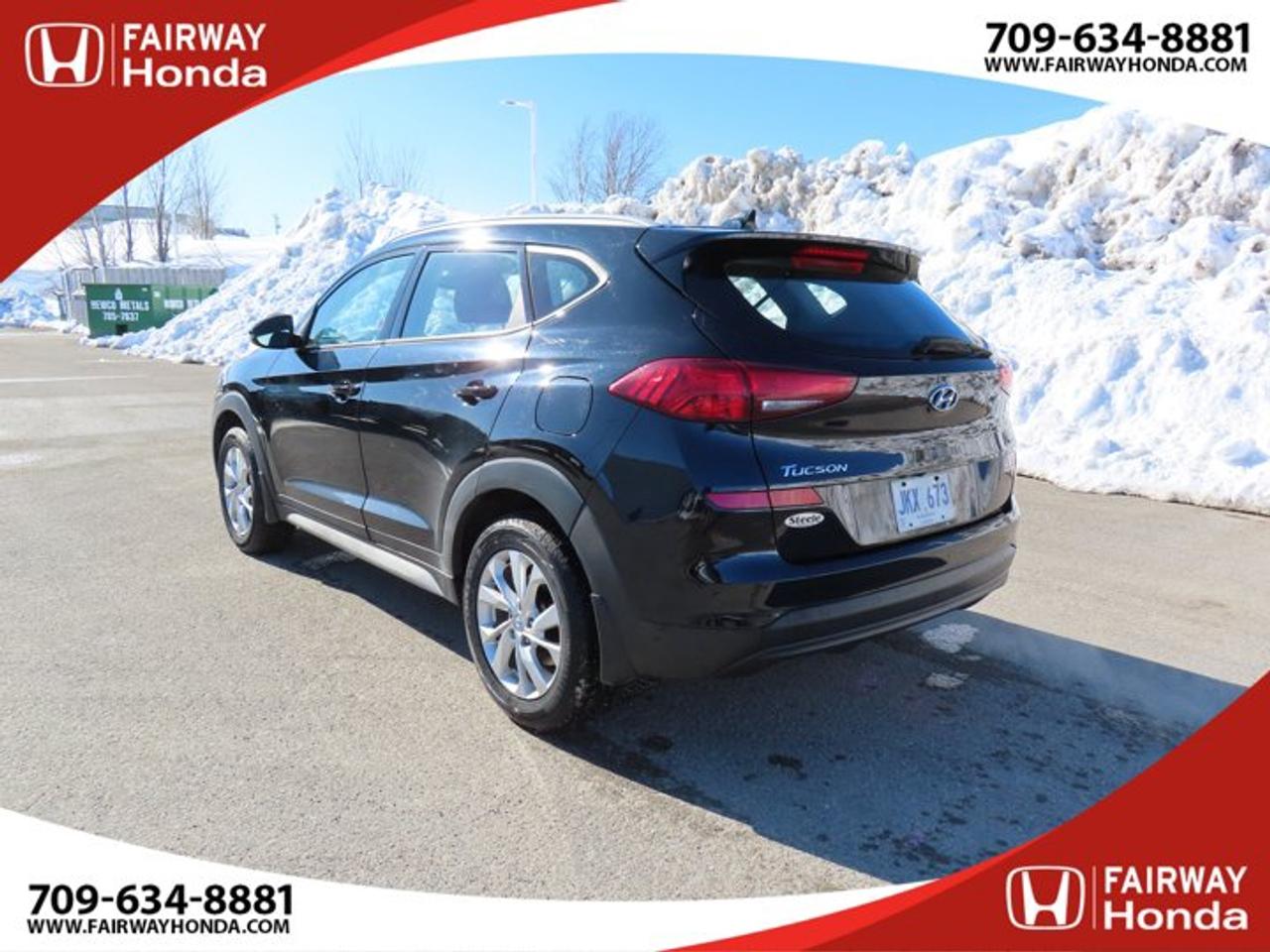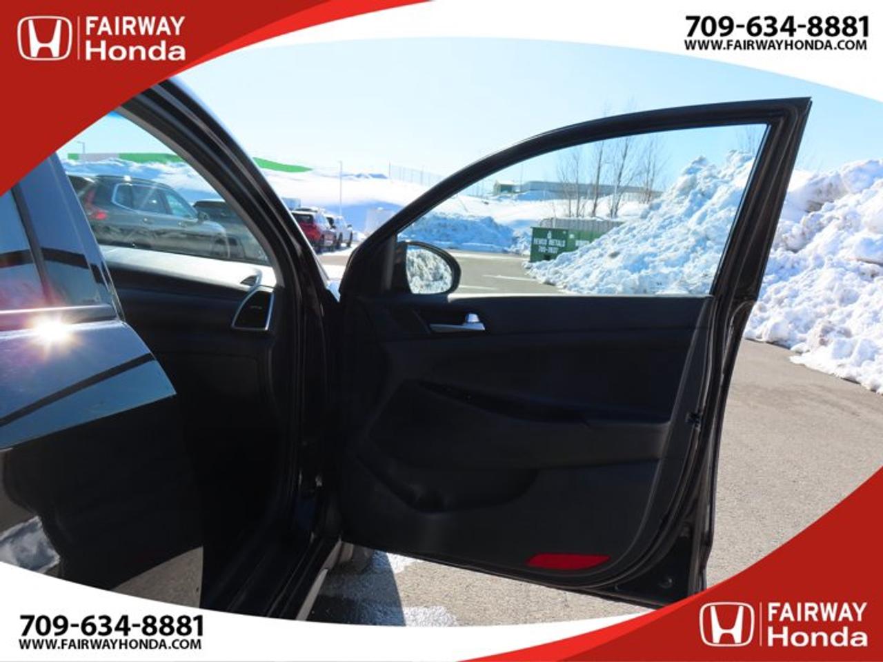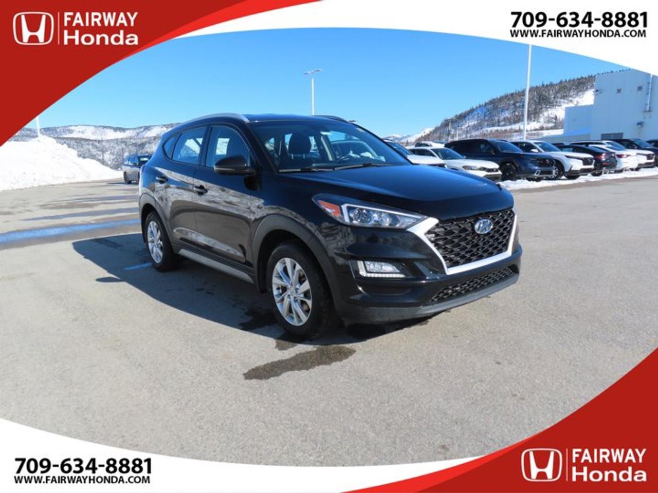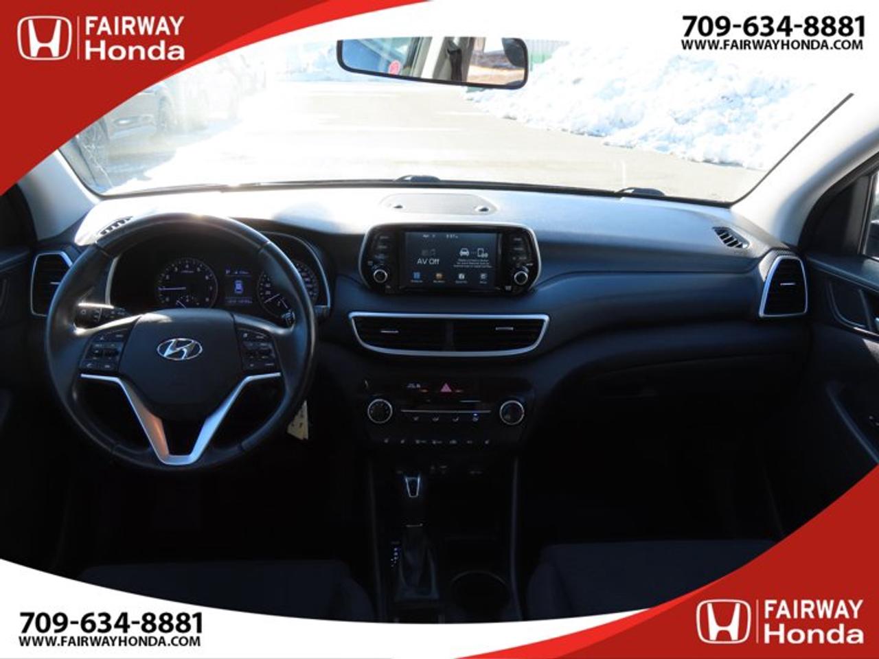 Recent Arrival!Black Noir Pearl 2019 Hyundai Tucson Preferred AWD 6-Speed Automatic with Overdrive 2.0L I4 DGI DOHC 16V LEV3-ULEV70 161hp*Professionally Detailed**Market Value Pricing*, AWD, 3.648 Axle Ratio, 4-Wheel Disc Brakes, 6 Speakers, ABS brakes, Air Conditioning, Alloy wheels, AM/FM radio, Anti-whiplash front head restraints, AppLink/Apple CarPlay and Android Auto, Brake assist, Bumpers: body-colour, Cloth Seat Trim, Delay-off headlights, Driver door bin, Driver vanity mirror, Dual front impact airbags, Dual front side impact airbags, Electronic Stability Control, Exterior Parking Camera Rear, Four wheel independent suspension, Front anti-roll bar, Front Bucket Seats, Front fog lights, Front reading lights, Fully automatic headlights, Heated door mirrors, Heated Front Bucket Seats (3-Steps), Heated front seats, Heated rear seats, Heated steering wheel, Illuminated entry, Leather Shift Knob, Occupant sensing airbag, Outside temperature display, Overhead airbag, Overhead console, Panic alarm, Passenger door bin, Passenger vanity mirror, Power door mirrors, Power steering, Power windows, Radio: AM/FM/MP3 Audio System, Rear anti-roll bar, Rear window defroster, Rear window wiper, Remote keyless entry, Roof rack: rails only, Security system, Speed control, Split folding rear seat, Spoiler, Steering wheel mounted audio controls, Tachometer, Telescoping steering wheel, Tilt steering wheel, Traction control, Trip computer, Turn signal indicator mirrors, Variably intermittent wipers, Wheels: 17" x 7.0J Aluminum.Reviews:* Most owners say this era of Tucson attracted their attention with unique exterior styling, and sealed the deal with a great balance of comfortable ride quality and sporty, spirited driving dynamics. Bang-for-the-buck was highly rated as well. Source: autoTRADER.caFairway Honda - Community Driven!