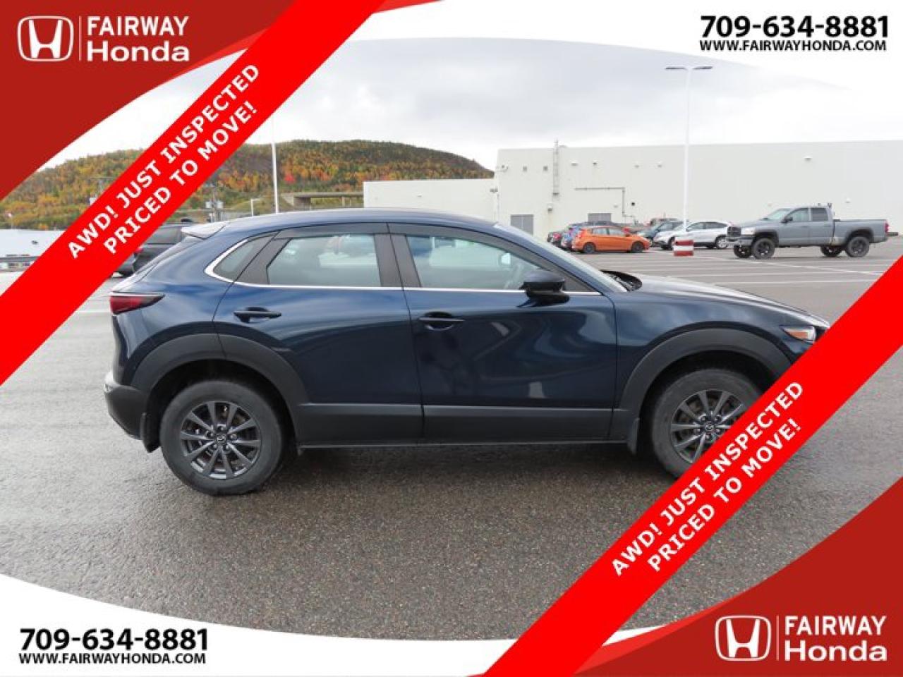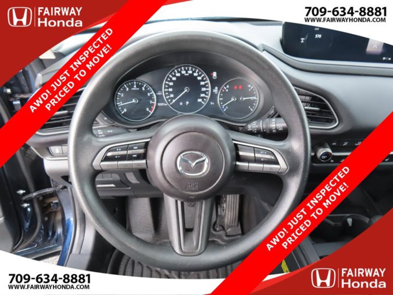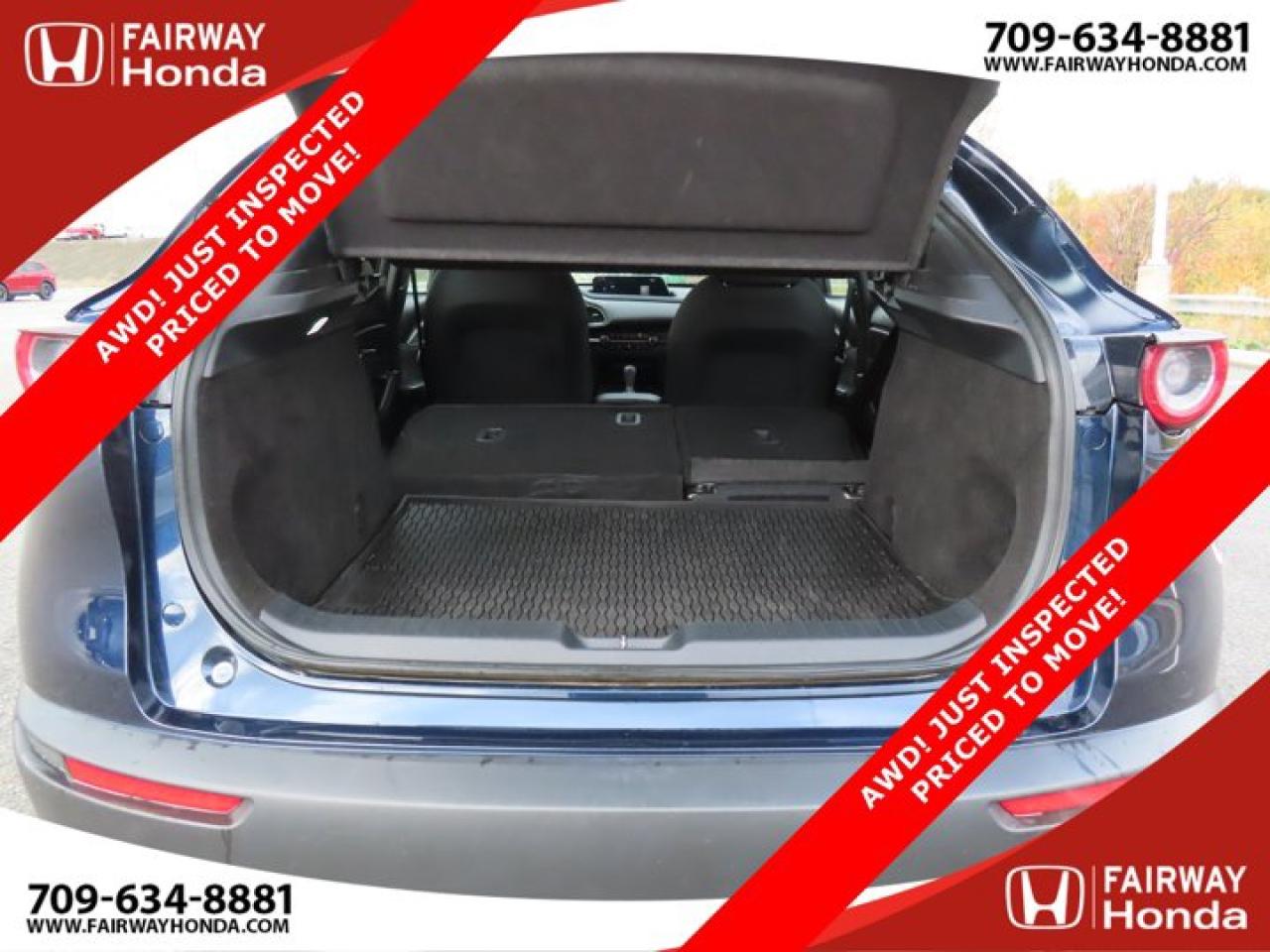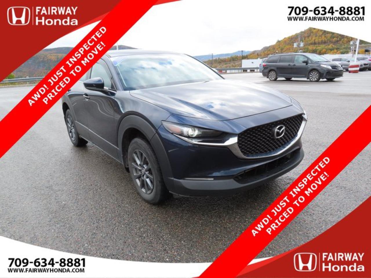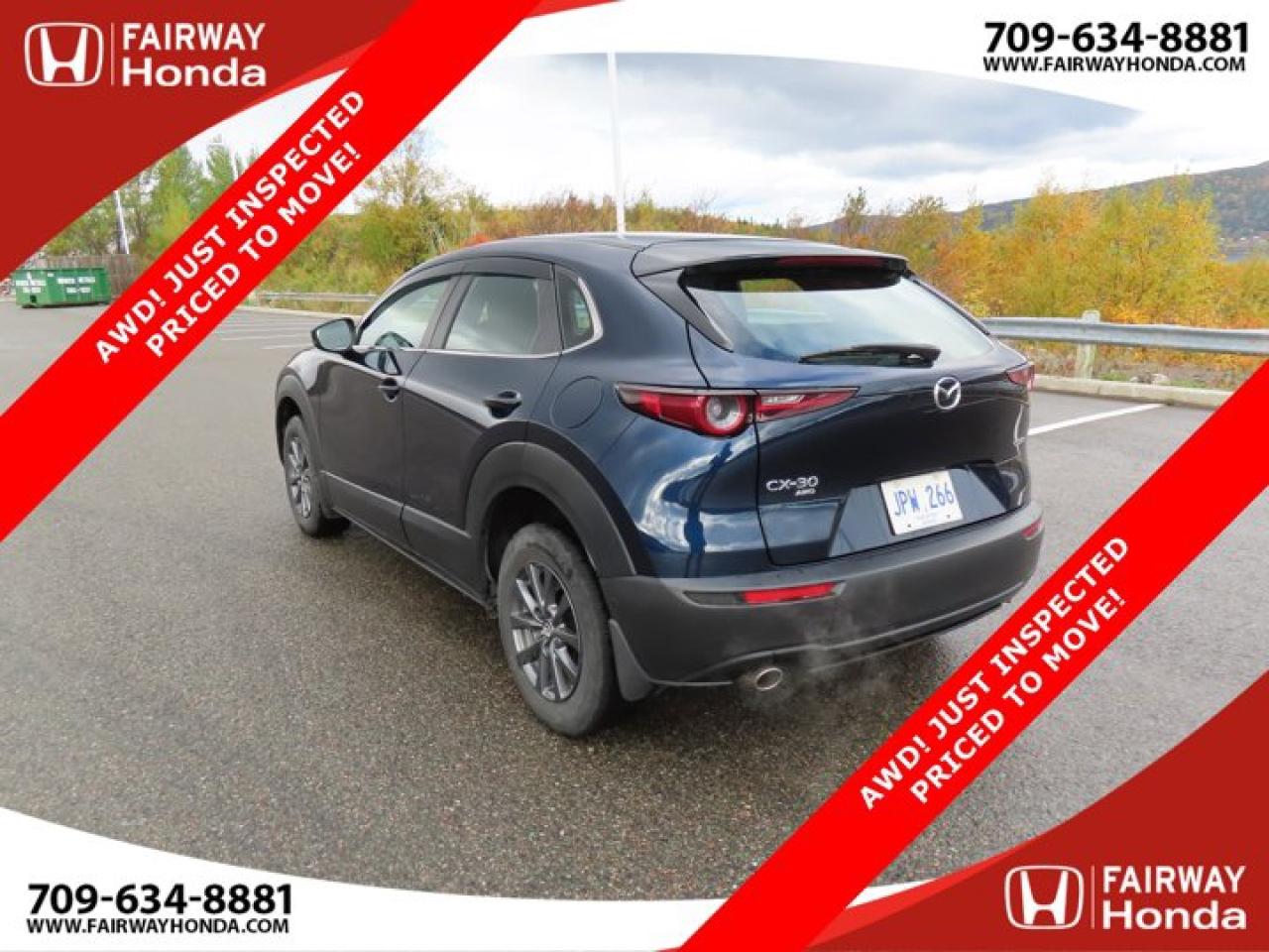 Recent Arrival!Deep Crystal Blue Mica 2023 Mazda CX-30 GX AWD! JUST INSPECTED PRICED TO MOVE! AWD 6-Speed Automatic I4*Professionally Detailed*, *Market Value Pricing*, 4-Wheel Disc Brakes, 8 Speakers, ABS brakes, Air Conditioning, Alloy wheels, AM/FM radio, AppLink/Apple CarPlay and Android Auto, Brake assist, Bumpers: body-colour, Cloth Upholstery, Compass, Delay-off headlights, Driver door bin, Driver vanity mirror, Dual front impact airbags, Dual front side impact airbags, Electronic Stability Control, Emergency communication system: Mazda Connected Services (2-year trial subscription included), Exterior Parking Camera Rear, Front anti-roll bar, Front Bucket Seats, Front reading lights, Front wheel independent suspension, Fully automatic headlights, Heated front seats, Heated Front Seats (3 Settings), Illuminated entry, Knee airbag, Low tire pressure warning, Occupant sensing airbag, Outside temperature display, Overhead airbag, Panic alarm, Passenger door bin, Passenger vanity mirror, Power door mirrors, Power steering, Power windows, Radio data system, Radio: AM/FM/HD w/Navigation-Ready, Rain sensing wipers, Rear side impact airbag, Rear window defroster, Rear window wiper, Remote keyless entry, Speed control, Speed-sensing steering, Split folding rear seat, Spoiler, Steering wheel mounted audio controls, Tachometer, Telescoping steering wheel, Tilt steering wheel, Traction control, Trip computer, Variably intermittent wipers, Wheels: 16" Dark Grey High Lustre Metallic Alloy.Certification Program Details: 85 Point Inspection Top Up Fluids Brake Inspection Tire Inspection Fresh 2 Year MVI Fresh Oil ChangeFairway Honda - Community Driven!