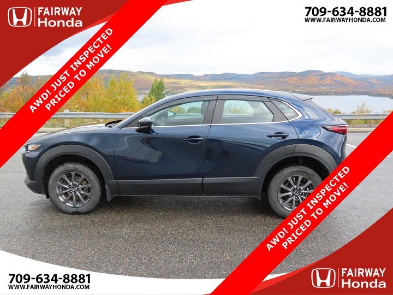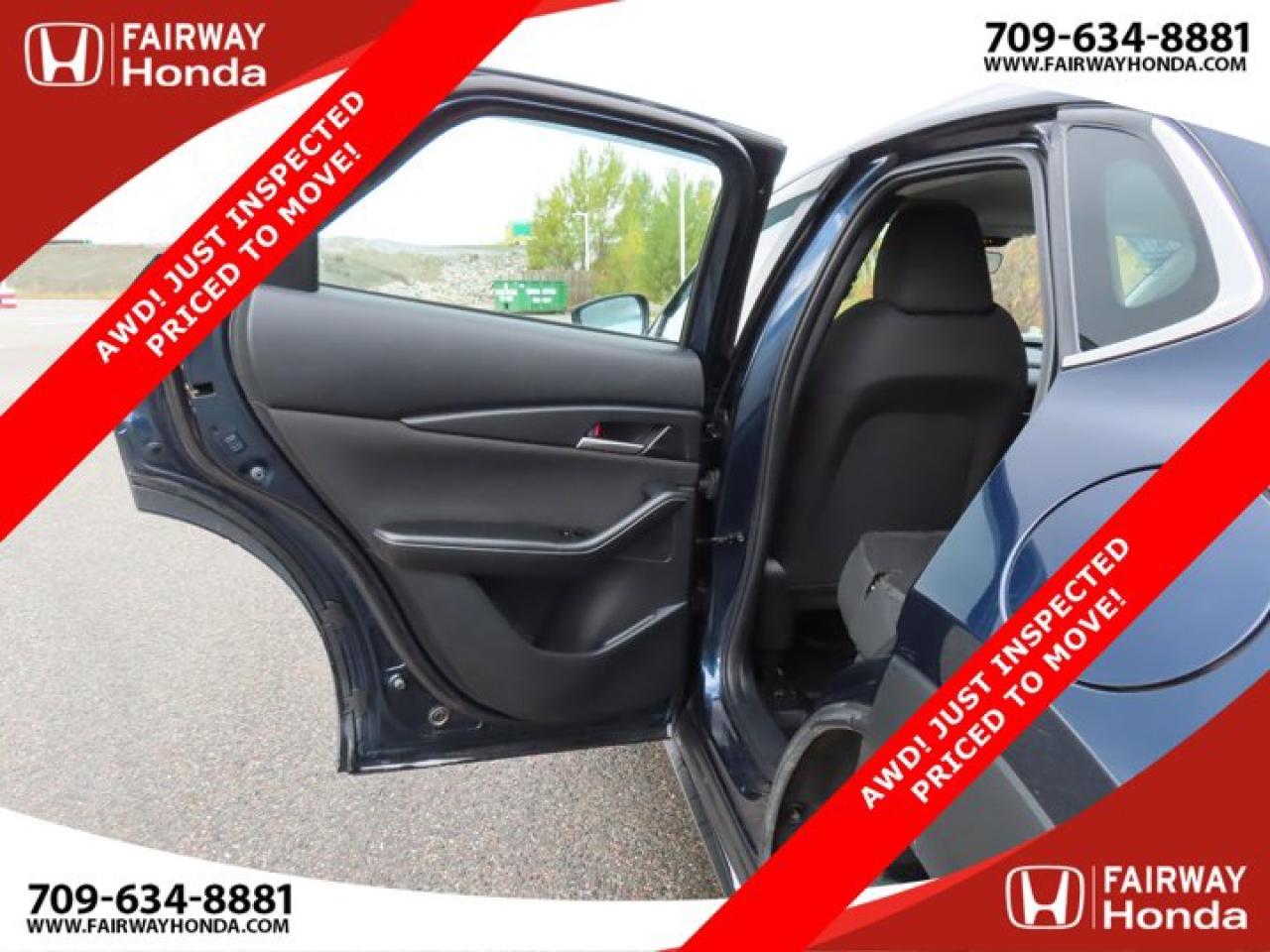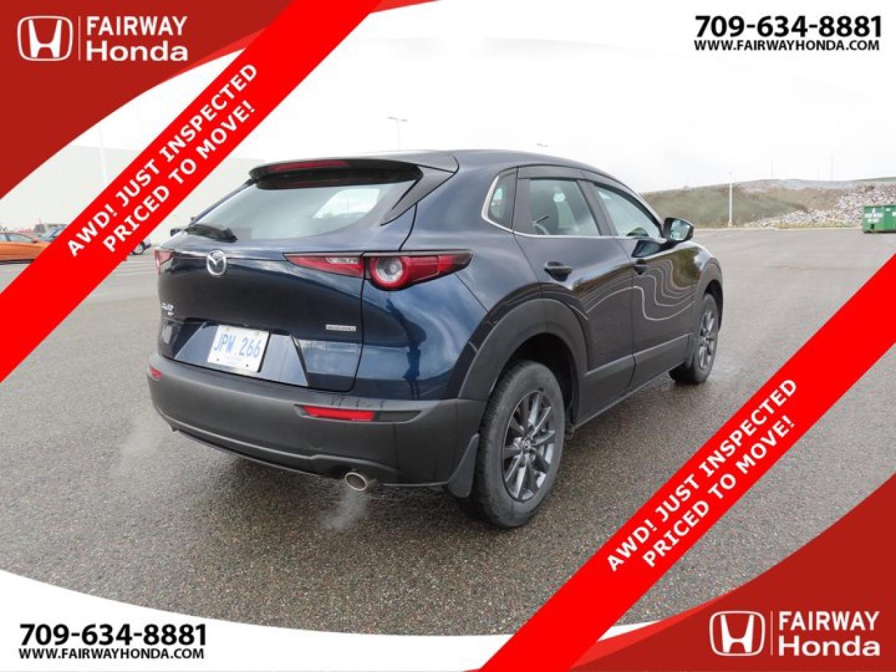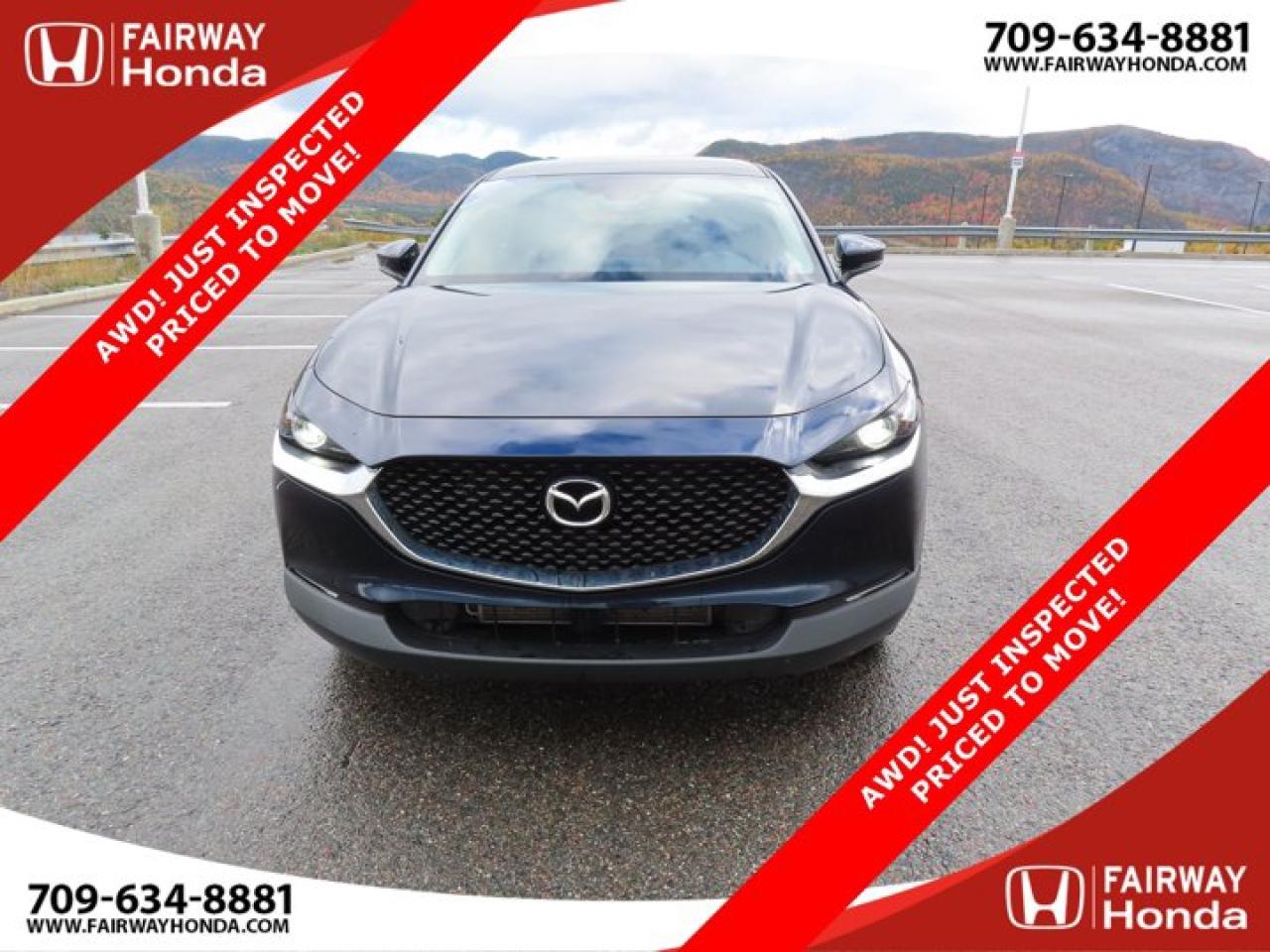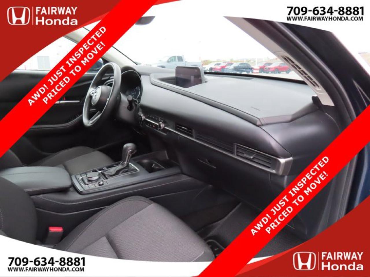 Recent Arrival!Deep Crystal Blue Mica 2023 Mazda CX-30 GX AWD! JUST INSPECTED PRICED TO MOVE! AWD 6-Speed Automatic I4*Professionally Detailed*, *Market Value Pricing*, 4-Wheel Disc Brakes, 8 Speakers, ABS brakes, Air Conditioning, Alloy wheels, AM/FM radio, AppLink/Apple CarPlay and Android Auto, Brake assist, Bumpers: body-colour, Cloth Upholstery, Compass, Delay-off headlights, Driver door bin, Driver vanity mirror, Dual front impact airbags, Dual front side impact airbags, Electronic Stability Control, Emergency communication system: Mazda Connected Services (2-year trial subscription included), Exterior Parking Camera Rear, Front anti-roll bar, Front Bucket Seats, Front reading lights, Front wheel independent suspension, Fully automatic headlights, Heated front seats, Heated Front Seats (3 Settings), Illuminated entry, Knee airbag, Low tire pressure warning, Occupant sensing airbag, Outside temperature display, Overhead airbag, Panic alarm, Passenger door bin, Passenger vanity mirror, Power door mirrors, Power steering, Power windows, Radio data system, Radio: AM/FM/HD w/Navigation-Ready, Rain sensing wipers, Rear side impact airbag, Rear window defroster, Rear window wiper, Remote keyless entry, Speed control, Speed-sensing steering, Split folding rear seat, Spoiler, Steering wheel mounted audio controls, Tachometer, Telescoping steering wheel, Tilt steering wheel, Traction control, Trip computer, Variably intermittent wipers, Wheels: 16" Dark Grey High Lustre Metallic Alloy.Certification Program Details: 85 Point Inspection Top Up Fluids Brake Inspection Tire Inspection Fresh 2 Year MVI Fresh Oil ChangeFairway Honda - Community Driven!