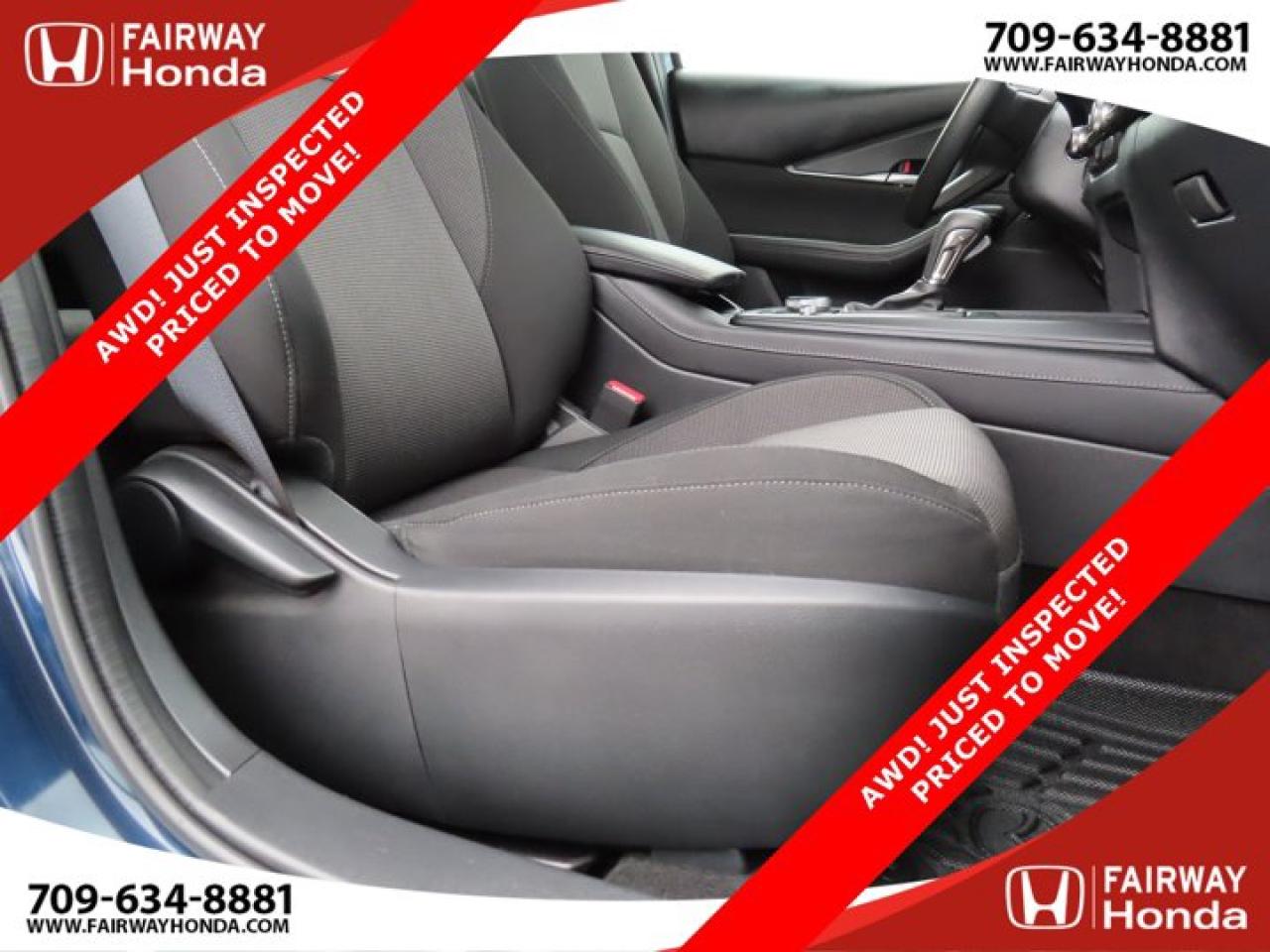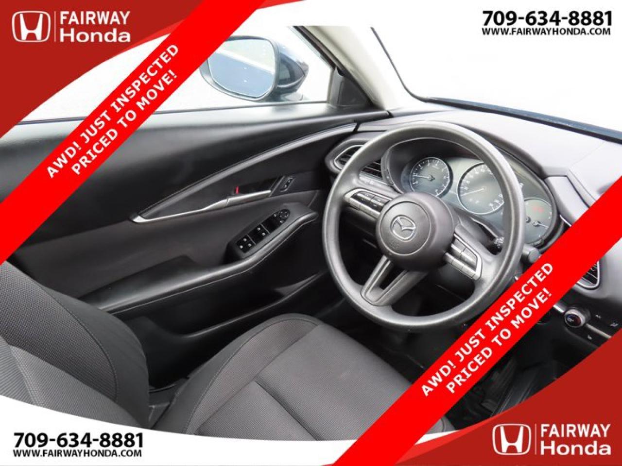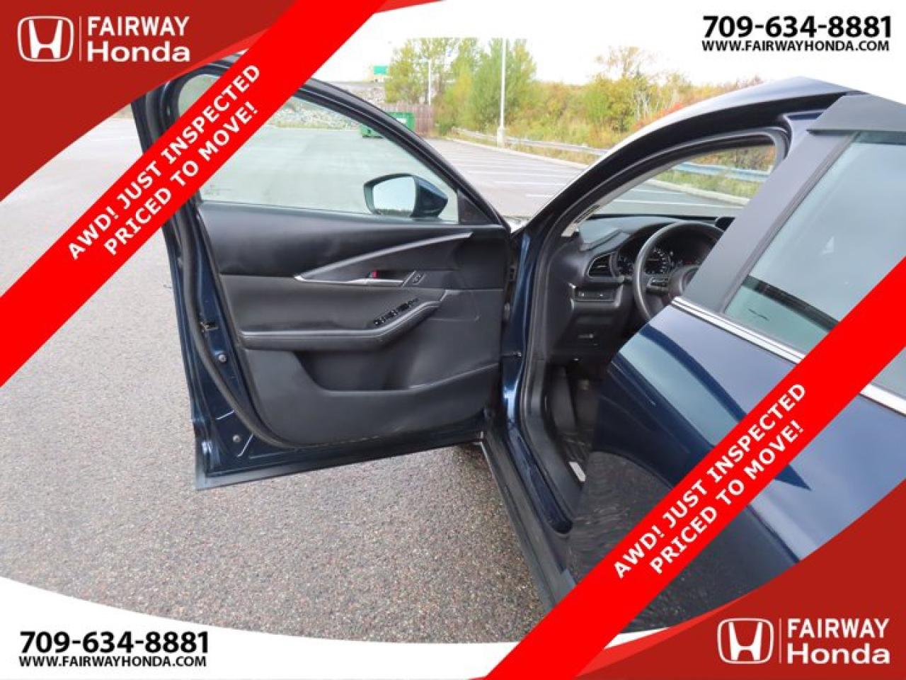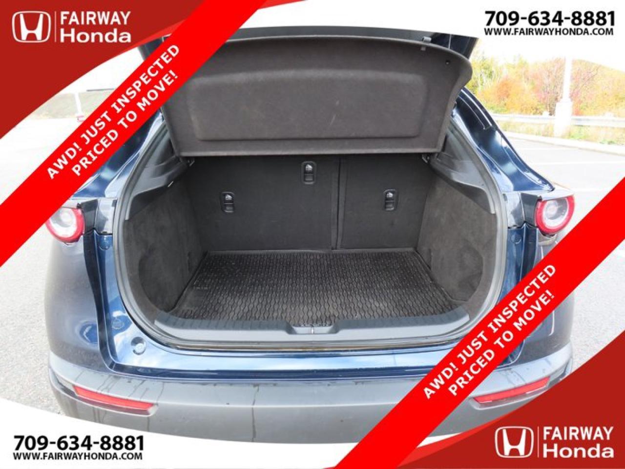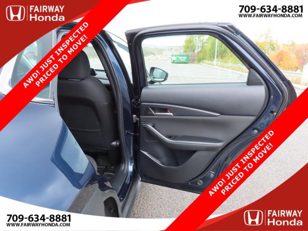 Recent Arrival!Deep Crystal Blue Mica 2023 Mazda CX-30 GX AWD! JUST INSPECTED PRICED TO MOVE! AWD 6-Speed Automatic I4*Professionally Detailed*, *Market Value Pricing*, 4-Wheel Disc Brakes, 8 Speakers, ABS brakes, Air Conditioning, Alloy wheels, AM/FM radio, AppLink/Apple CarPlay and Android Auto, Brake assist, Bumpers: body-colour, Cloth Upholstery, Compass, Delay-off headlights, Driver door bin, Driver vanity mirror, Dual front impact airbags, Dual front side impact airbags, Electronic Stability Control, Emergency communication system: Mazda Connected Services (2-year trial subscription included), Exterior Parking Camera Rear, Front anti-roll bar, Front Bucket Seats, Front reading lights, Front wheel independent suspension, Fully automatic headlights, Heated front seats, Heated Front Seats (3 Settings), Illuminated entry, Knee airbag, Low tire pressure warning, Occupant sensing airbag, Outside temperature display, Overhead airbag, Panic alarm, Passenger door bin, Passenger vanity mirror, Power door mirrors, Power steering, Power windows, Radio data system, Radio: AM/FM/HD w/Navigation-Ready, Rain sensing wipers, Rear side impact airbag, Rear window defroster, Rear window wiper, Remote keyless entry, Speed control, Speed-sensing steering, Split folding rear seat, Spoiler, Steering wheel mounted audio controls, Tachometer, Telescoping steering wheel, Tilt steering wheel, Traction control, Trip computer, Variably intermittent wipers, Wheels: 16" Dark Grey High Lustre Metallic Alloy.Certification Program Details: 85 Point Inspection Top Up Fluids Brake Inspection Tire Inspection Fresh 2 Year MVI Fresh Oil ChangeFairway Honda - Community Driven!