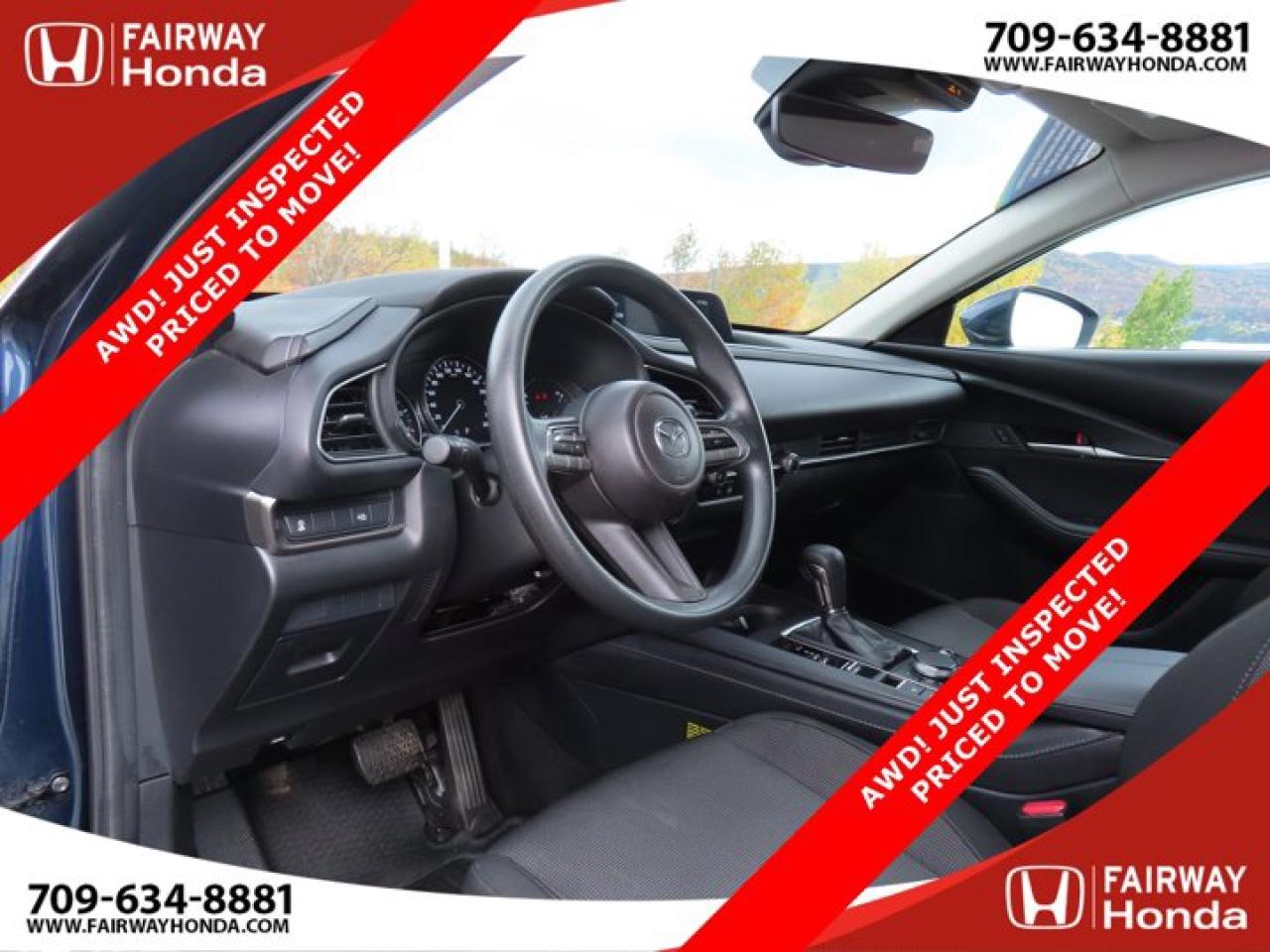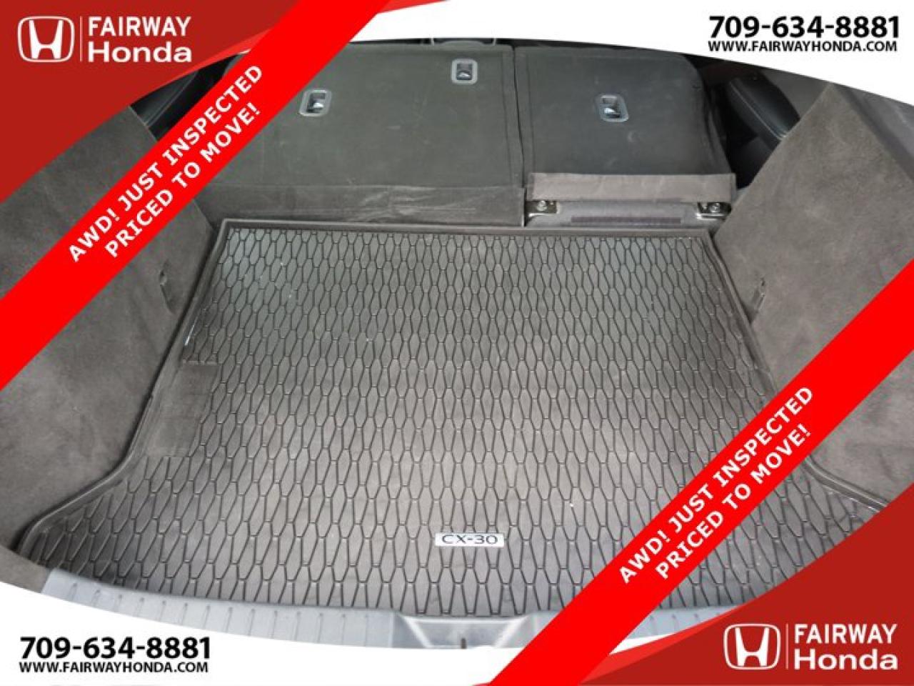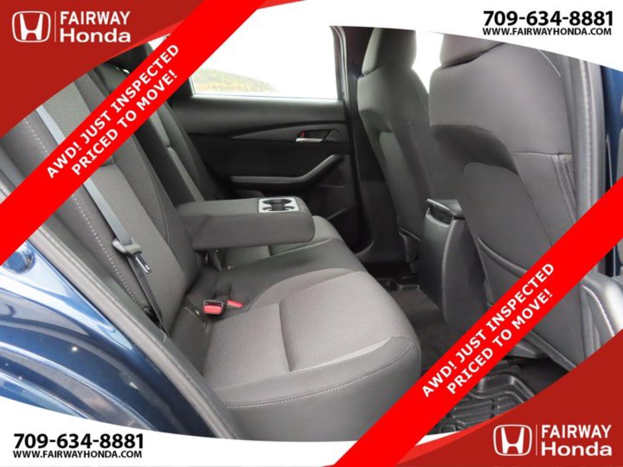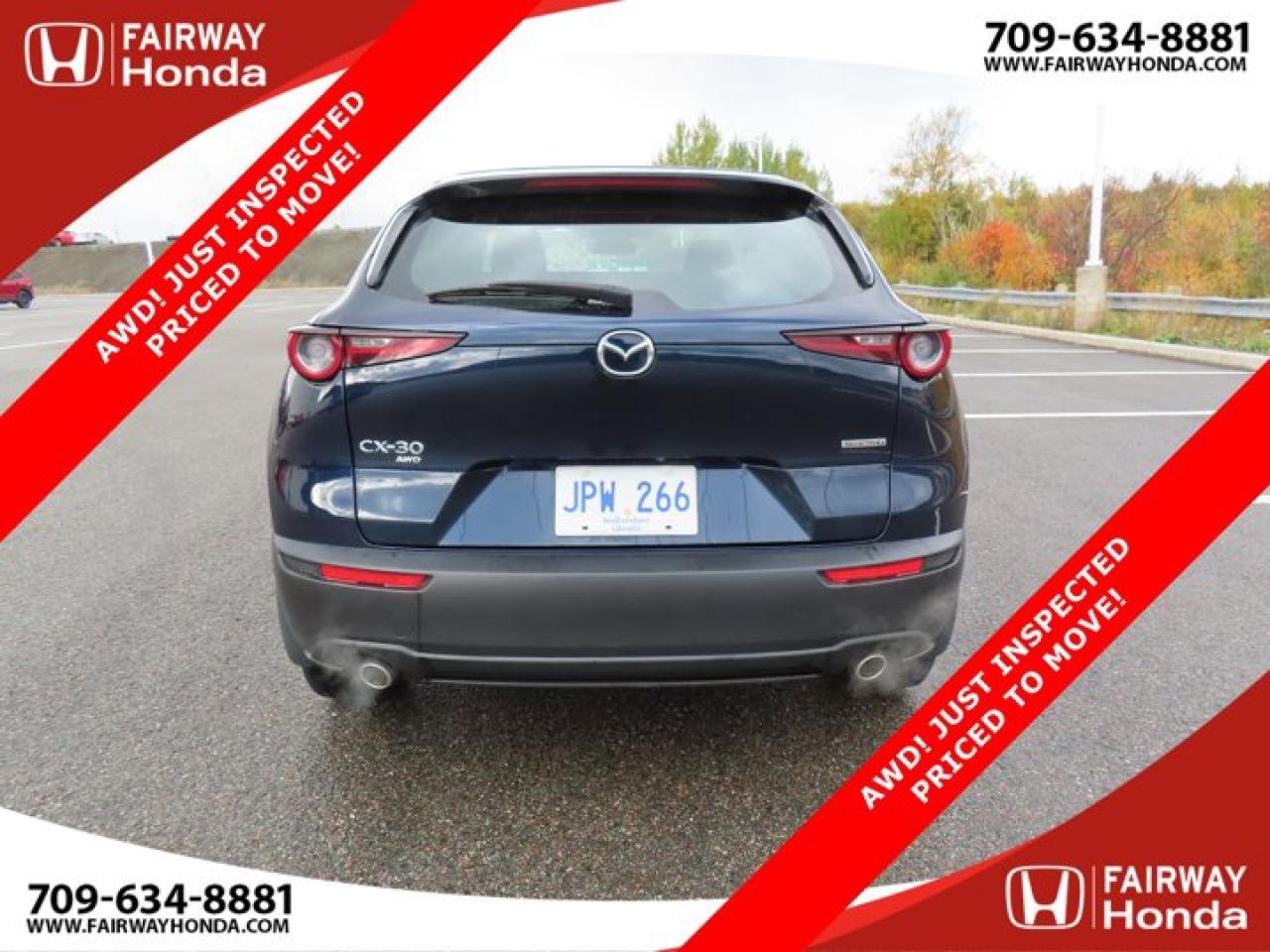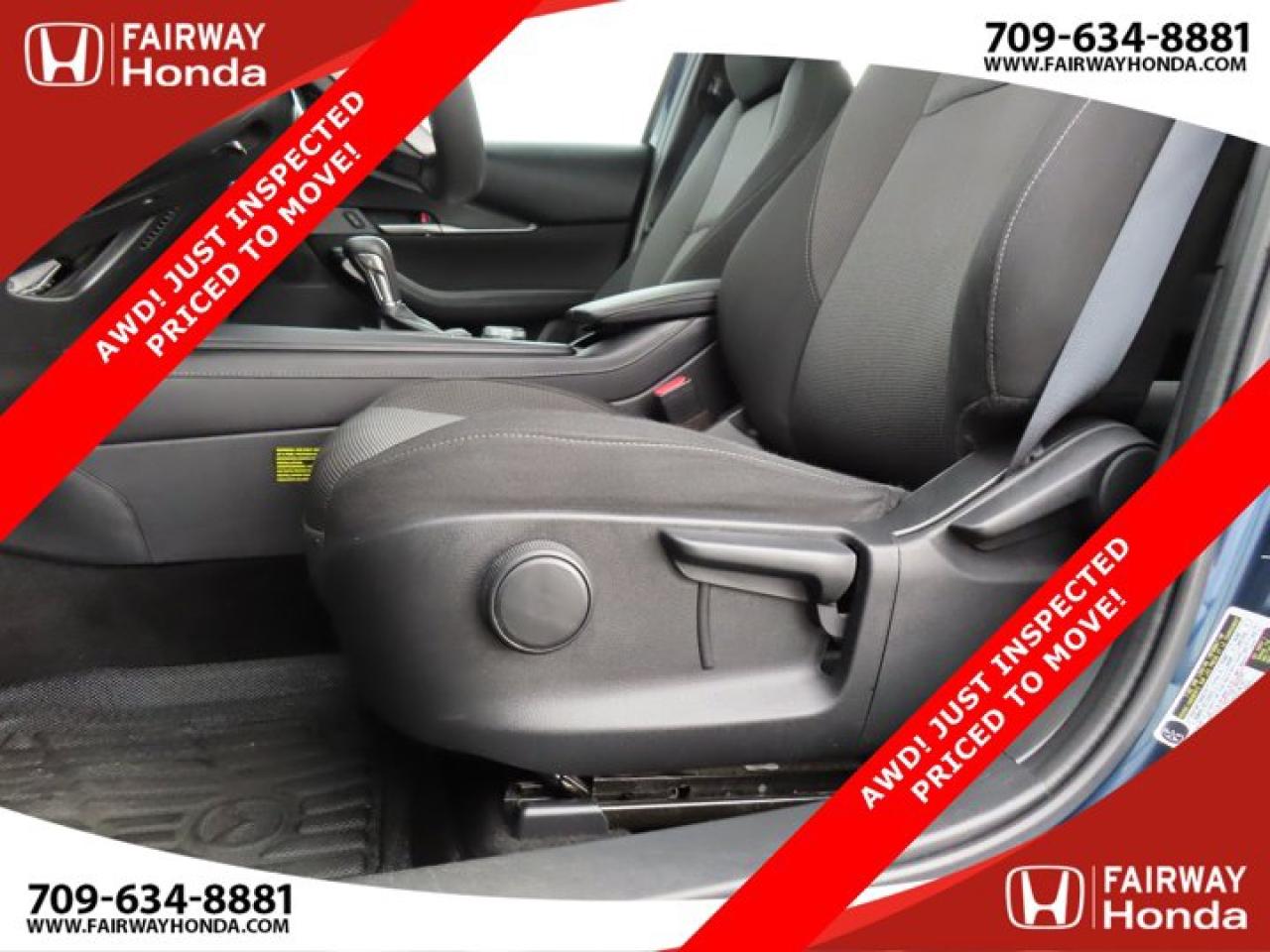 Recent Arrival!Deep Crystal Blue Mica 2023 Mazda CX-30 GX AWD! JUST INSPECTED PRICED TO MOVE! AWD 6-Speed Automatic I4*Professionally Detailed*, *Market Value Pricing*, 4-Wheel Disc Brakes, 8 Speakers, ABS brakes, Air Conditioning, Alloy wheels, AM/FM radio, AppLink/Apple CarPlay and Android Auto, Brake assist, Bumpers: body-colour, Cloth Upholstery, Compass, Delay-off headlights, Driver door bin, Driver vanity mirror, Dual front impact airbags, Dual front side impact airbags, Electronic Stability Control, Emergency communication system: Mazda Connected Services (2-year trial subscription included), Exterior Parking Camera Rear, Front anti-roll bar, Front Bucket Seats, Front reading lights, Front wheel independent suspension, Fully automatic headlights, Heated front seats, Heated Front Seats (3 Settings), Illuminated entry, Knee airbag, Low tire pressure warning, Occupant sensing airbag, Outside temperature display, Overhead airbag, Panic alarm, Passenger door bin, Passenger vanity mirror, Power door mirrors, Power steering, Power windows, Radio data system, Radio: AM/FM/HD w/Navigation-Ready, Rain sensing wipers, Rear side impact airbag, Rear window defroster, Rear window wiper, Remote keyless entry, Speed control, Speed-sensing steering, Split folding rear seat, Spoiler, Steering wheel mounted audio controls, Tachometer, Telescoping steering wheel, Tilt steering wheel, Traction control, Trip computer, Variably intermittent wipers, Wheels: 16" Dark Grey High Lustre Metallic Alloy.Certification Program Details: 85 Point Inspection Top Up Fluids Brake Inspection Tire Inspection Fresh 2 Year MVI Fresh Oil ChangeFairway Honda - Community Driven!