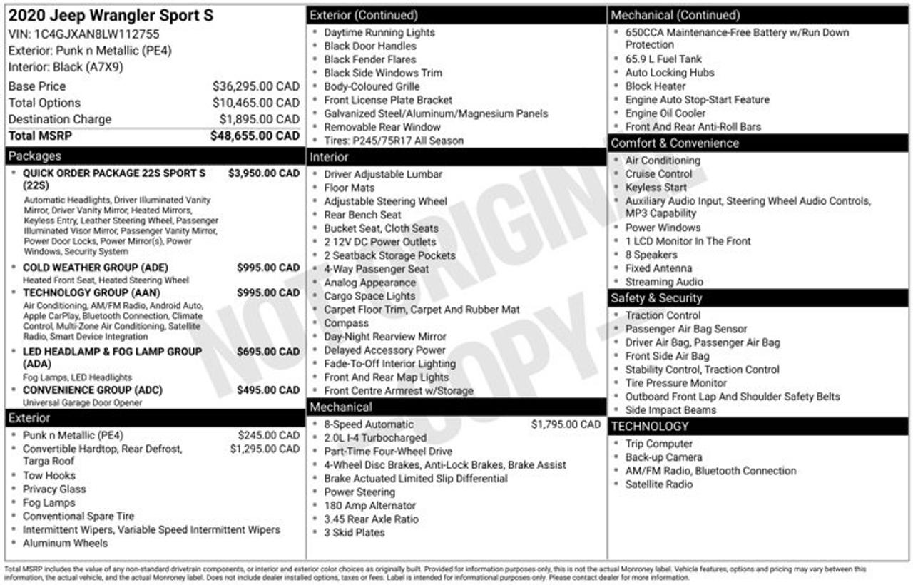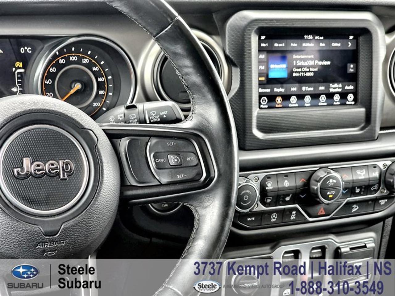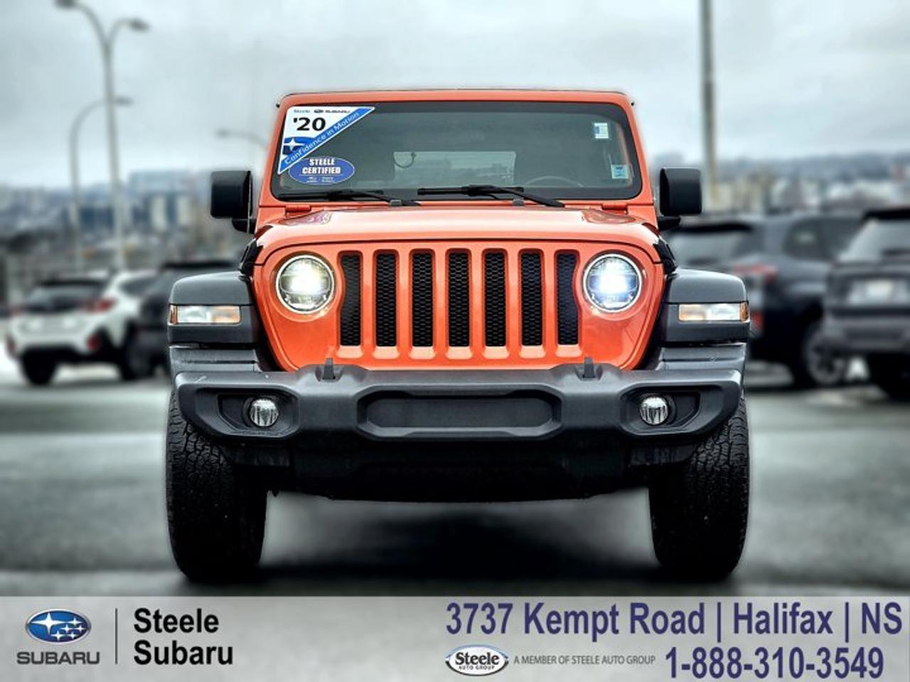 2020 Jeep Wrangler Unlimited | 4x4 Capability | 2.0L Turbo | Backup Camera | Removable TopTackling the winding South Shore between Mahone Bay and Lunenburg or heading off the beaten path for weekend camping in the Valley is what this iconic 4x4 was built for. It offers the legendary rugged capability and open-air freedom that Atlantic Canadian adventurers crave, perfectly suited for both summer beach runs and heavy winter snow.Powered by a spirited 2.0L turbocharged 4-cylinder engine paired with a robust 8-speed automatic transmission, this Wrangler Unlimited delivers a confident and energetic driving character whether you are navigating Halifax city streets or exploring rugged rural roads. The legendary Command-Trac 4x4 system provides exceptional off-road capability and winter traction confidence, making quick work of everything from spring potholes to icy overpasses. Arriving with a clean Carfax history, this exceptionally capable SUV has been thoroughly prepped for its next owner by our factory-trained technicians. It has just passed a strict Nova Scotia Motor Vehicle Inspection and received a comprehensive service that includes a fresh oil and filter change, a four-wheel alignment, new main and auxiliary batteries, a key fob battery replacement, as well as brand new front brake pads and rotors alongside a complete rear brake service. It is a highly versatile, road-ready companion that brings uncompromising utility and legendary Jeep heritage to your everyday driving routine.Performance & Safety* 2.0L turbocharged 4-cylinder engine with Engine Stop/Start* 8-speed automatic transmission* Command-Trac part-time 4x4 system* Electronic Stability Control with Electronic Roll Mitigation* ParkView rear backup camera* 4-wheel anti-lock braking system with fresh front brakes and rotorsComfort & Tech* Durable cloth seating surfaces* Uconnect infotainment system with touchscreen display* Bluetooth hands-free phone and audio connectivity* Push-button start* Air conditioning with manual climate control* Iconic removable roof and doors for open-air drivingReach out to the friendly team at Steele Subaru in Halifax to schedule a test drive today. Whether you are looking for a highly capable daily commuter or want to get road-ready before exploring the Cape Breton Highlands this summer, this Jeep Wrangler is prepared for the journey.STEELE CERTIFIEDThis vehicle is Steele Certified, having successfully passed a comprehensive 85-Point Inspection to ensure quality and peace of mind. A current service and Nova Scotia Motor Vehicle Inspection (MVI) has been completed, so it's ready for the road. We also provide a Carfax Vehicle History Report for full transparency. Buy with confidence knowing this vehicle has been thoroughly checked by our factory-trained technicians. Trade-ins are always welcome, and we're here to help make your next vehicle purchase smooth and worry-free.Ask us about flexible financing or extended warranty options.CARFAX Canada Low Kilometer All Wheel Drive, 8 Speakers, A/C w/Automatic Temperature Control, Apple CarPlay Capable, Automatic Headlamps, Black Freedom Top 3-Piece Hardtop, Cold Weather Group, Convenience Group, Dual front impact airbags, Dual front side impact airbags, Electronic Stability Control, Front Heated Seats, Google Android Auto, Heated Steering Wheel, Integrated roll-over protection, LED Fog Lamps, LED Headlamp & Fog Lamp Group, LED Reflector Headlamps, ParkView Rear Back-Up Camera, Quick Order Package 22S Sport S, Radio: Uconnect 4 w/7" Display, Rear Window Defroster, Technology Group, Telescoping steering wheel, Tilt steering wheel, Universal Garage Door Opener, Wheels: 17" x 7.5" Low-Gloss Black Steel.