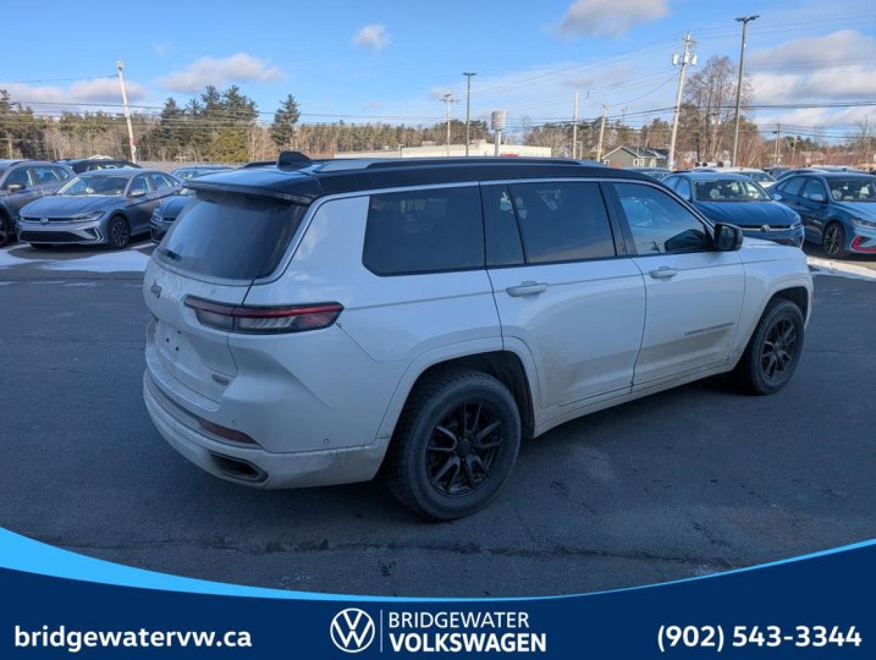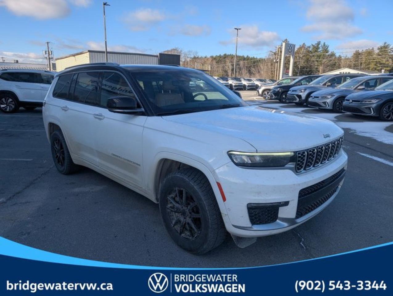 New Price! Bright White Clearcoat 2021 Jeep Grand Cherokee L Summit Apple CarPlay | Android Auto | Sirus XM | Steele Certified 4WD 8-Speed Automatic Pentastar 3.6L V6 VVT Bridgewater Volkswagen, Located in Bridgewater Nova Scotia.10 Speakers, 19 Speaker McIntosh Audio System, 2nd Row Manual Window Shades, 3.45 Rear Axle Ratio, 3rd row seats: split-bench, 4-Wheel Disc Brakes, ABS brakes, Adaptive suspension, Air Conditioning, Air Suspension Delete Credit, Alloy wheels, AM/FM radio: SiriusXM w/360L, Anti-whiplash front head restraints, Apple CarPlay/Android Auto, Audio memory, Auto High-beam Headlights, Auto-dimming door mirrors, Auto-dimming Rear-View mirror, Automatic temperature control, Block heater, Brake assist, Bumpers: body-colour, Compass, Delay-off headlights, Driver door bin, Driver vanity mirror, Dual front impact airbags, Dual front side impact airbags, Electronic Stability Control, Four wheel independent suspension, Front anti-roll bar, Front Bucket Seats, Front dual zone A/C, Front fog lights, Front reading lights, Fully automatic headlights, Garage door transmitter, Genuine wood dashboard insert, Genuine wood door panel insert, Heated door mirrors, Heated front seats, Heated rear seats, Heated steering wheel, Illuminated entry, Knee airbag, Leather steering wheel, Low tire pressure warning, Luxury Tech Group V, Memory seat, Nappa Leather-Faced Seats, Navigation System, Normal Duty Suspension, Occupant sensing airbag, Outside temperature display, Overhead airbag, Overhead console, Panic alarm, Passenger door bin, Passenger vanity mirror, Power door mirrors, Power driver seat, Power Liftgate, Power moonroof: CommandView, Power passenger seat, Power steering, Power windows, Quick Order Package 22S Summit, Radio data system, Radio: Uconnect 5 Nav w/10.1" Display, Rain sensing wipers, Rear air conditioning, Rear anti-roll bar, Rear dual zone A/C, Rear reading lights, Rear window defroster, Rear window wiper, Reclining 3rd row seat, Remote keyless entry, Roof rack: rails only, Security system, Speed control, Speed-Sensitive Wipers, Split folding rear seat, Spoiler, Steering wheel memory, Steering wheel mounted audio controls, Tachometer, Telescoping steering wheel, Tilt steering wheel, Traction control, Trailer Hitch Zoom, Trailer Tow Prep Group, Trip computer, Turn signal indicator mirrors, Variably intermittent wipers, Ventilated front seats, Voltmeter, Wheels: 20" x 8.5" Fully Polished Aluminum, Wireless Charging Pad.Certification Program Details: 150 Points Inspection Fresh Oil Change Free Carfax Full Detail 2 years MVI Full Tank of Gas The 150+ point inspection includes: Engine Instrumentation Interior components Pre-test drive inspections The test drive Service bay inspection Appearance Final inspection
