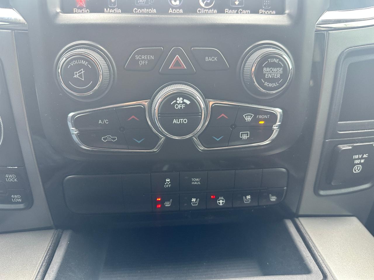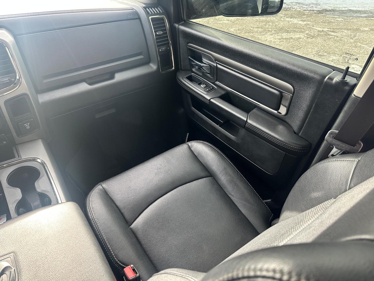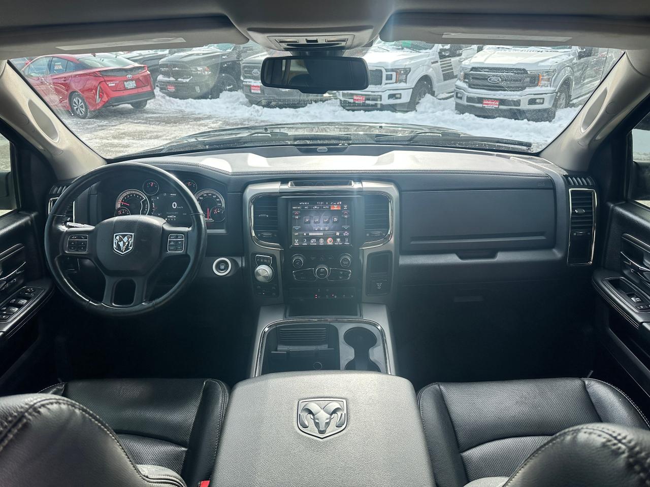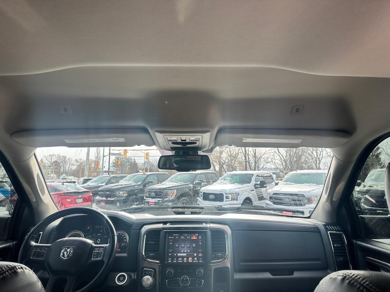 Super-Clean and well-optioned local trade-in RAM 1500 from Bowmanville, ON! This RAM 4x4 Sport model looks sharp in its Black paint and factory alloy wheels! The exterior features keyless entry with remote start and proximity key, automatic headlights, foglights, black tow-style mirrors with integrated turn signals, tinted privacy glass, sporty dual rear exhaust, a trailer hitch, spray-in bedliner, gorgeous factory polished alloy wheels and NEW All-Season tires, a powerful 5.7L V8 Engine and Automatic transmission driving the 4x4 system! The interior is clean and comfortable with Heated and Cooled front Leather Seats with power adjustment and lumbar controls, spacious rear seating, all-weather floor mats, power door locks, windows and mirrors, a heated leather-wrapped steering wheel with Audio and Cruise controls, push-button start and electronic 4x4 selection buttons, an easy-to-read and use gauge cluster, a large central touch screen AM/FM/XM Satellite Radio with Premium ALPINE Audio, Navigation, Bluetooth, and Backup Camera, Dual-Zone A/C climate controls with font andrear window defrost settings, Tow/Haul mode, USB/AUX/12V accessory ports and more!