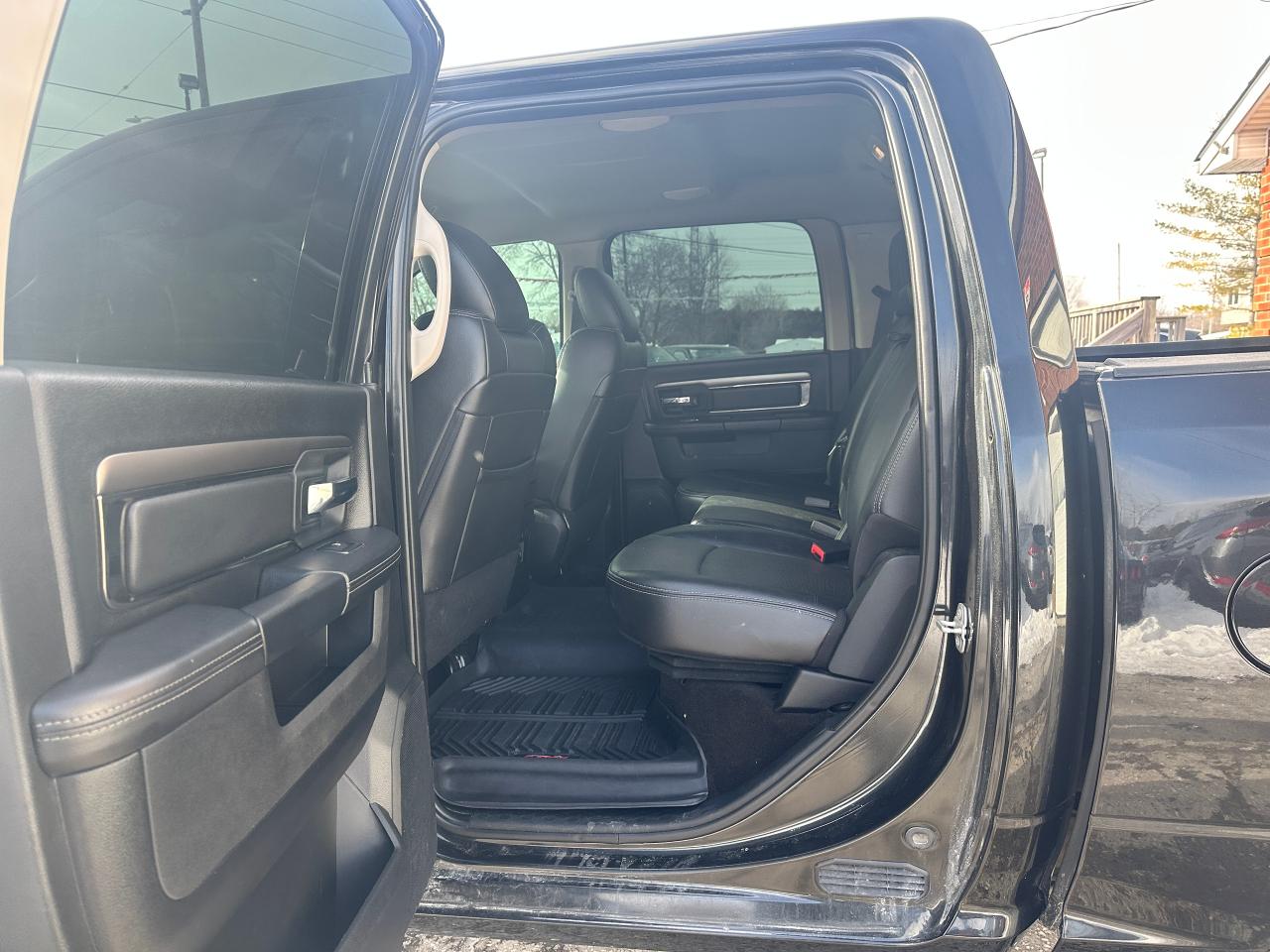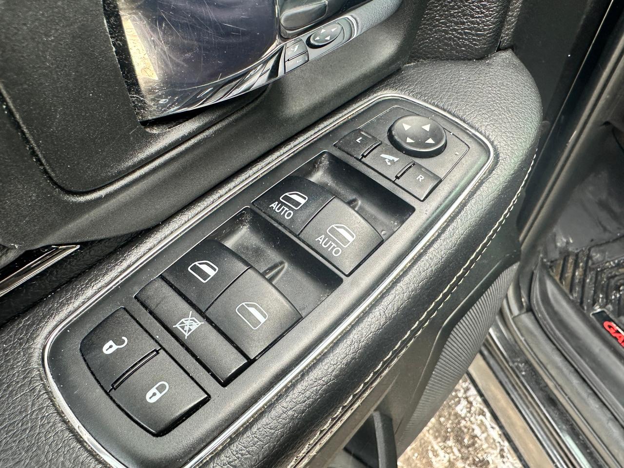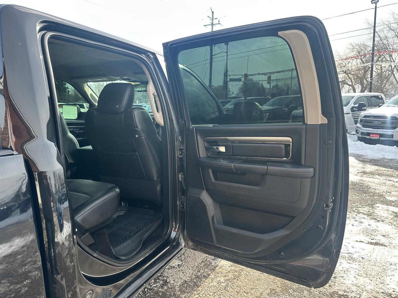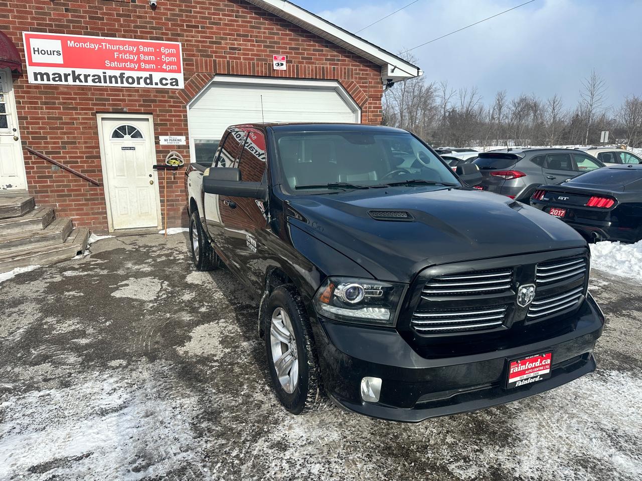 Super-Clean and well-optioned local trade-in RAM 1500 from Bowmanville, ON! This RAM 4x4 Sport model looks sharp in its Black paint and factory alloy wheels! The exterior features keyless entry with remote start and proximity key, automatic headlights, foglights, black tow-style mirrors with integrated turn signals, tinted privacy glass, sporty dual rear exhaust, a trailer hitch, spray-in bedliner, gorgeous factory polished alloy wheels and NEW All-Season tires, a powerful 5.7L V8 Engine and Automatic transmission driving the 4x4 system! The interior is clean and comfortable with Heated and Cooled front Leather Seats with power adjustment and lumbar controls, spacious rear seating, all-weather floor mats, power door locks, windows and mirrors, a heated leather-wrapped steering wheel with Audio and Cruise controls, push-button start and electronic 4x4 selection buttons, an easy-to-read and use gauge cluster, a large central touch screen AM/FM/XM Satellite Radio with Premium ALPINE Audio, Navigation, Bluetooth, and Backup Camera, Dual-Zone A/C climate controls with font andrear window defrost settings, Tow/Haul mode, USB/AUX/12V accessory ports and more!
