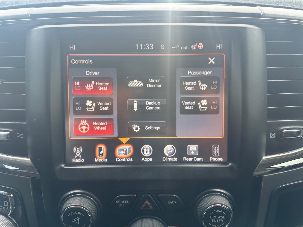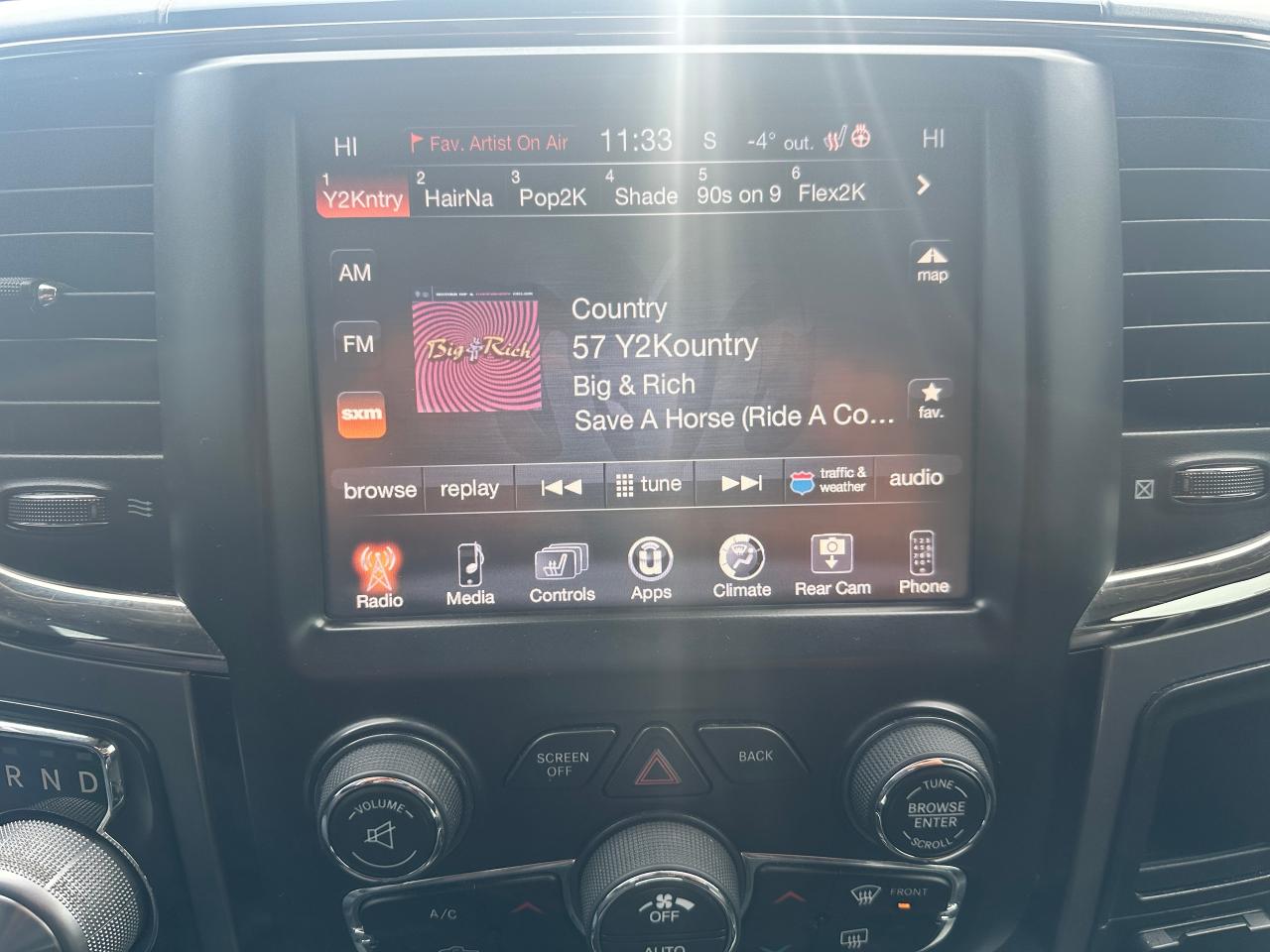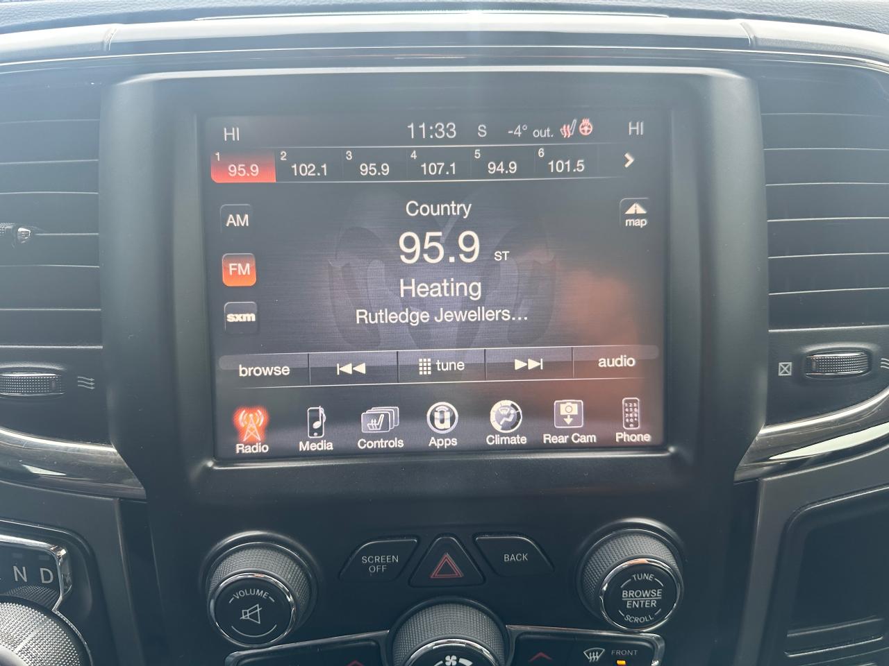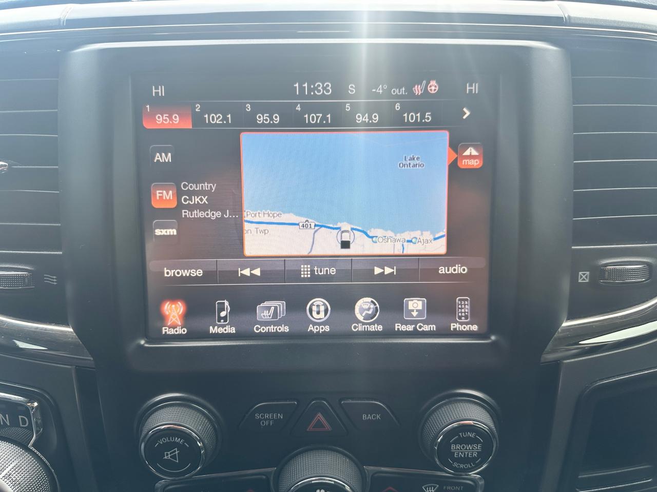 Super-Clean and well-optioned local trade-in RAM 1500 from Bowmanville, ON! This RAM 4x4 Sport model looks sharp in its Black paint and factory alloy wheels! The exterior features keyless entry with remote start and proximity key, automatic headlights, foglights, black tow-style mirrors with integrated turn signals, tinted privacy glass, sporty dual rear exhaust, a trailer hitch, spray-in bedliner, gorgeous factory polished alloy wheels and NEW All-Season tires, a powerful 5.7L V8 Engine and Automatic transmission driving the 4x4 system! The interior is clean and comfortable with Heated and Cooled front Leather Seats with power adjustment and lumbar controls, spacious rear seating, all-weather floor mats, power door locks, windows and mirrors, a heated leather-wrapped steering wheel with Audio and Cruise controls, push-button start and electronic 4x4 selection buttons, an easy-to-read and use gauge cluster, a large central touch screen AM/FM/XM Satellite Radio with Premium ALPINE Audio, Navigation, Bluetooth, and Backup Camera, Dual-Zone A/C climate controls with font andrear window defrost settings, Tow/Haul mode, USB/AUX/12V accessory ports and more!