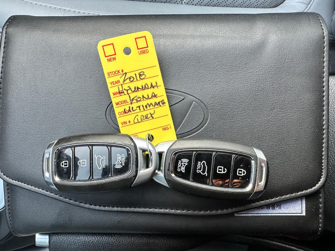 Super-Clean well equipped Hyundai KONA from Lindsay, ON! This Ultimate AWD model looks great in its Grey paint and factory alloy wheels, with fantastic options inside and out! The exterior features keyless entry with proximity keys, a large factory power sunroof, automatic headlights, foglights, colour-matched side mirrors with integrated turn signals, tinted privacy glass, parking sensors, blind spot monitor, lane-keeping assist, roof rack rails, gorgeous factory split spoke alloy wheels with NEW All-Season Tires installed, a sleek rear spoiler, peppy fuel efficient 1.6L 4-cylinder Turbocharged engine and Automatic transmission! The interior is clean and comfortable with heated front leather seating, driver power adjustment and lumbar control, spacious rear seating and cargo area with privacy shade, power door locks, windows and mirrors, heated leather-wrapped steering wheel with audio and cruise controls, easy to read and use gauge cluster, drivers Heads-Up-Display, push-button start, a large central touch screen AM/FM/XM Satellite HD Radio with Bluetooth, Navigation, Apple CarPlay, Android Auto, and Backup Camera, A/C climate control with front and rear window defrost settings, Wireless device charger, USB/AUX/12V accessory ports, multiple drive modes including ECO and Sport mode, hill descent assist, universal garage door opener, and more!