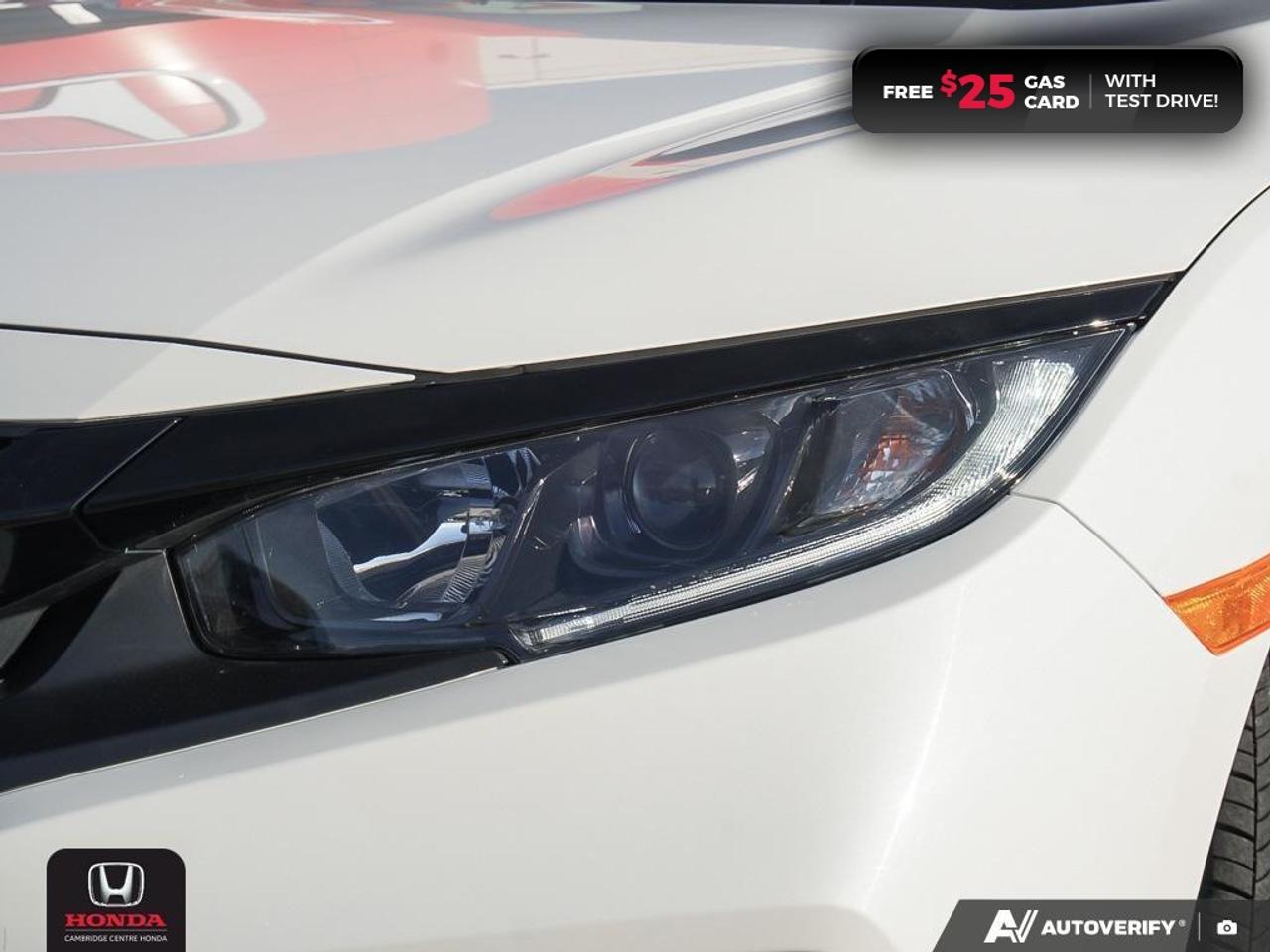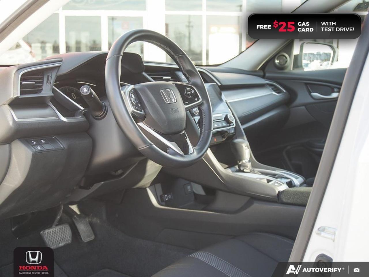 2021 Honda Civic EX featuring CVT transmission, five passenger seating, power sunroof, remote engine starter, rearview camera with dynamic guidelines, Apple CarPlay and Android Auto connectivity, Siri® Eyes Free compatibility, ECON mode, Bluetooth, AM/FM audio system with two USB inputs, steering wheel mounted controls, cruise control, air conditioning, dual climate zones, heated front seats, 12V power outlet, power mirrors, power locks, power windows, 60/40 split fold-down rear seatback, Anchors and Tethers for Children (LATCH), The Honda Sensing Technologies - Adaptive Cruise Control, Forward Collision Warning system, Collision Mitigation Braking system, Lane Departure Warning system, Lane Keeping Assist system and Road Departure Mitigation system, remote keyless entry with trunk release, auto on/off headlights, electronic stability control and anti-lock braking system. Contact Cambridge Centre Honda for special discounted finance rates, as low as 8.99%, on approved credit from Honda Financial Services.