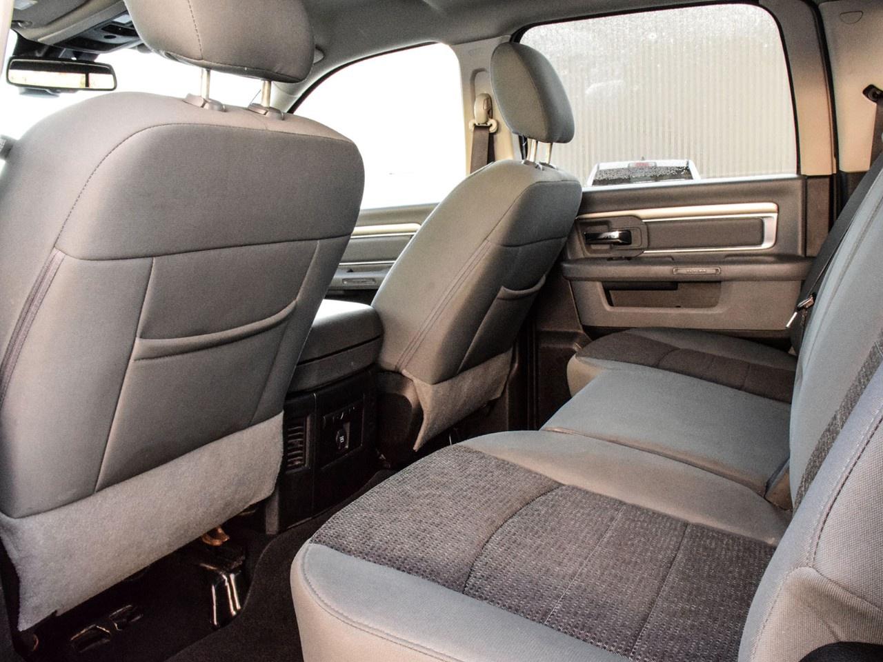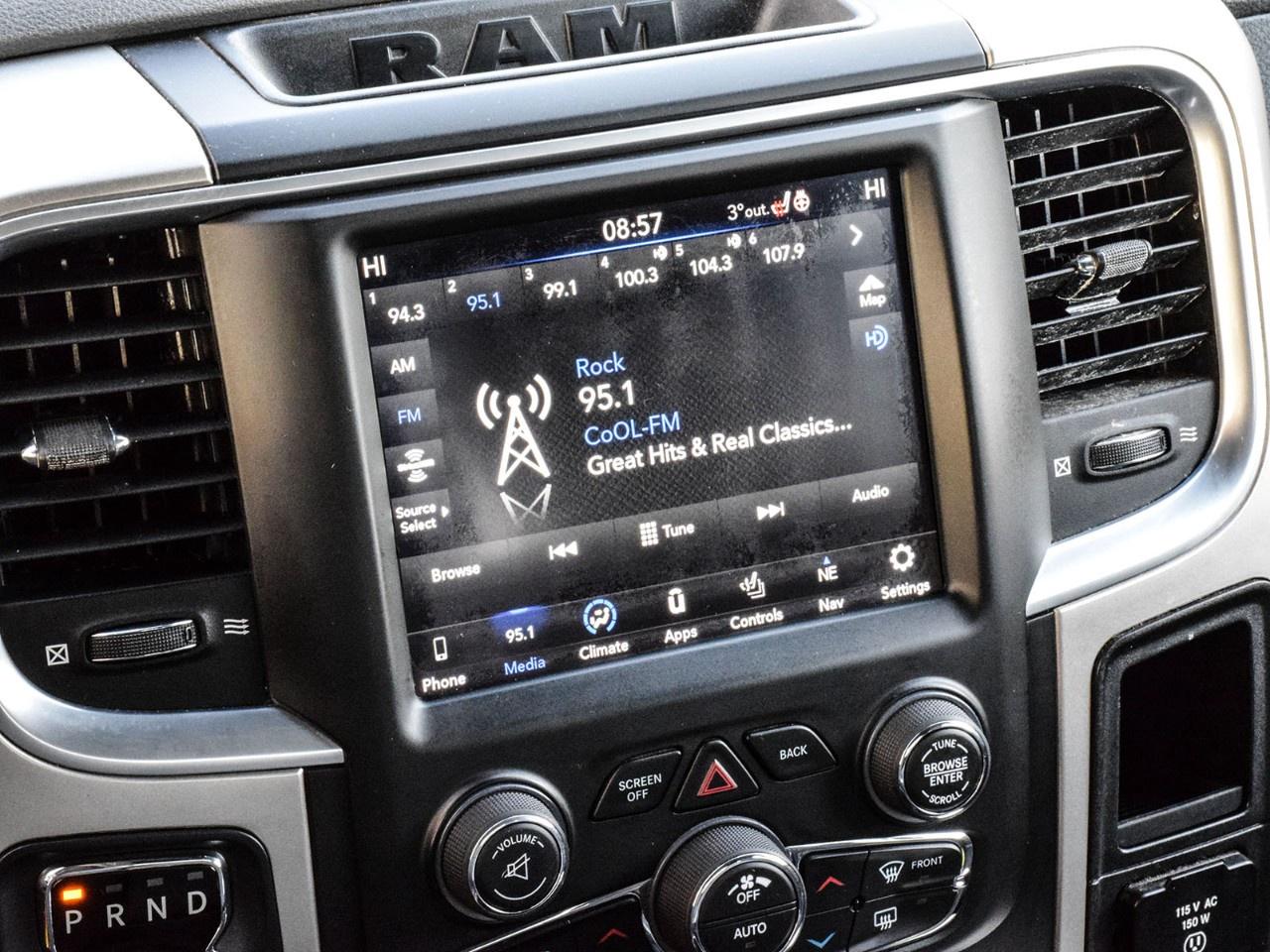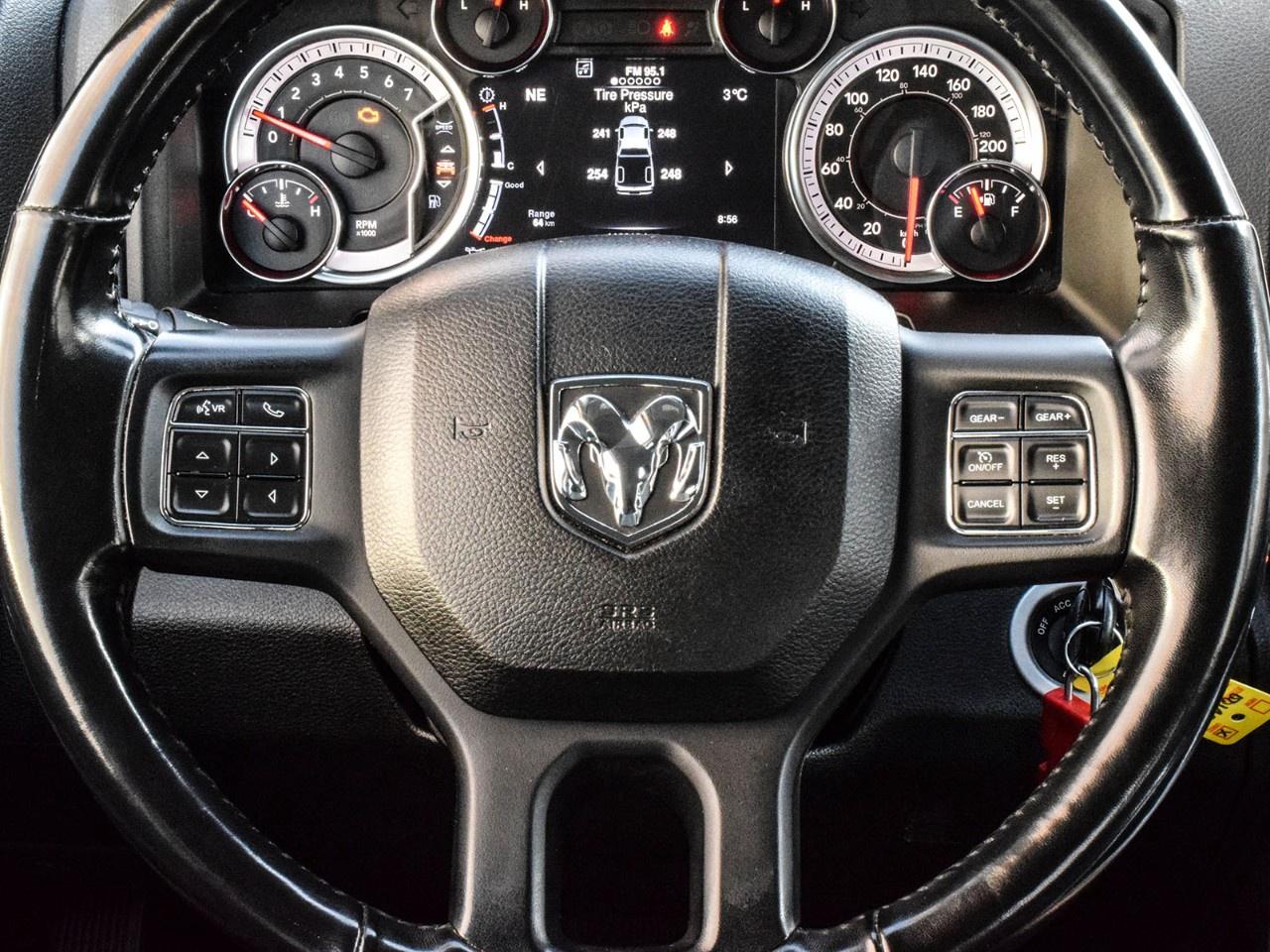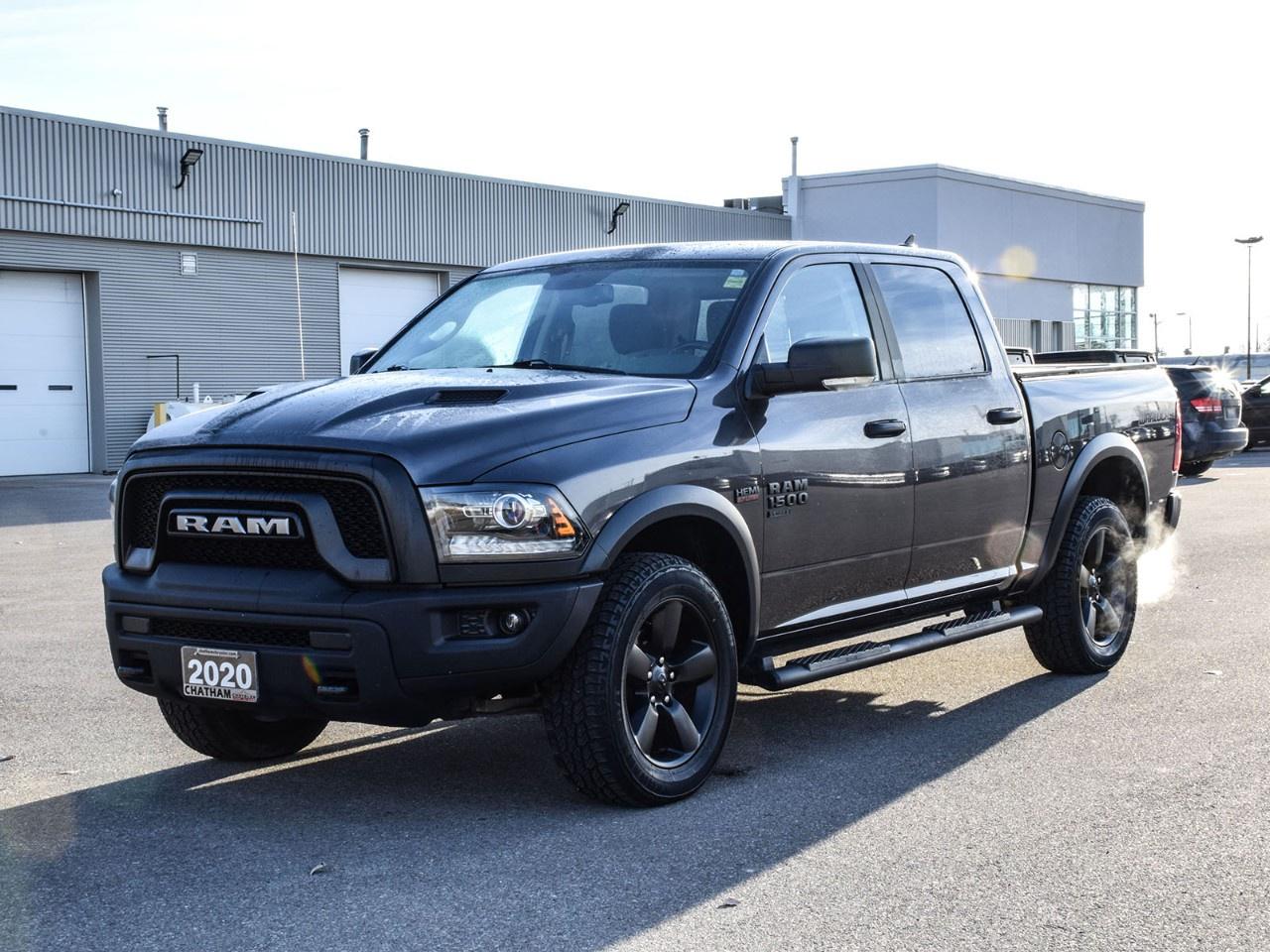 2020 Ram 1500 Classic 4D Crew Cab Warlock Granite Crystal Metallic Clearcoat **ONE OWNER**, 115-Volt Auxiliary Power Outlet, 7''' Colour In-Cluster Display, 8.4''' Touchscreen, Air Conditioning, Alloy wheels, Apple CarPlay Capable, Auto-Dimming Exterior Driver Mirror, Auto-Dimming Rear-View Mirror, Bi-Function Halogen Projector Headlamps, Black 4x4 Badge, Black Exterior Badging, Black Grille w/RAM Lettering, Black Headlamp Filler Panel, Black Powder-Coated Front Bumper, Black Powder-Coated Rear Bumper, Black Power Fold Heated Mirrors w/Signals, Black RAM's Head Tailgate Badge, Black Tubular Side Steps, Black Wheel Flares, Brake assist, Bucket Seats, Class IV Hitch Receiver, Dedicated Daytime Running Lights, Delay-off headlights, Dual Rear Exhaust w/Bright Tips, Electronic Stability Control, Exterior Mirrors w/Courtesy Lamps, Exterior Mirrors w/Turn Signals, Flat Load Floor, Front Heated Seats, Front Wheel Well Liners, Full-Length Upgraded Floor Console, Fully automatic headlights, Glove Box Lamp, Google Android Auto, GPS Antenna Input, GPS Navigation, Hands-Free Comm w/Bluetooth, HD Radio, Heated Seats & Wheel Group, Heated Steering Wheel, Humidity Sensor, Leather-Wrapped Steering Wheel, LED Bed Lighting, LED Fog Lamps, Luxury Group, Media Hub w/2 USB & Aux Input Jack, ORT License Plate Bracket, Overhead Console/Garage Door Opener, Park-Sense Rear Park Assist System, ParkView Rear Back-Up Camera, Power 10-Way Driver Seat w/Lumbar, Power Folding Exterior Mirrors, Power Lumbar Adjust, Premium Cloth Front Bucket Seats (DISC), Quick Order Package 27F Warlock, Radio: Uconnect 4C Nav w/8.4''' Display, Rear 60/40 Split-Folding Bench Seat, Rear Dome Lamp w/On/Off Switch, Rear Floor Mats, Rear Heavy-Duty Shock Absorbers, Remote Start & Security Alarm Group, Remote USB Charging Port, Security Alarm, Semi-Gloss Black Wheel Centre Hub, SiriusXM Satellite Radio, SiriusXM Traffic, SiriusXM Travel Link, Sport Performance Hood, Sport Performance Hood Decal, Sport Tail Lamps, Spray-In Bedliner, Steering Wheel-Mounted Audio Controls, Sun Visors w/Illuminated Vanity Mirrors, Tow Hooks, Traction control, Universal Garage Door Opener, USB Mobile Projection, Warlock Decal, Warlock Package, Wheels: 20''' x 8''' Semi-Gloss Black Aluminum. 4WD HEMI 5.7L V8 VVT 8-Speed Automatic