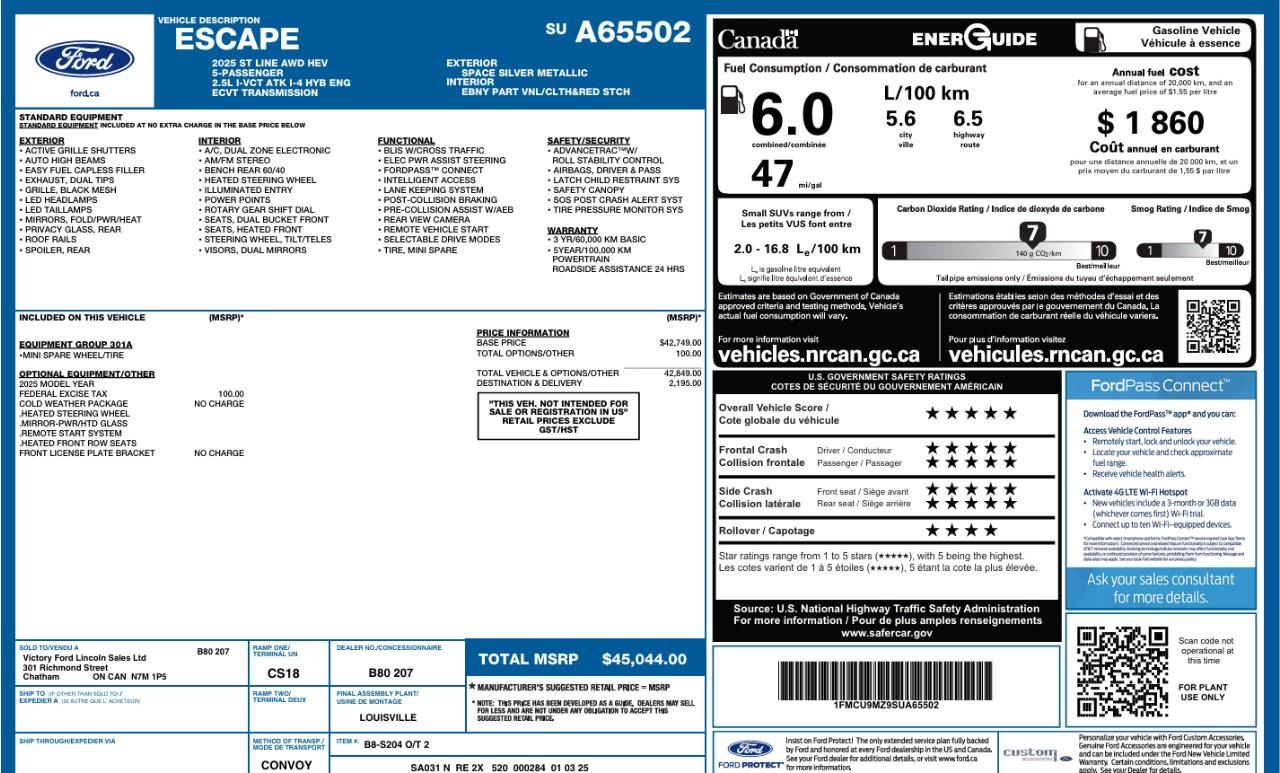 This 2025 Ford Escape ST-Line AWD Hybrid delivers the perfect combination of fuel efficiency, sporty styling, and everyday versatility. With the 301A Equipment Group, intelligent all-wheel drive, and the Cold Weather Package, this Escape is designed to handle Canadian conditions while keeping you comfortable, connected, and confident on every drive.