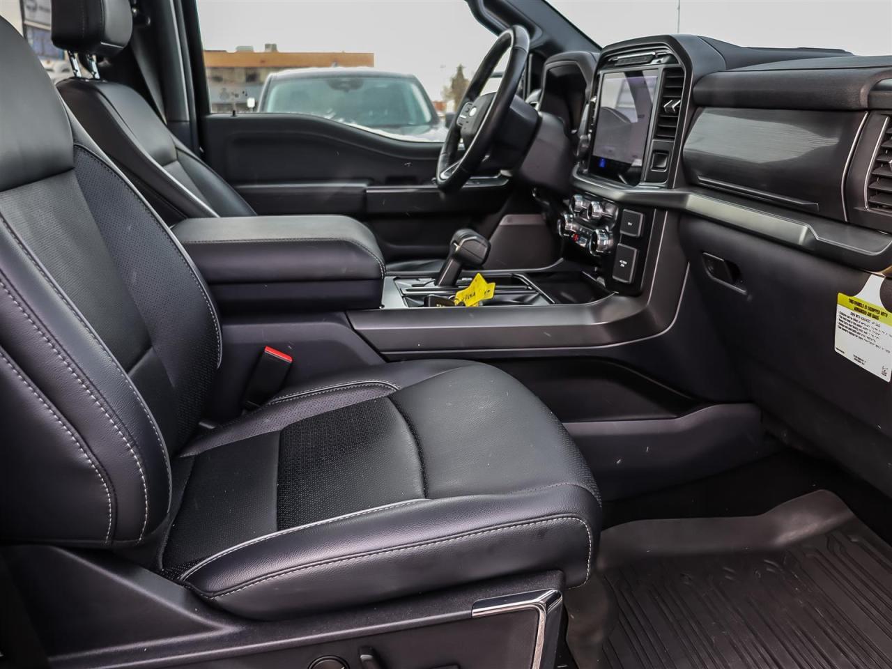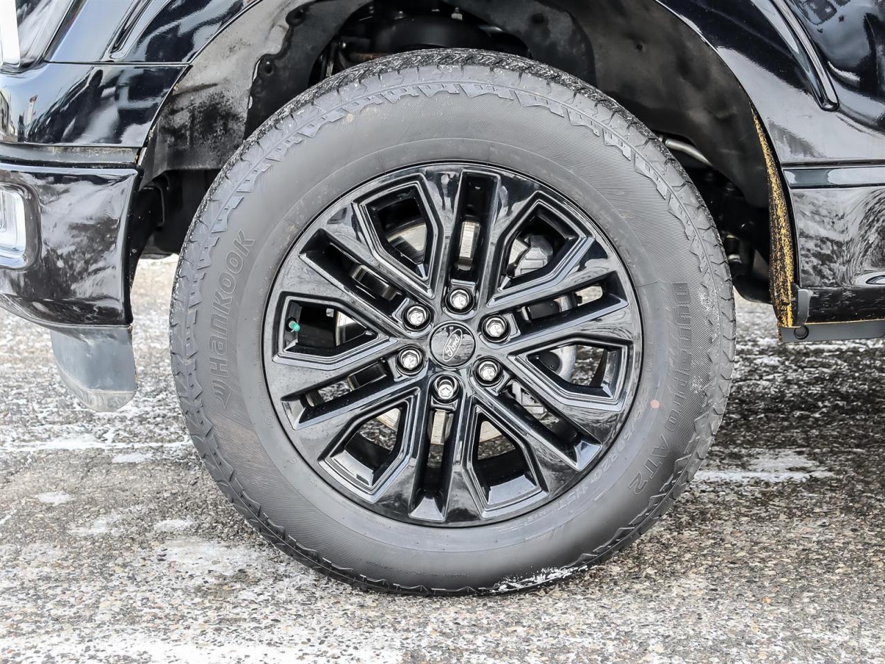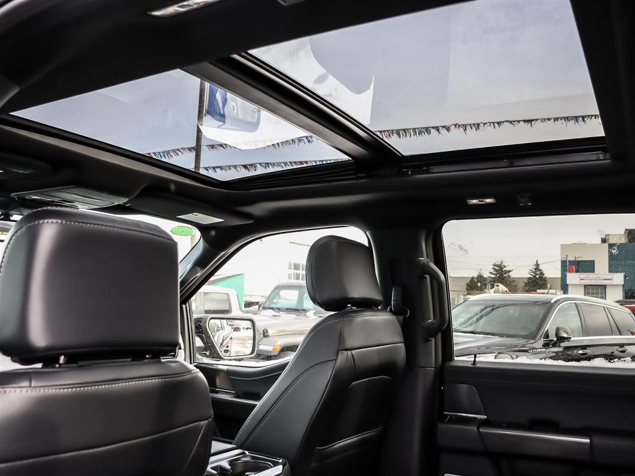 Alloy wheels, Black Exterior Badging, Black Grille, Black Taillamp Bezels, Body-Colour Door Handles & Mirror Caps, Body-Colour Front & Rear Bumpers, Dark Interior Appliques, Dual Exhaust w/Black Tips, Equipment Group 501A Standard, Garage door transmitter, Grey Box Side Decal, Heated front seats, Heated steering wheel, Lariat Black Appearance Package, Leather-Trimmed Bucket Seats, Matte Black Tailgate F-150 Decal, Memory seat, Navigation system: Connected Navigation, Panic alarm, Pedal memory, Power driver seat, Power passenger seat, Power windows, Remote keyless entry, Security system, Steering wheel memory, SYNC 4 w/Enhanced Voice Recognition, Telescoping steering wheel, Tilt steering wheel, Tough Bed Spray-In Bedliner, Twin Panel Moonroof, Ventilated front seats, Wheels: 20''' Gloss Black Painted Aluminum.