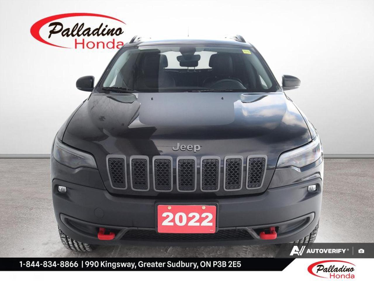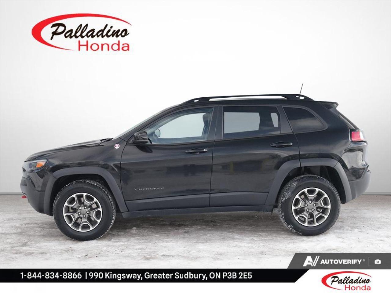 This 2022 Jeep Cherokee Trailhawk pairs a 9-speed automatic transmission with Active Drive and 4-wheel drive for steady control in changing Northern Ontario conditions. From city streets to cottage roads