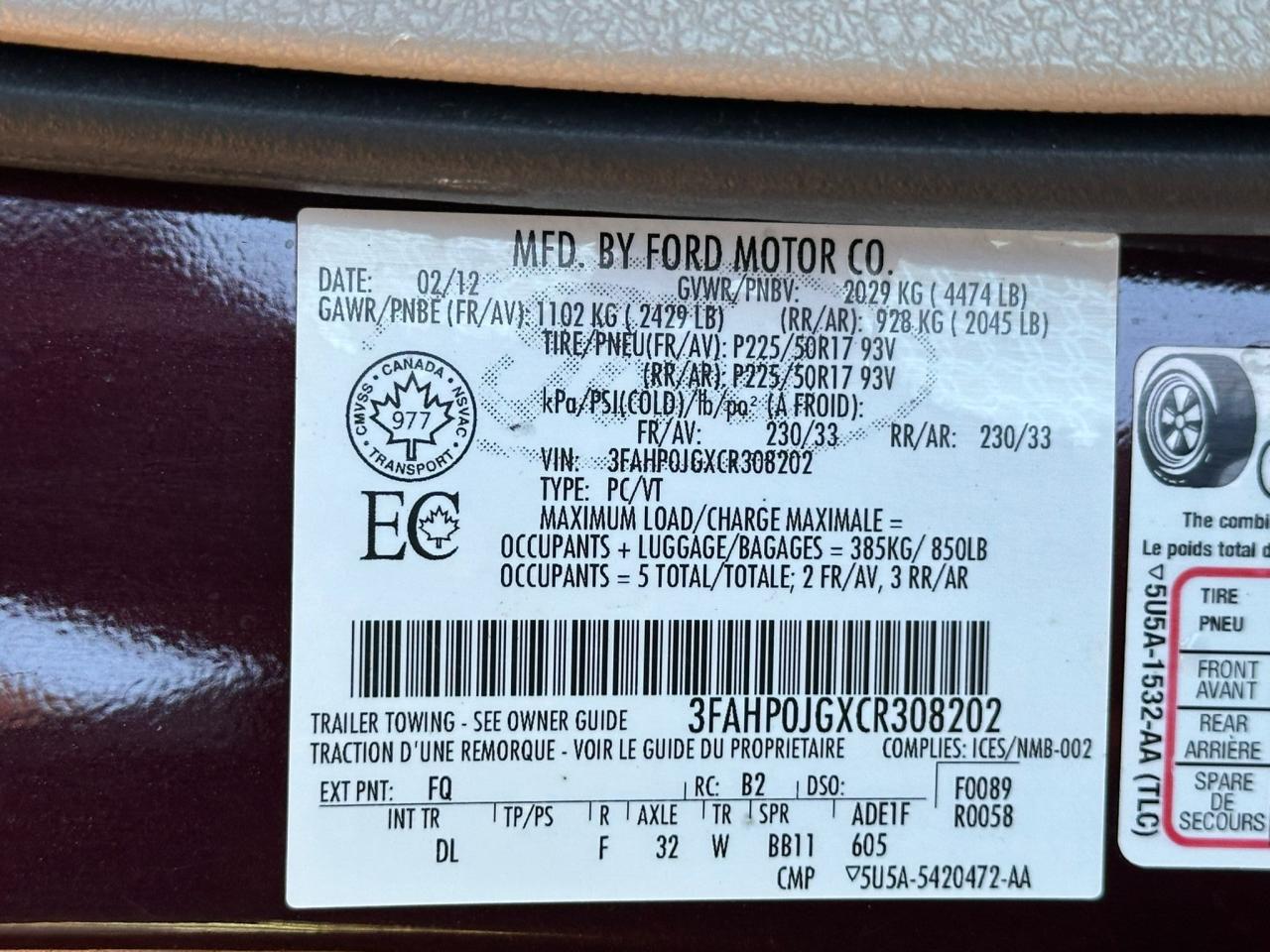 - VIN: 3FAHP0JGXCR308202