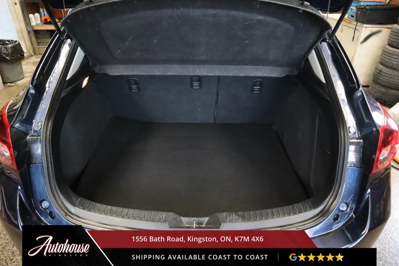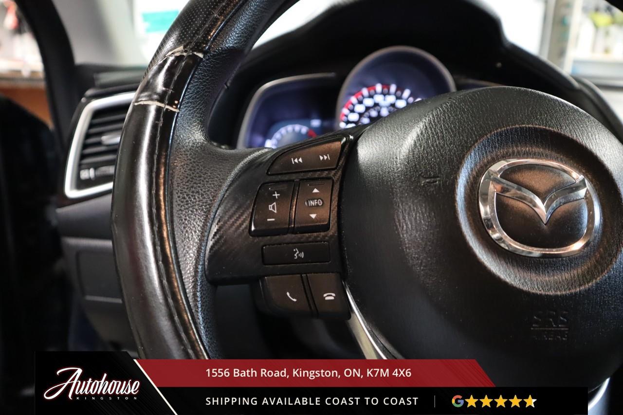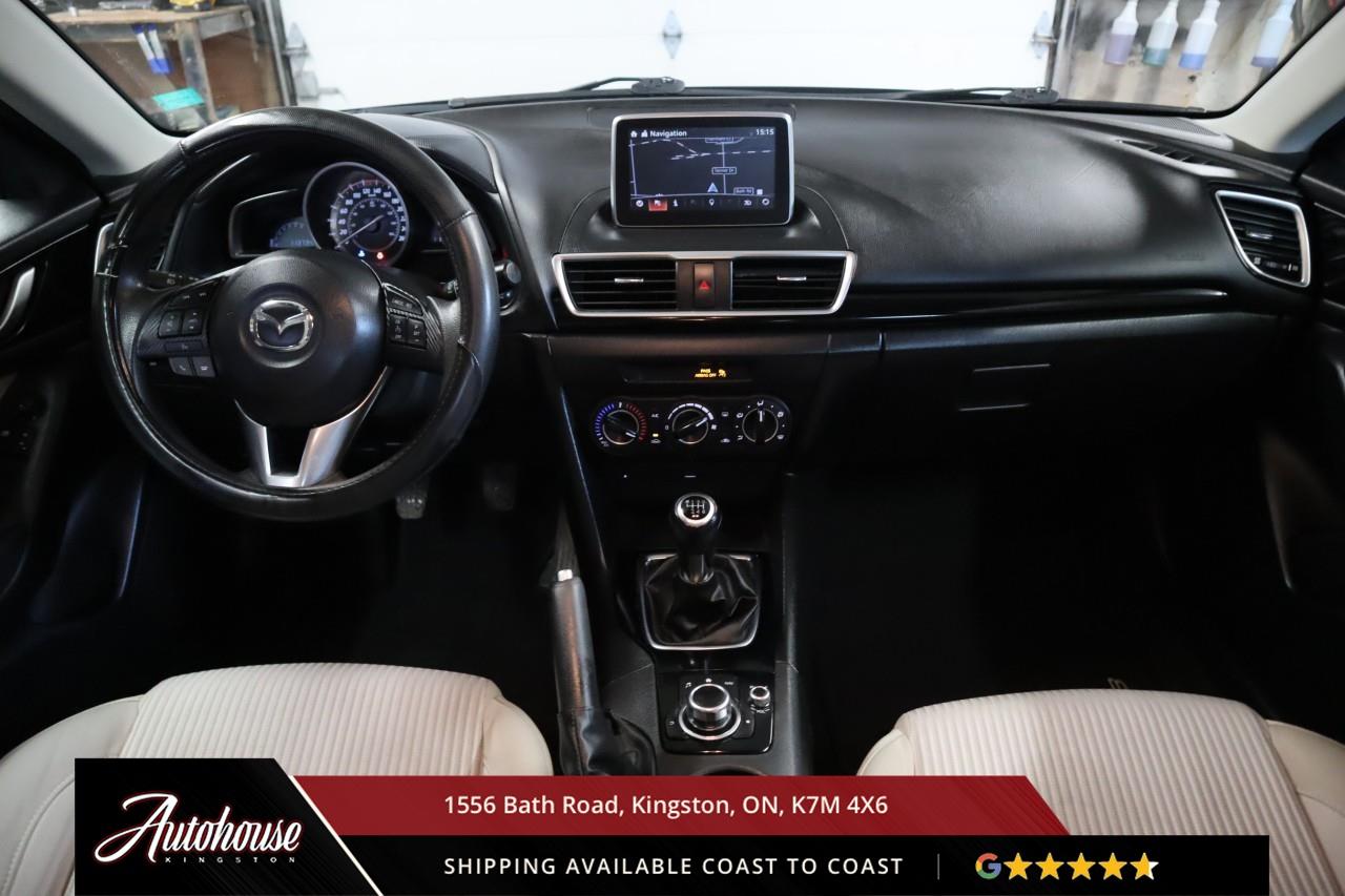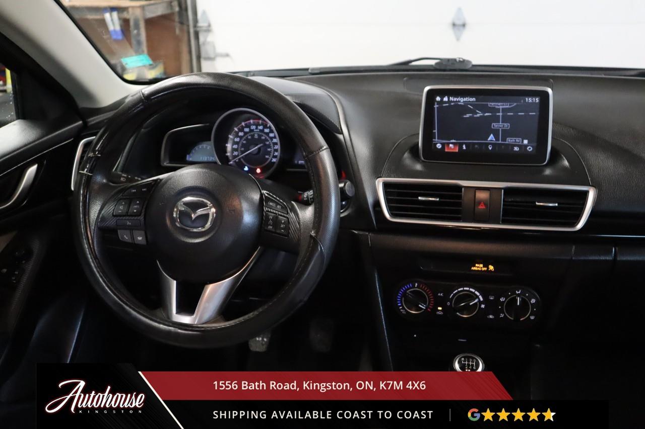 The 2015 Mazda3 GS Featuring a 2.0-liter Skyactiv-G inline-4 delivering a 6-speed manual transmission achieving an estimated 8.2 L/100km city and 6.1 L/100km highway fuel efficiency. Premium cloth seating includes heated front seats, 6-way manual driver seat with adjustable lumbar, leather-wrapped steering wheel with audio and cruise controls, push-button start, and Mazda Connect 7-inch touchscreen with Commander control, Bluetooth hands-free phone and audio streaming, USB connectivity, and a 6-speaker audio system. Safety features include Blind Spot Monitoring with Rear Cross Traffic Alert, ABS with electronic brake-force distribution, and advanced front airbags with seat-belt pretensioners. Additional features include keyless entry, 60/40 split-folding rear seats and so much more!