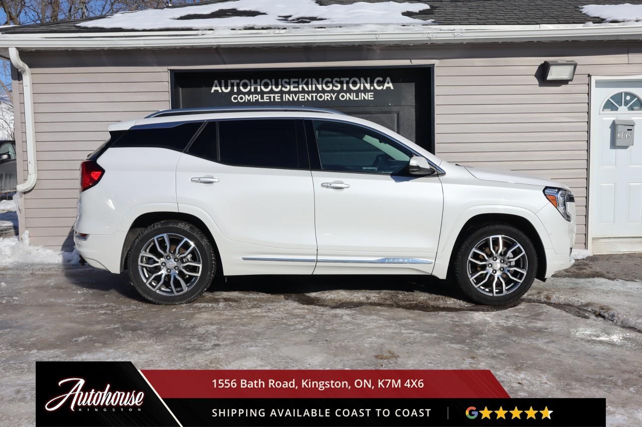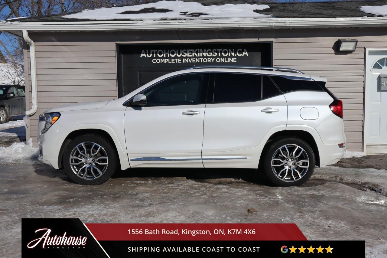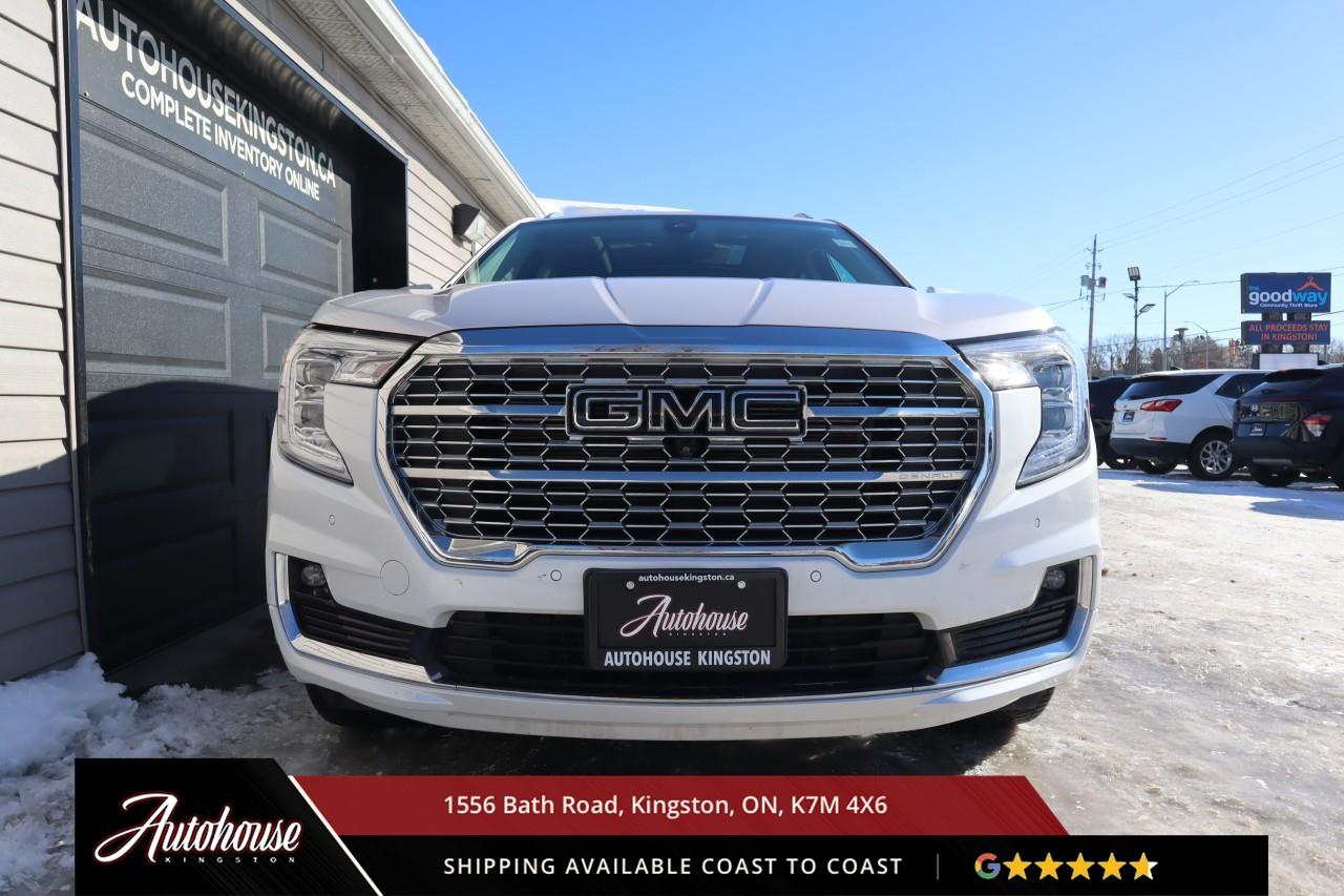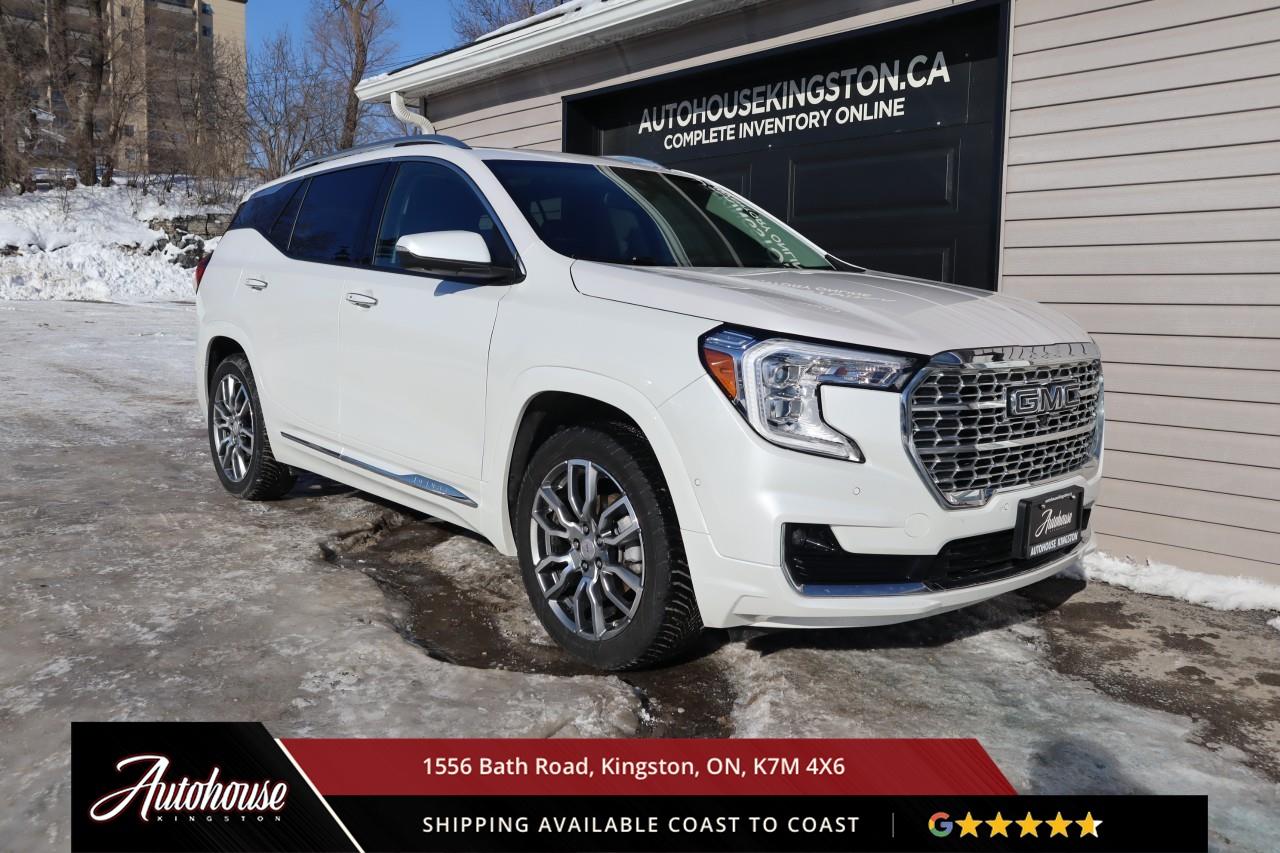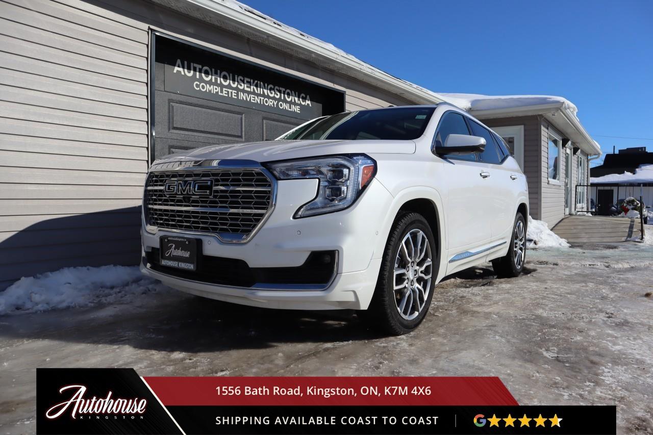 This 2023 GMC Terrain Denali AWD is powered by a turbocharged 1.5 L 4-cylinder engine paired with a 9-speed automatic transmission and full All-Wheel Drive, offering with an estimated 9.9 L/100 km city and 8.3 L/100 km highway fuel economy. Heated power-adjustable mirrors with integrated turn signals, panoramic sunroof, and a hands-free power liftgate. The Denali interior offers leather-appointed seating with heated and ventilated front seats, heated rear outboard seats, an 8-way power drivers seat with memory, a heated leather-wrapped steering wheel, and dual-zone automatic climate control with rear vents. Infotainment system with touchscreen display, Apple CarPlay and Android Auto, Bluetooth hands-free phone and navigation, premium Bose audio system, wireless charging, and steering-wheel mounted controls. Safety and driver-assist equipment include a rear-view camera, HD Surround Vision, Blind Zone Alert with Rear Cross Traffic Braking, Forward Collision Alert, Lane Keep Assist with Lane Departure Warning, Adaptive Cruise Control, traction and stability control, and a heads-up display.
