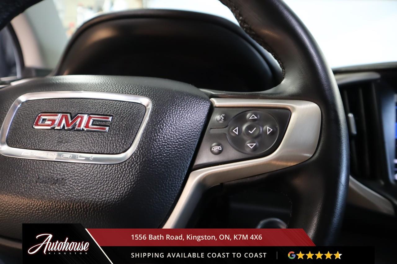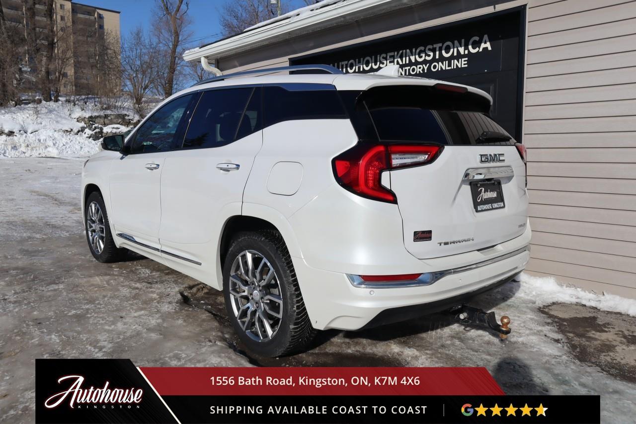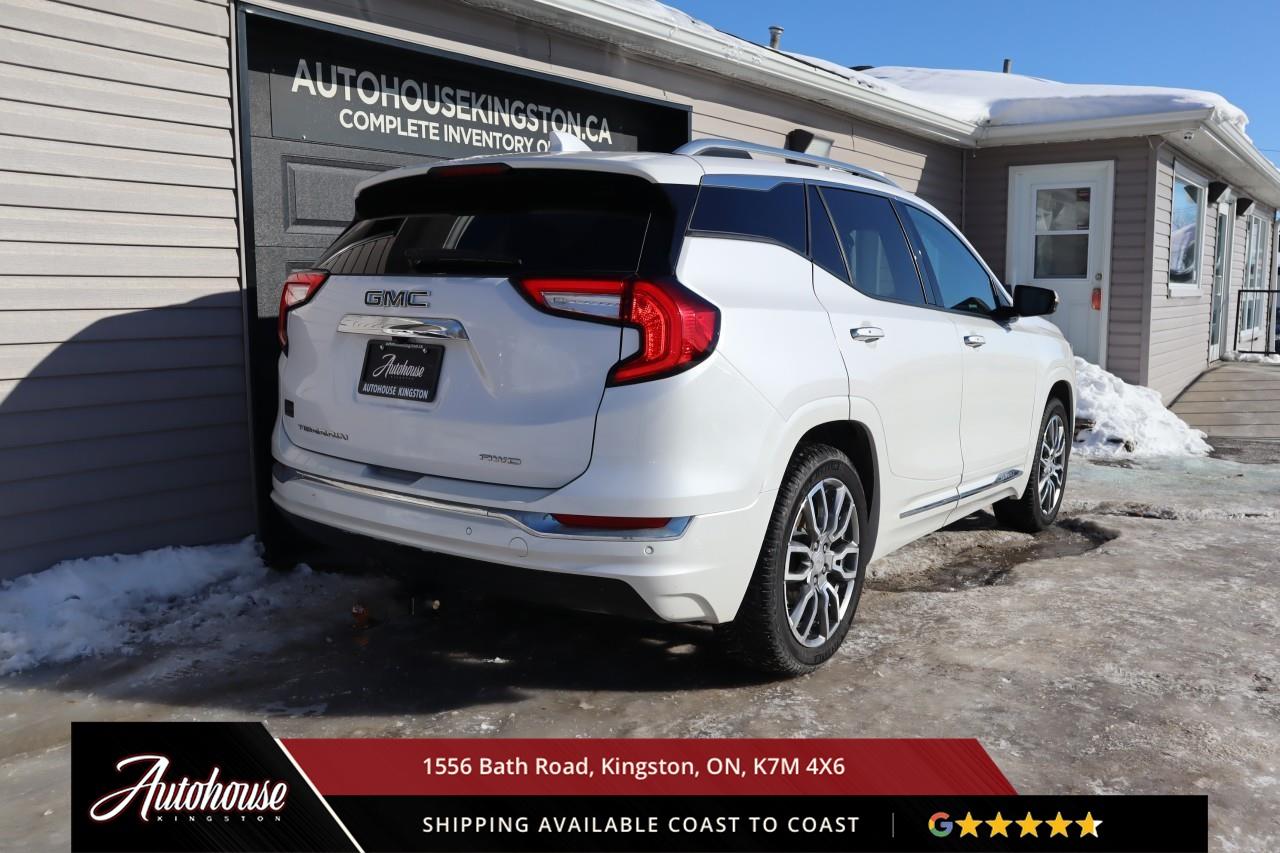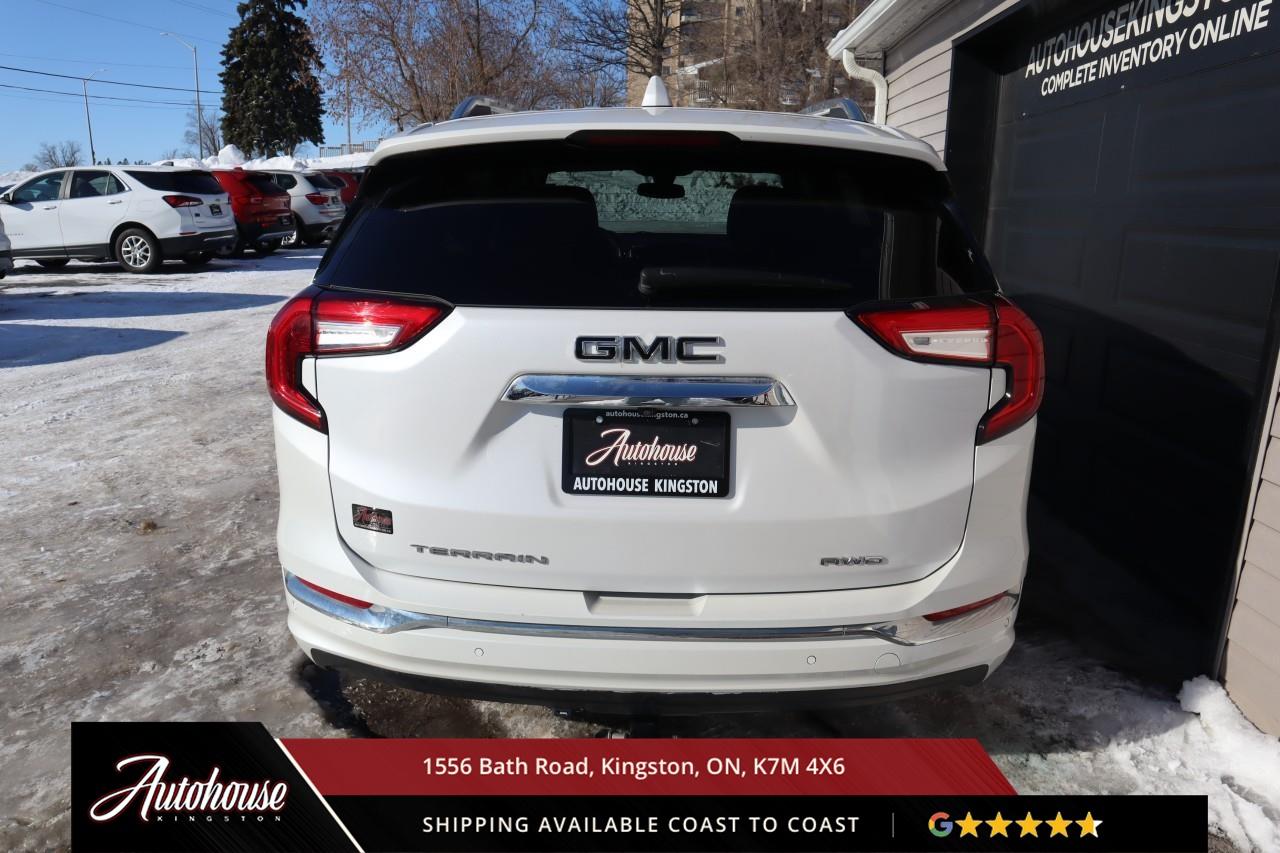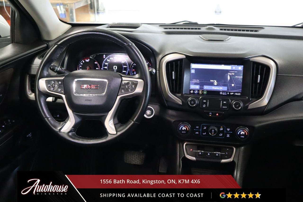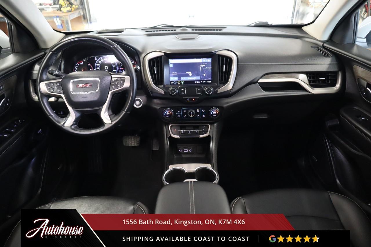 This 2023 GMC Terrain Denali AWD is powered by a turbocharged 1.5 L 4-cylinder engine paired with a 9-speed automatic transmission and full All-Wheel Drive, offering with an estimated 9.9 L/100 km city and 8.3 L/100 km highway fuel economy. Heated power-adjustable mirrors with integrated turn signals, panoramic sunroof, and a hands-free power liftgate. The Denali interior offers leather-appointed seating with heated and ventilated front seats, heated rear outboard seats, an 8-way power drivers seat with memory, a heated leather-wrapped steering wheel, and dual-zone automatic climate control with rear vents. Infotainment system with touchscreen display, Apple CarPlay and Android Auto, Bluetooth hands-free phone and navigation, premium Bose audio system, wireless charging, and steering-wheel mounted controls. Safety and driver-assist equipment include a rear-view camera, HD Surround Vision, Blind Zone Alert with Rear Cross Traffic Braking, Forward Collision Alert, Lane Keep Assist with Lane Departure Warning, Adaptive Cruise Control, traction and stability control, and a heads-up display.