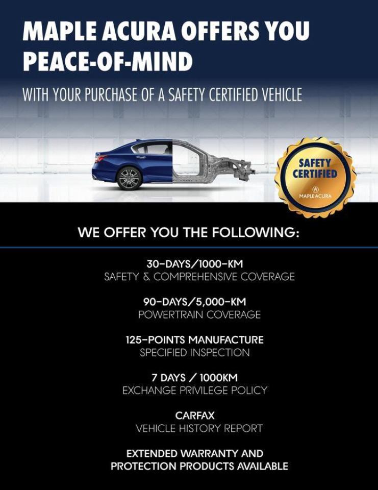 ** All vehicles are all in priced, No additional fees are applied. Buying an used vehicle from Maple Acura is always a safe investment. We know you want to be confident in your choice and we want you to be fully satisfied. Thats why ALL our used vehicles come with our limited warranty peace of mind package included in the price. No questions, no discussion - 30 days or 1,000 km safety related warranty 90 days or 5,000 kilometre powertrain coverage. From the day you pick up your new car you can rest assured that we have you covered.