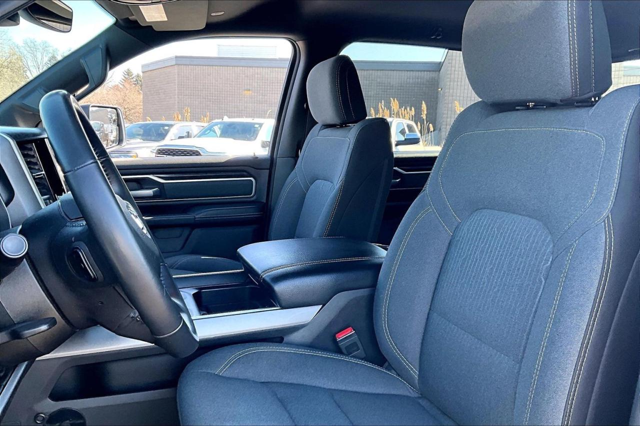 The sweet spot for a do-it-all half-ton, this 2022 Ram 1500 Big Horn Crew Cab 4X4 in Bright White delivers smooth, confident power from the 3.6L Pentastar V6 with eTorque, rated at 305 hp and 269 lb-ft, so it feels responsive around town and relaxed on the highway while still being ready for real truck duty. Inside, the cloth bucket-seat layout, dual-zone automatic climate control, rear power sliding window, and Mopar all-weather floor mats make it an easy daily driver, and the Uconnect 8.4 touchscreen with navigation, wireless Apple CarPlay and Android Auto, plus the Alpine premium audio system keep every commute clean, connected, and genuinely enjoyable. When it is time to tow or haul, this one is properly equipped with a Class IV hitch receiver, trailer brake control, a 3.55 rear axle ratio, an anti-spin rear differential for better traction under load, and a spray-in bedliner to protect the box from real use, with Ram’s tow charts showing up to 7,320 lb of conventional towing capability with the 3.55 setup when properly equipped. With Clean Carfax history, it’s a well-optioned Big Horn that blends comfort, tech, and honest 4x4 capability in a package that holds its value.