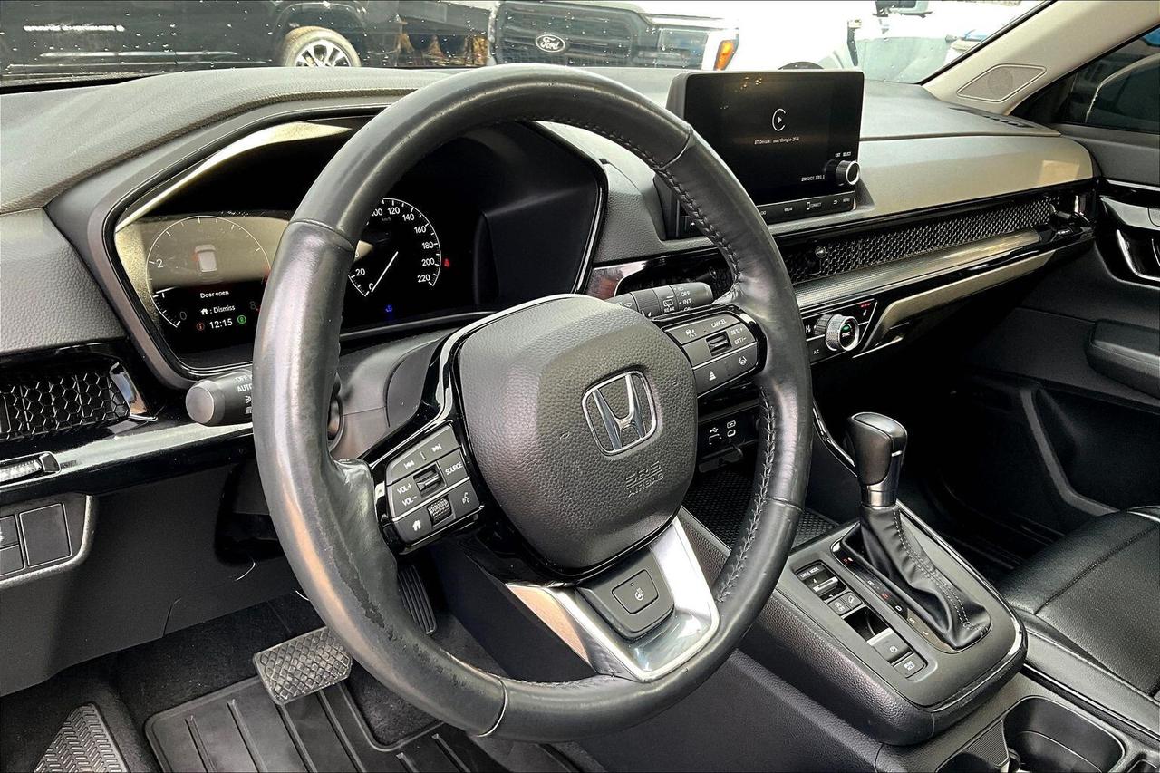 Sized for Canadian life with a premium feel, this 2023 Honda CR V Sport welcomes you with heated leather seats, a heated steering wheel, dual zone automatic climate control, a bright power sunroof, and remote start so every commute begins in comfort. Tech keeps every drive simple and confident, with Apple CarPlay and Android Auto for clean, cord free connectivity, plus Honda Sensing with adaptive cruise control, lane keep assist, forward collision warning, and blind spot monitoring to take the stress out of traffic and highway trips. Outside, Crystal Black Pearl paint and 18 inch gloss black alloys look sharp, while surefooted AWD, the efficient 1.5L turbo, and a hands free power tailgate make errands and winter weekends easy. With One Owner Clean Carfax history, this CR V Sport delivers smart value with style, safety, and everyday versatility.