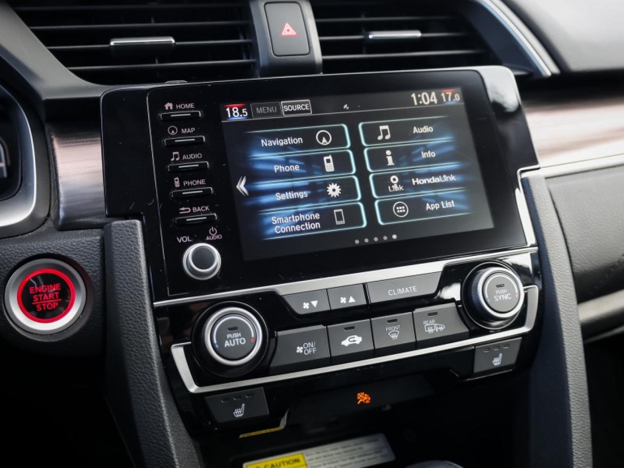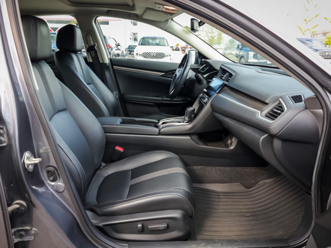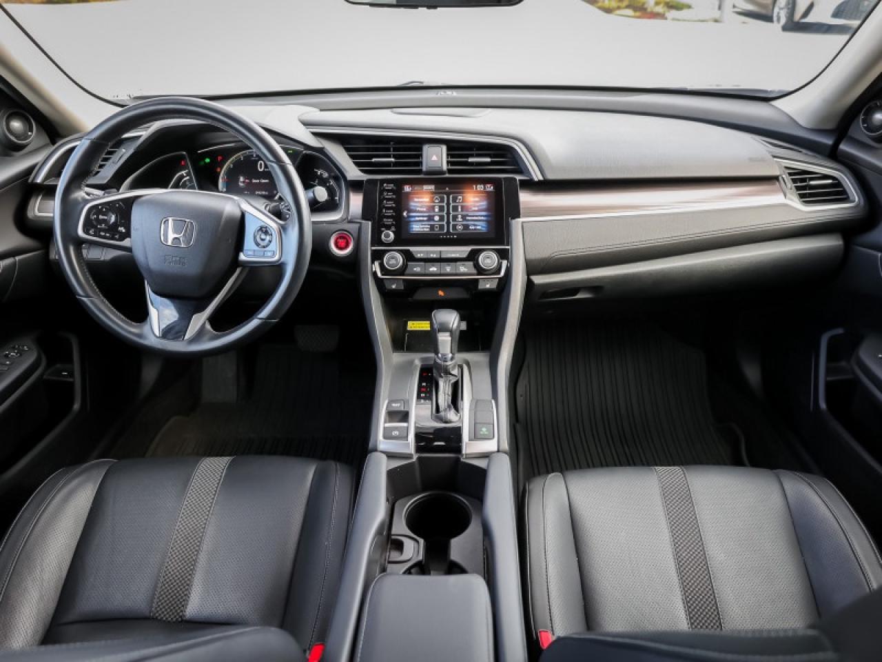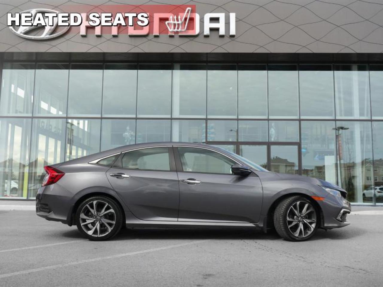 Our Civic Sedan's trim level is Touring. This Touring Civic is the top of luxury with leather trimmed seats, navigation, wireless charging, premium audio, SiriusXM, HR Radio, rain sensing wipers, LED lighting with fog lights, side mirror turn signals, auto dimming rearview mirror, and a HomeLink remote system. Other luxury features include power moonroof, collision mitigation with forward collision warning, lane keep assist with road departure mitigation, adaptive cruise control, blind spot display, heated front seats, remote start, Apple CarPlay, Android Auto, Bluetooth, Siri EyesFree, WiFi tethering, leather steering wheel with cruise and audio controls, multi-angle rearview camera, 7 inch driver information display, and automatic climate control. The exterior has some great style with a proximity key, aluminum trimmed sport pedals, fog lights, paddle shifters, aluminum wheels, independent suspension, heated power side mirrors, and LED taillamps. This vehicle has been upgraded with the following features: Leather Seats, Navigation, Sunroof, Wireless Charging, Premium Audio, Heated Seats, Apple Carplay.