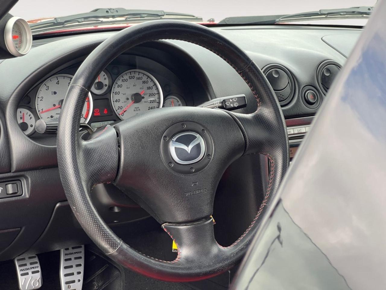 Experience pure driving pleasure with the 2004 Mazda MX-5 Miata MAZDASPEED, a striking red convertible that promises exhilarating RWD handling. This cherished roadster captures the essence of open-air freedom, paired with a spirited 1.8L 4-cylinder engine that's ready to thrill. The exterior is accentuated by sleek lines and stylish alloy wheels, blending form and function effortlessly. Inside, the attention to sporty details continues, featuring luxurious touches such as a leather steering wheel and a leather-wrapped gear shift knob and handbrake with eye-catching red stitching. Beyond its iconic looks, this model offers conveniences such as air conditioning, power windows, and keyless entry for a comfortable drive. The manual transmission is designed for those who revel in engaging driving experiences, perfect for spirited rides on winding roads. If you're a driving enthusiast looking for an iconic sports car with a blend of performance and style, don't miss the opportunity to own this Mazda MX-5 Miata MAZDASPEED. Contact our dealership today to learn more and arrange your test drive.