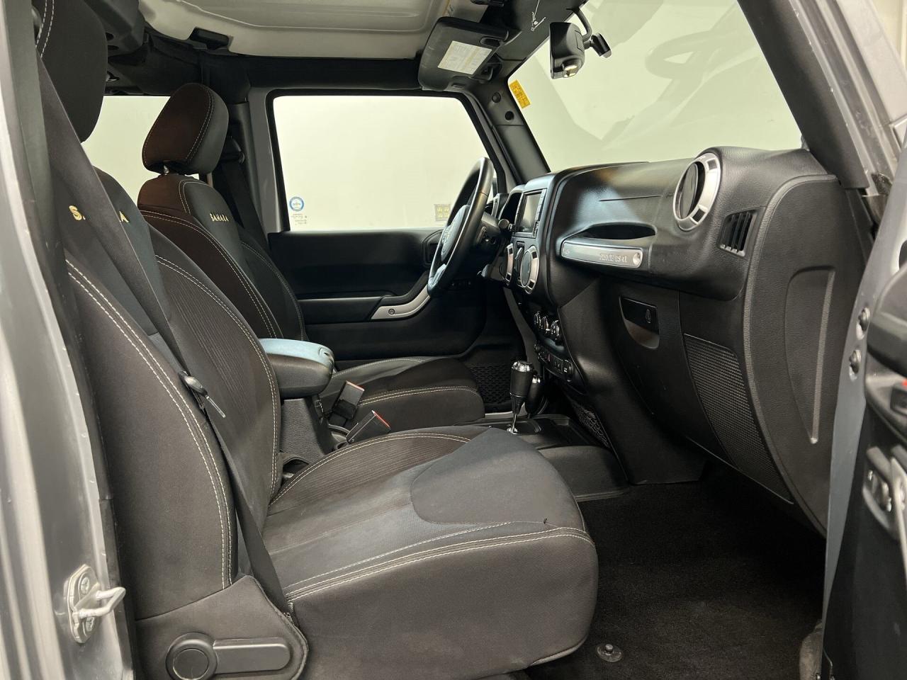 ONLY 89,000 KMS! SAHARA UNLIMITED 4x4 W/ 3.6L V6, BODY-COLOUR FREEDOM-TOP HARD TOP, HEATED SEATS, REMOTE START, NAVIGATION AND 18-IN ALLOYS! Premium 6.5-inch touchscreen, power windows, power locks, power mirrors, tow package, running boards, lever-style transfer case controls, Bluetooth, auto-dimming rearview mirror, full-sized spare tire, air conditioning, keyless entry, cruise control and Sirius XM!