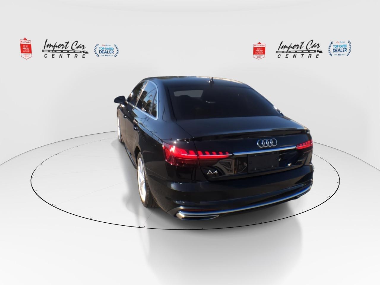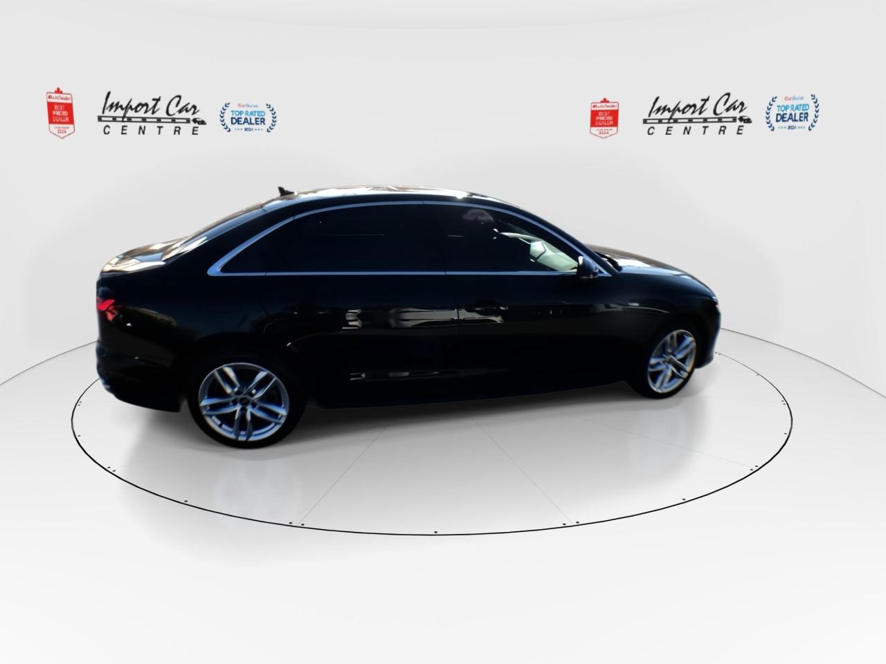 *** 2024 AUTOTRADER BEST PRICED DEALER AWARD 2024 * CARGURUS TOP RATED DEALER 2024 * NO ACCIDENTS * SMETANA APPROVED *** The Audi A4 represents fantastic value for your hard earned dollar, has incredible Quattro all wheel drive handling, is loaded with equipment and a plethora of safety features!! Finished in Mythos Black Metallic with gorgeous contrasting Okapi Brown leather seating surfaces, S Line, thigh extensions, comfort seats, 18 alloys, moonroof, park distance control, keyless access, heated seats and ventilated seats, 2 stage driver's seat memory, paddle shifters, Audi Drive Select, start/stop function, traction control, hill decent, SiriusSM radio, dual zone climate control, Audi Vitrual Cockpit, navigation, Bang and Olufsen sound system, backup camera, 360 camera, poer folding mirrors, Qi-wireless charging, leathr wrapped steering wheel, rear cross traffic monitor, distance warning, traffic jam assist, active lane assist, Audi Pre Sense, Audi Side Assist, speed warning, Audi Adaptive Cruise Control, distance warning, only 56,000kms all compliment this stunning 2023 Audi A4 Quattro Technik Sline. Perfection and beyond!! Home of the Platinum up to 240,000kms warranty and financing is always available O.A.C Import Car Centre, proudly serving the Ottawa and surrounding area for over 45 years. Come down and experience Import Car Centre for yourself and see just why our customers are so happy! Advertised price includes $22 OMVIC fee and $40 Carproof. Excludes taxes and licensing.<