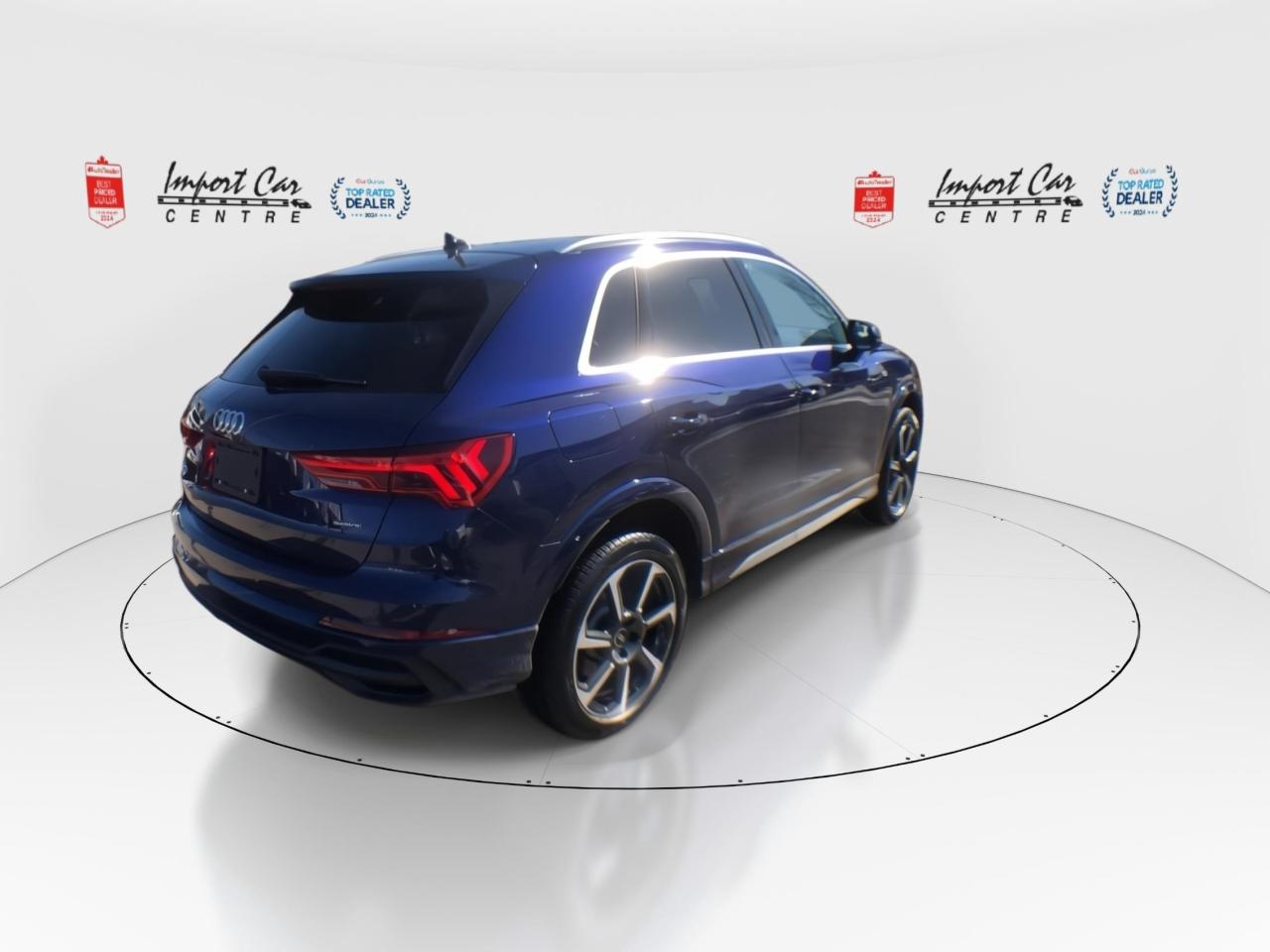 *** OTTAWAS ORIGINAL IMPORT DEALER!! SMETANA APPROVED *** This 2024 Audi Q3 Progressiv with Navigation package is truly like new and stunning in every facet!! Finished in Navarra Blue with gorgeous black leather seating surfaces, incredible all wheel drive handling, Sonos sound system, Audi Virtual Cockpit, navigation, dual climate control system, heated seats, heated steering wheel, Audi Drive Select, traction control, start/stop technology, park distance control, hill decent, sport seats with thigh extensions, backup camera, heated steering wheel, speed warning, adaptive cruise control, distance warning, lane departure warning, Audi Pre-Sense, Audi Side Assist, rear cross traffic alert, rain sensing wipers, ambient interior lighting, leather wrapped steering wheel and gearshift, 19 alloys, only 9,540 all compliment this stunning and like new 2024 Audi Q3 Progressiv with Navigation package. Perfection and beyond!! Home of the Platinum up to 240,000kms warranty and financing is always available O.A.C Import Car Centre, proudly serving the Ottawa and surrounding area for over 45 years. Come down and experience Import Car Centre for yourself and see just why our customers are so happy!