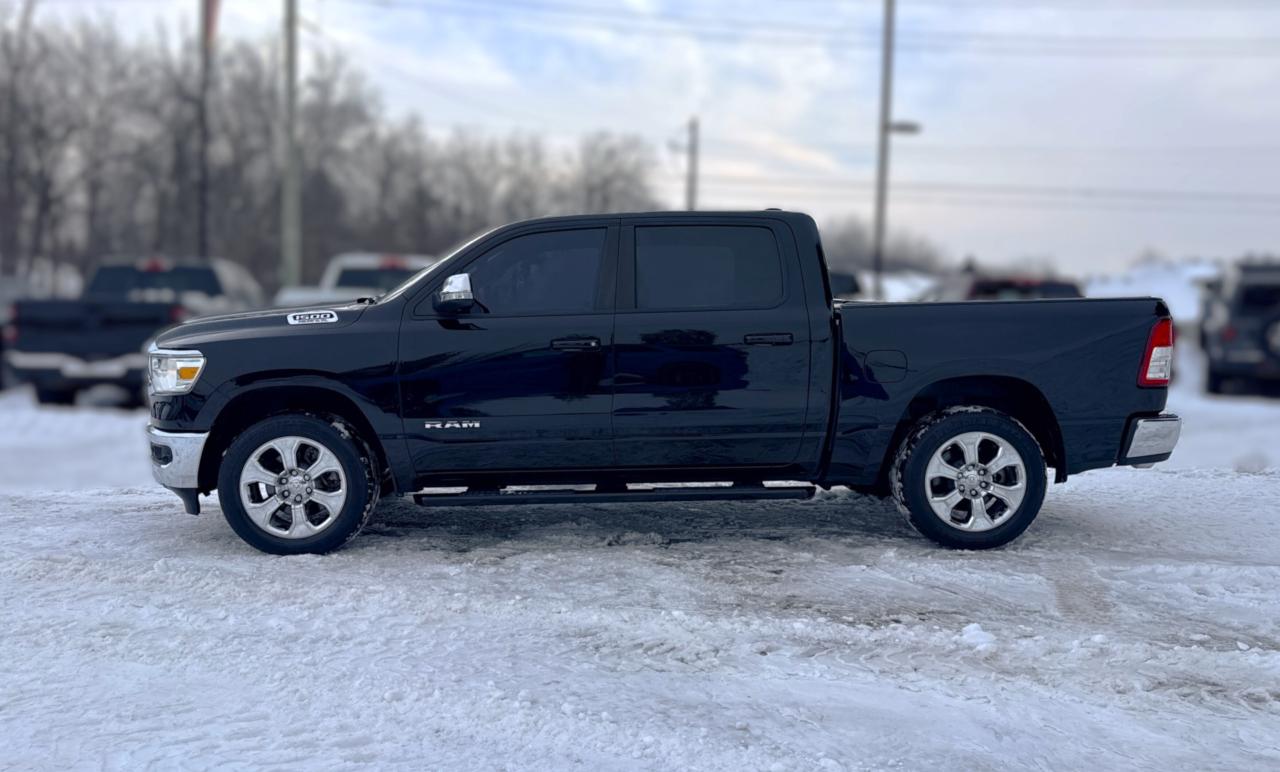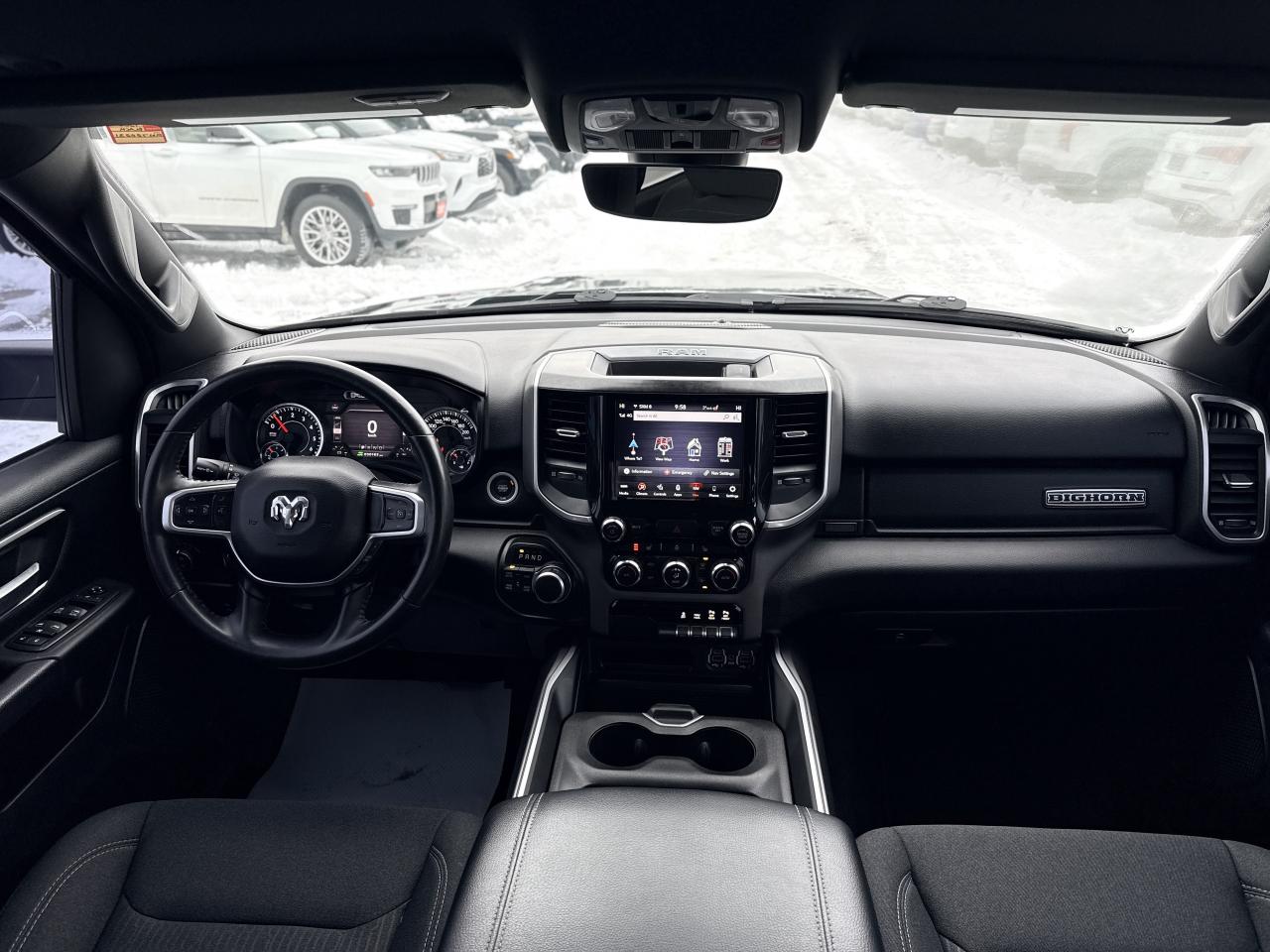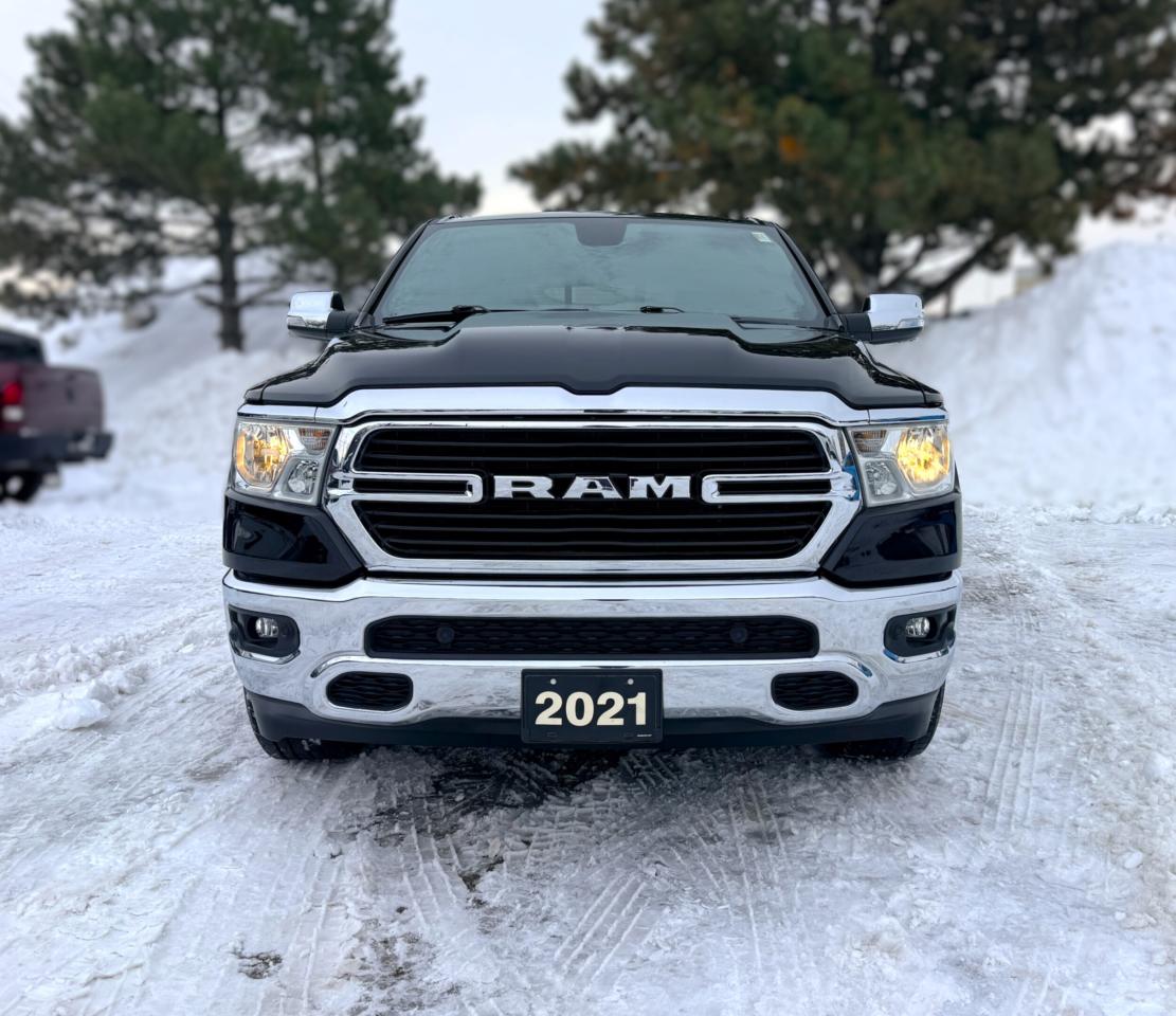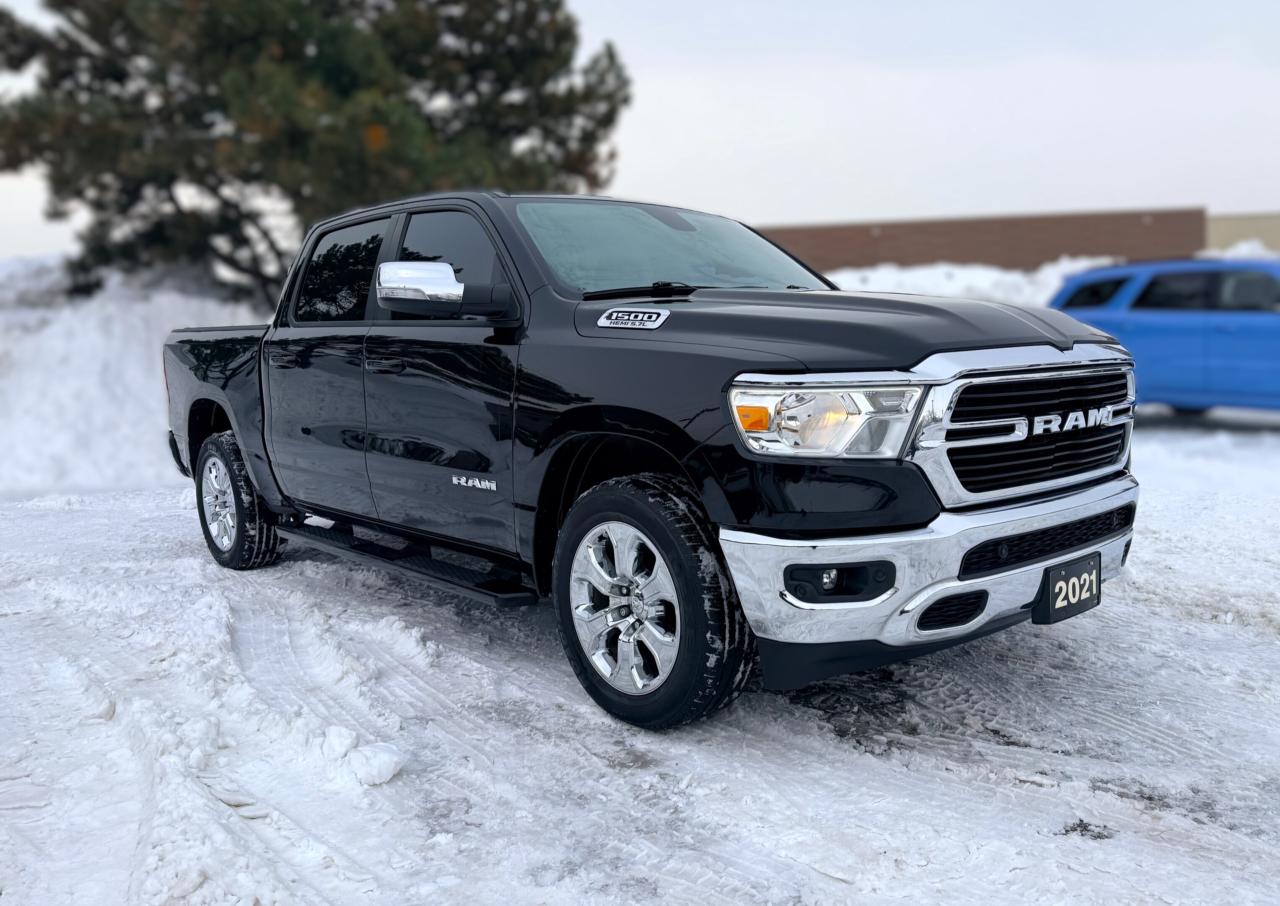 Our bold 2021 RAM 1500 Big Horn Crew Cab 4X4 makes a powerful impression in Diamond Black Crystal Pearl! Motivated by a 5.7 Litre HEMI V8 supplying 395hp connected to an 8 Speed Automatic transmission so you can tow or haul without breaking a sweat. This trail-friendly Four Wheel Drive truck also rewards you with responsive handling, and it achieves approximately 11.2L/100km on the highway. Take command of your challenges in style with our RAM's quad halogen headlights, fog lamps, a chrome grille, bright alloy wheels, running boards, a tonneau cover, a Class III hitch receiver, and bright bumpers.