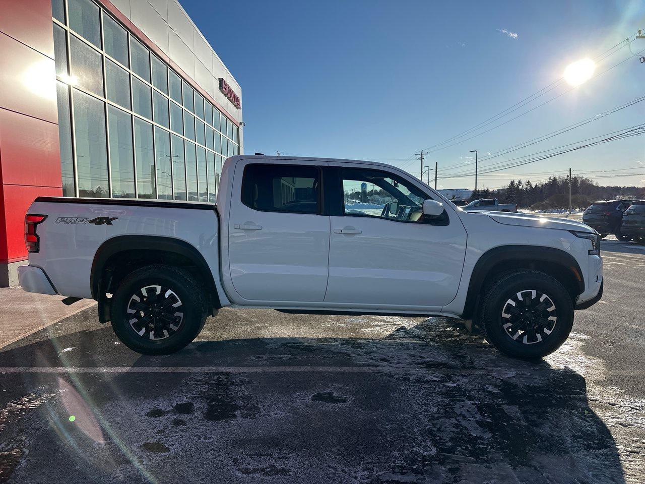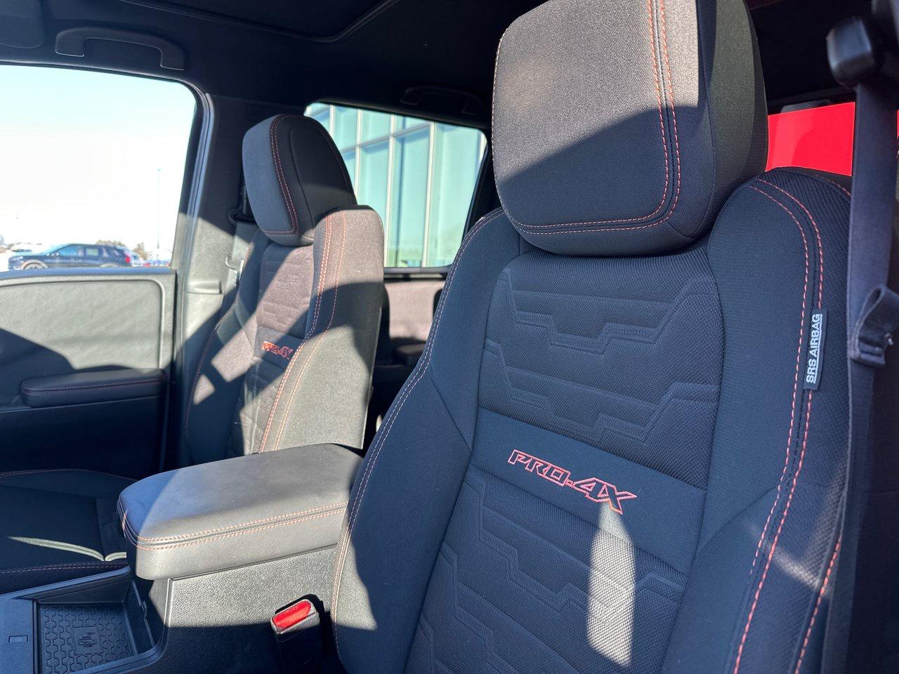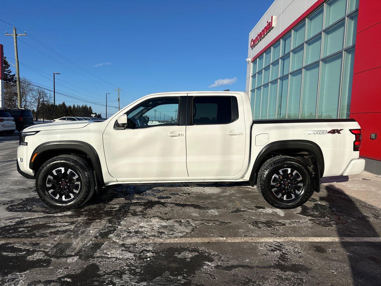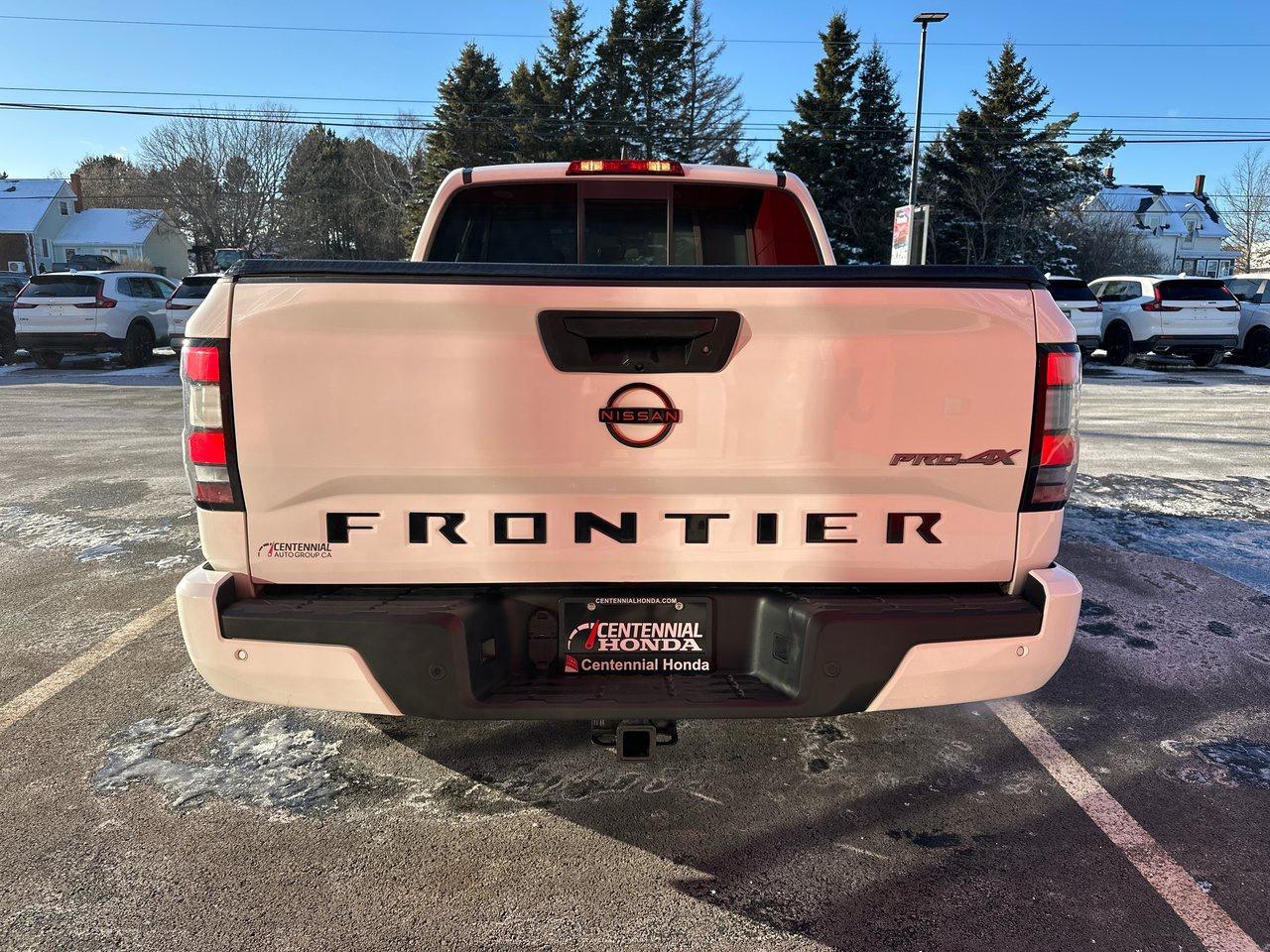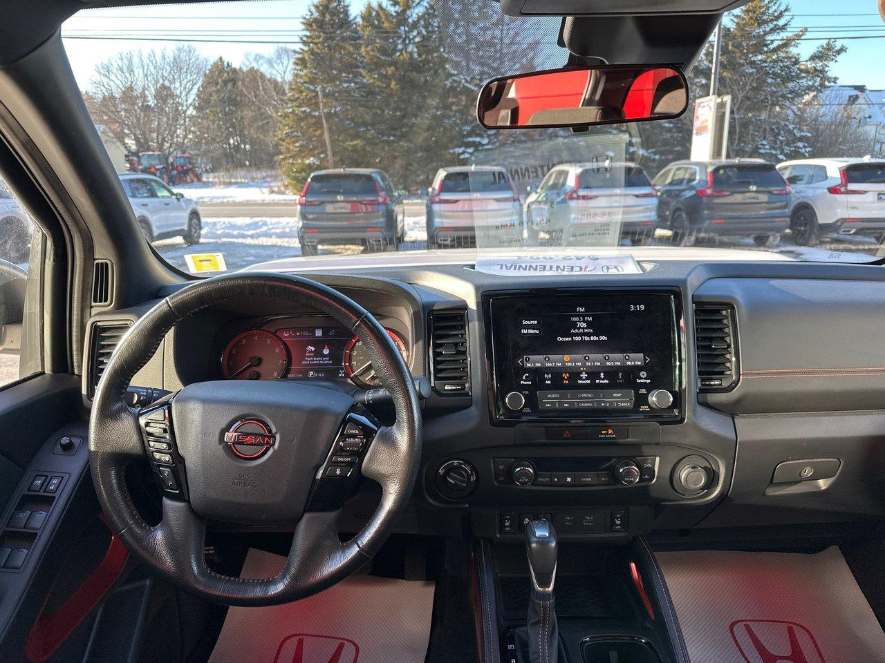 Inside, the 2022 Frontier PRO-4X's list of features include a 9-inch centre screen with Apple CarPlay/Android Auto, door-to-door navigation, and an Around View Monitor with off-road mode. There's wireless charging, a power driver's seat, sliding rear window, dual-zone automatic climate control, heated seats and steering wheel, integrated remote start, and proximity access/pushbutton start. There's so much technology, as well: adaptive cruise control, blind spot monitoring, rear cross traffic alert, rear sonar, rear automatic braking, intelligent emergy braking with pedestrian detection, forward collision warning, lane departure warning, and intelligent driver alertness.