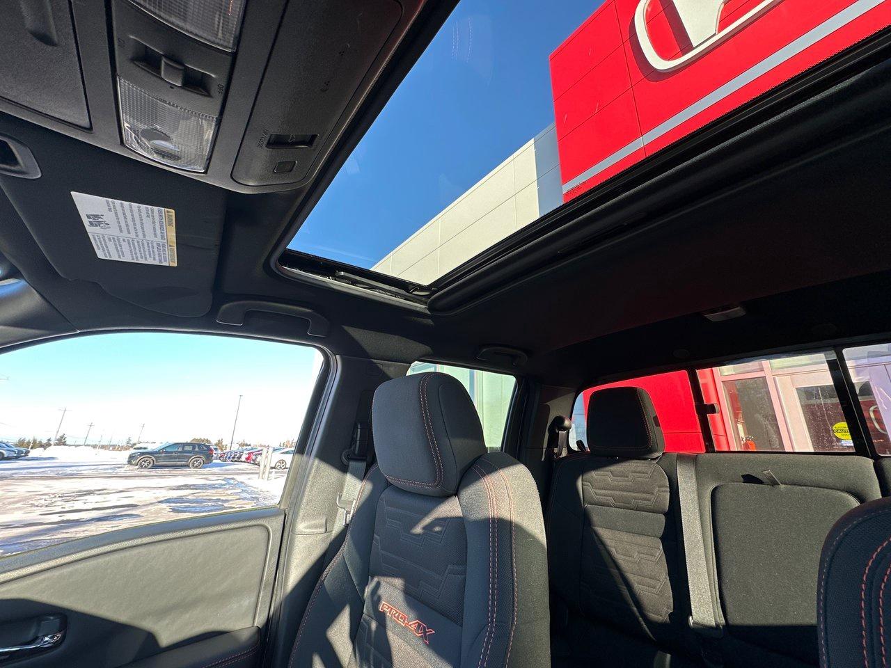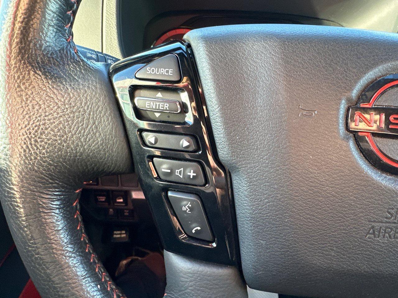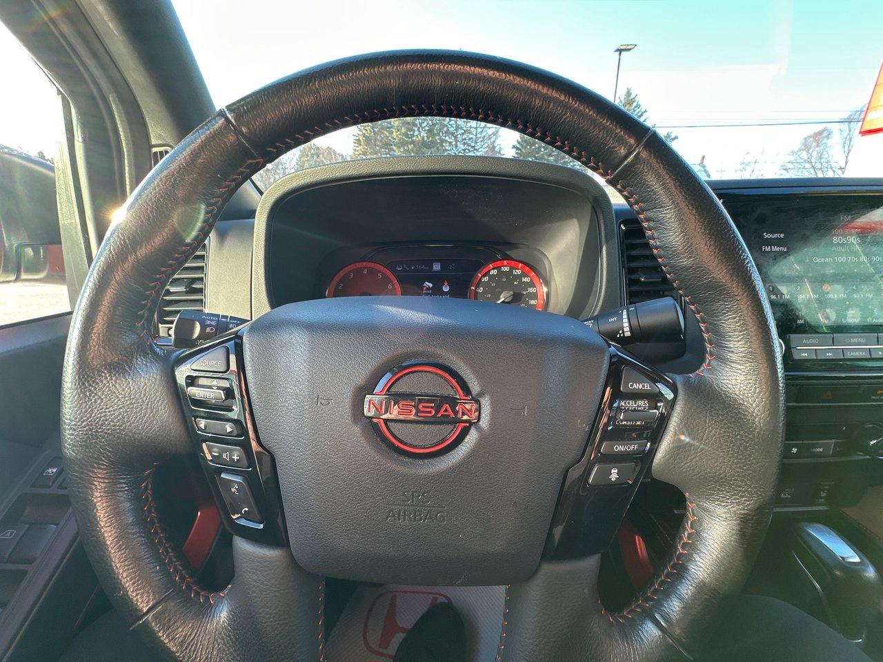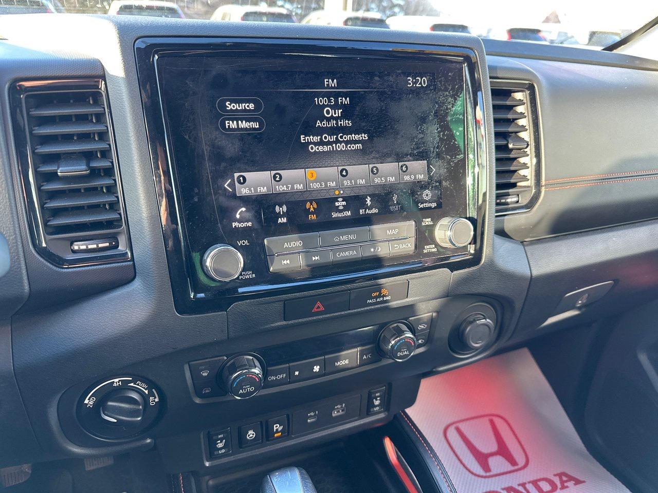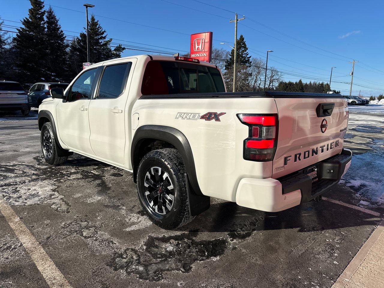 Inside, the 2022 Frontier PRO-4X's list of features include a 9-inch centre screen with Apple CarPlay/Android Auto, door-to-door navigation, and an Around View Monitor with off-road mode. There's wireless charging, a power driver's seat, sliding rear window, dual-zone automatic climate control, heated seats and steering wheel, integrated remote start, and proximity access/pushbutton start. There's so much technology, as well: adaptive cruise control, blind spot monitoring, rear cross traffic alert, rear sonar, rear automatic braking, intelligent emergy braking with pedestrian detection, forward collision warning, lane departure warning, and intelligent driver alertness.