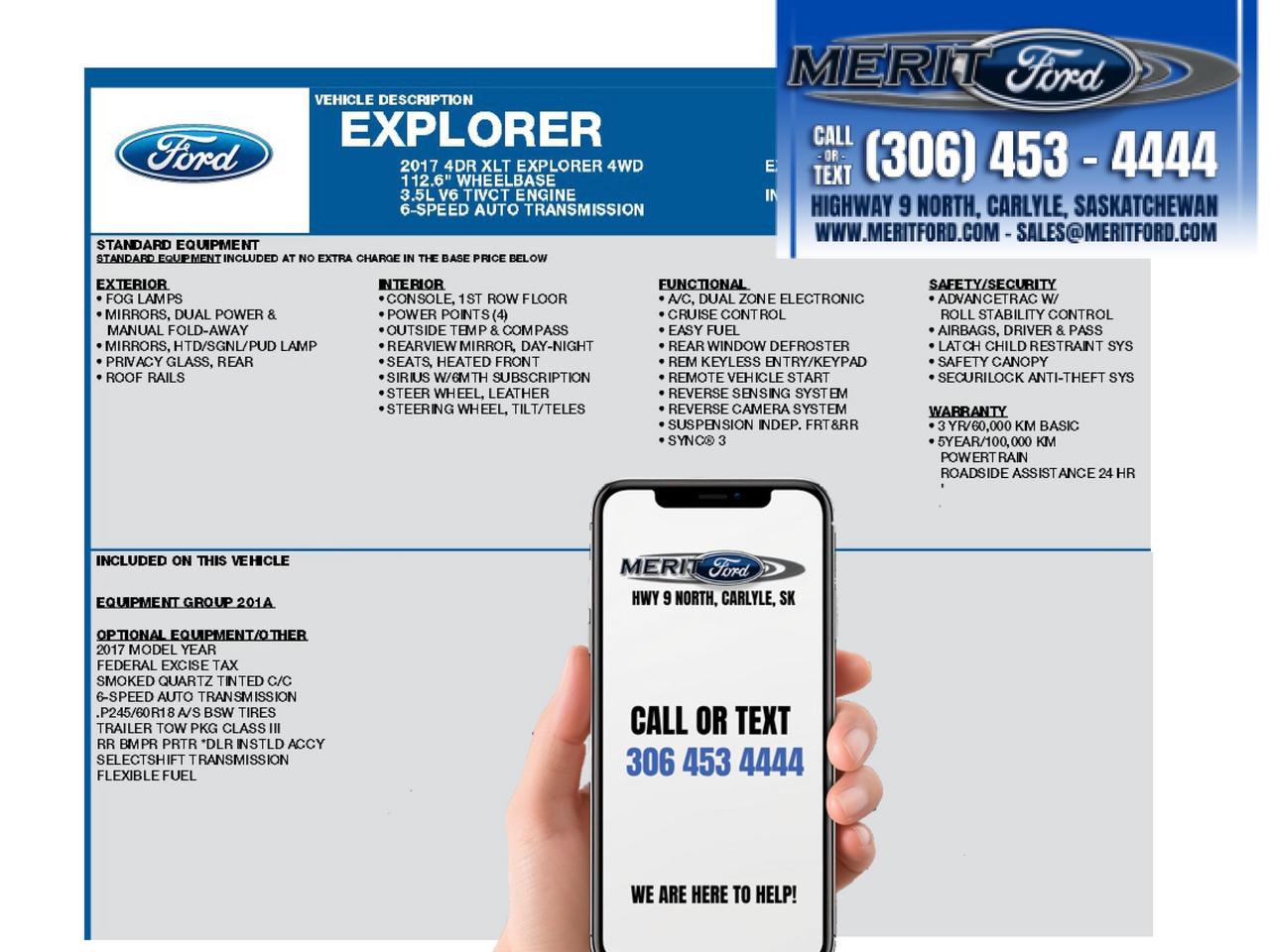 With 6-passenger seating, genuine 4WD capability, and a robust 3.5L V6 under the hood, this 2017 Ford Explorer XLT from Merit Ford Sales is built for families and adventurers who need a vehicle that works as hard as they do. Loaded with the 201A Equipment Group plus a Class III Trailer Tow Package, this Explorer punches well above its price point.