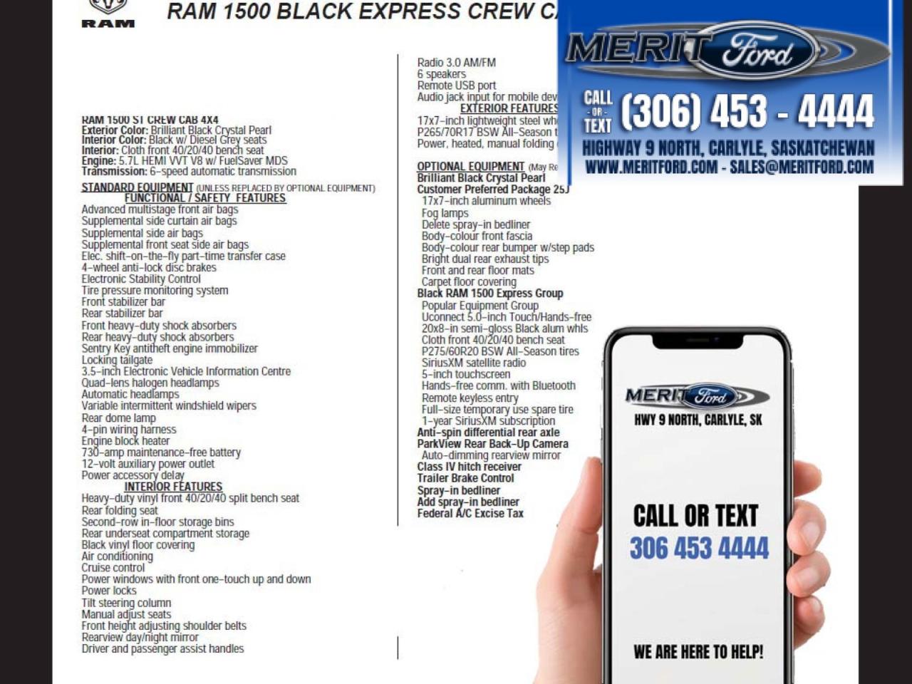 Looking for a reliable and capable pickup truck? Check out this rugged 2017 RAM 1500 Express, available now at Merit Ford Sales Ltd. This truck is ready to tackle any job or adventure, boasting a powerful 5.7L HEMI VVT V8 engine and a durable 4-wheel drive system. With only 108,000 KM on the odometer, this RAM 1500 is ready for many more years of service. Its sleek Brilliant Black Crystal Pearl exterior and Diesel Grey/Black interior give it a commanding presence on the road.