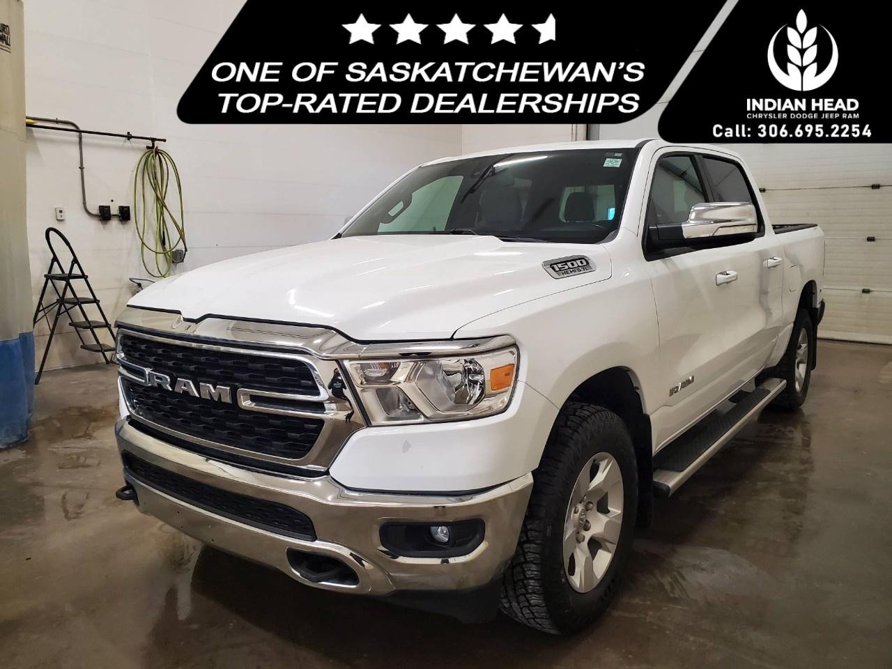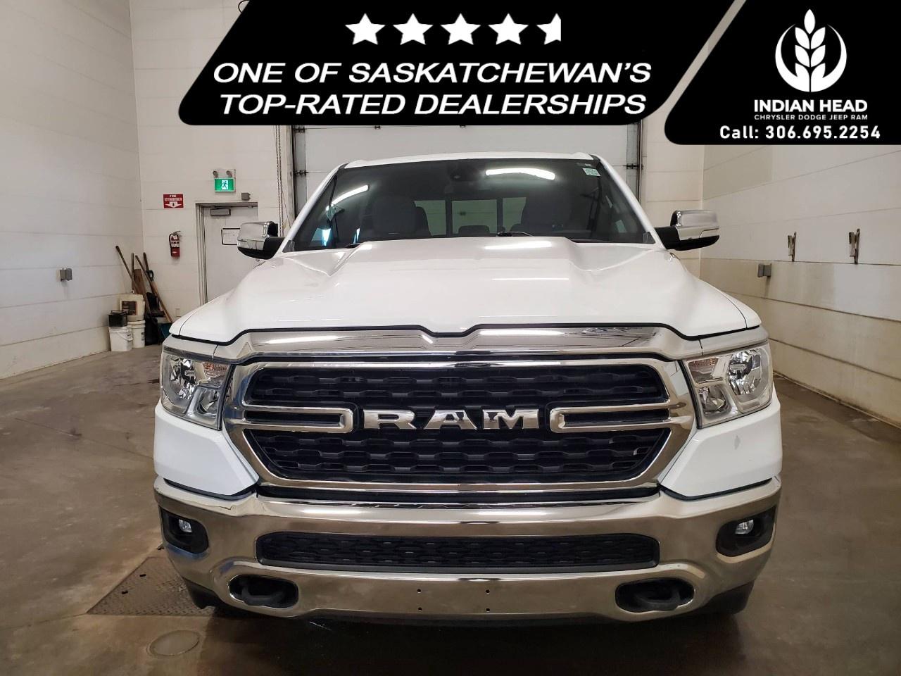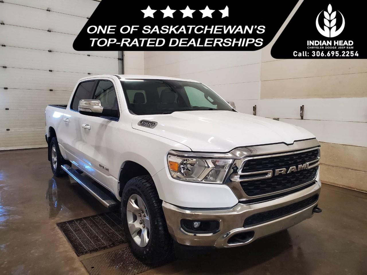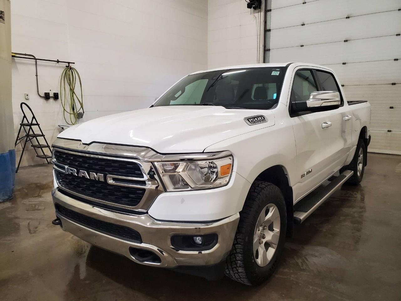 The 2022 Ram 1500 Big Horn 4x4 Crew Cab 5'7" Box in a classic white finish offers a robust and reliable driving experience with its capable 4×4 drivetrain and smooth handling. Perfect for those seeking both style and utility, this truck exudes confidence on and off the road.