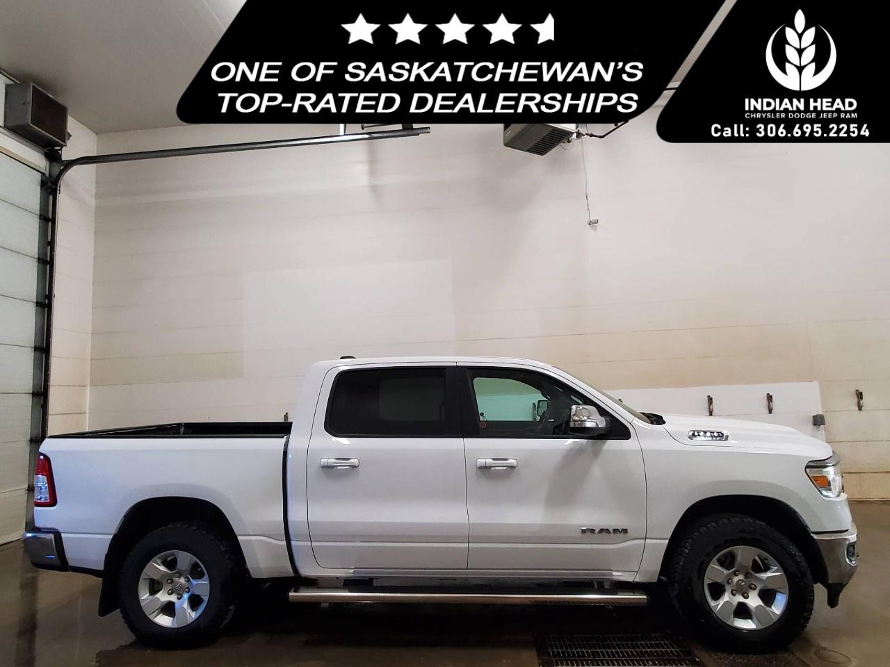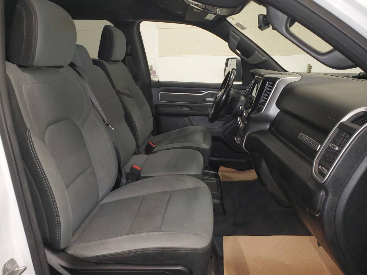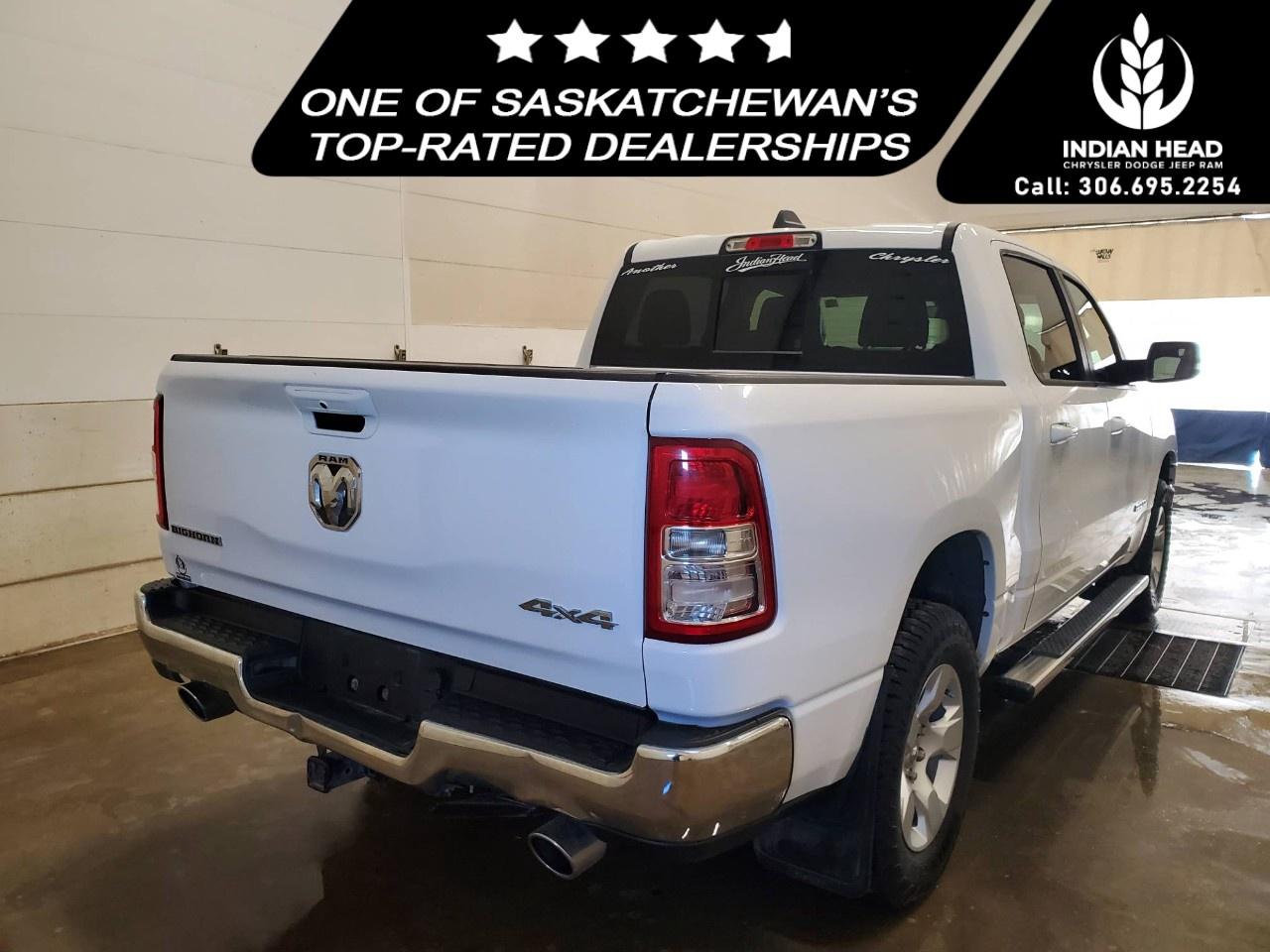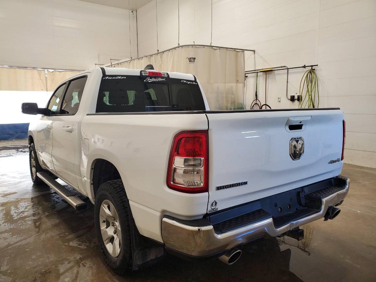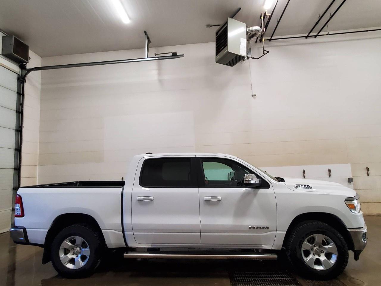 The 2022 Ram 1500 Big Horn 4x4 Crew Cab 5'7" Box in a classic white finish offers a robust and reliable driving experience with its capable 4×4 drivetrain and smooth handling. Perfect for those seeking both style and utility, this truck exudes confidence on and off the road.