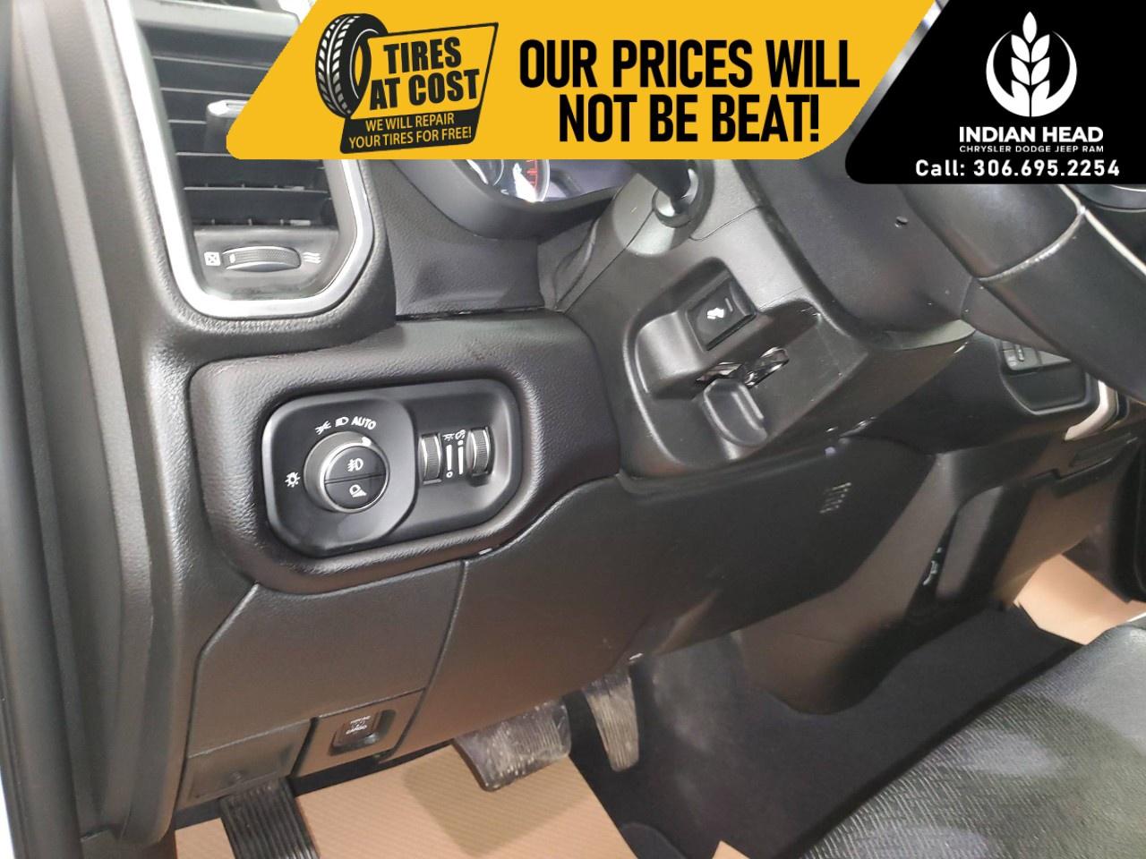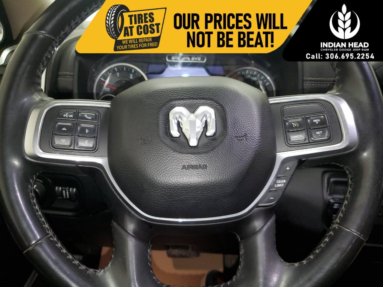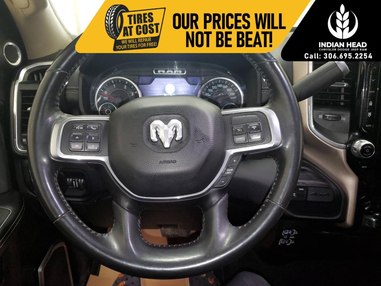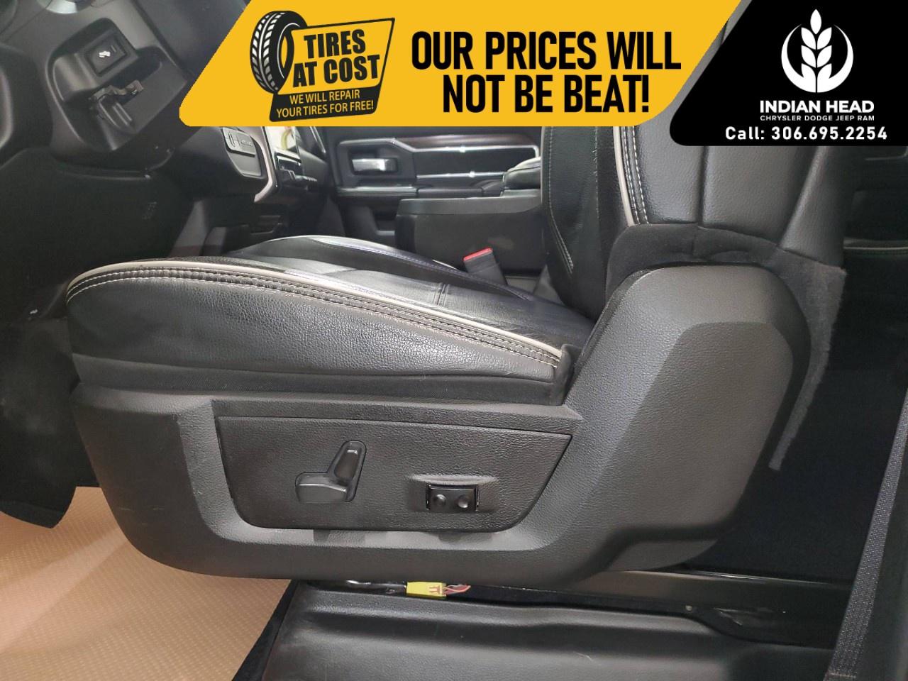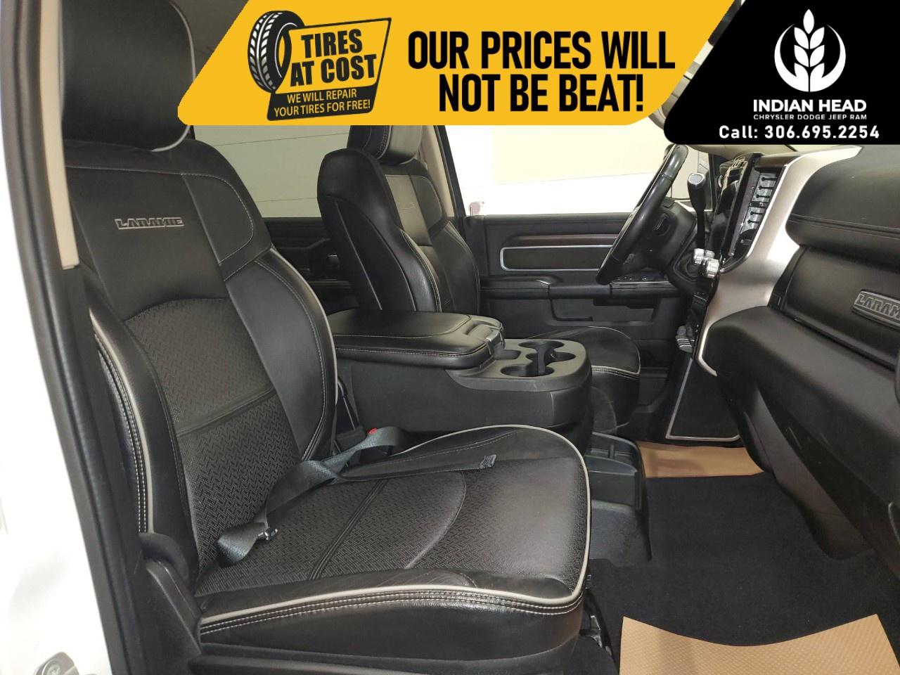 With its commanding exterior, the Laramie's design is both functional and attractive, featuring alloy wheels and the convenience of heated mirrors. The interior is a blend of luxury and practicality, showcasing a black leather and simulated suede ensemble, complete with a heated steering wheel and power-adjustable heated front seats for added comfort during those chilly Canadian mornings.