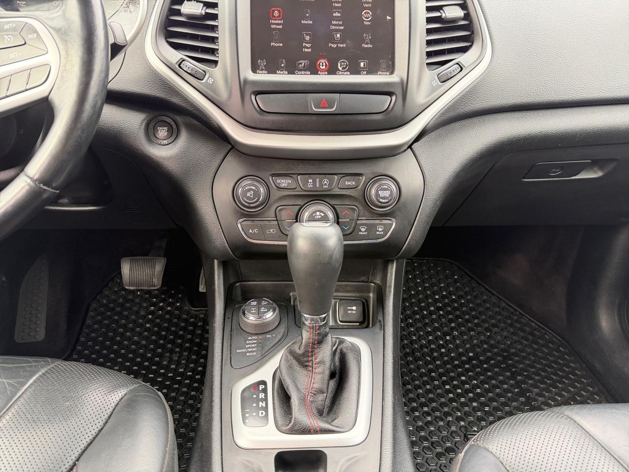 Inside, youll find **heated power memory leather seating**, a **heated steering wheel**, **navigation**, **Bluetooth**, **SiriusXM**, **CD player**, **HomeLink**, and a **backup camera**. A stunning **panoramic sunroof**, **roof rails**, and **command start** elevate your driving experience, while the **power liftgate** adds everyday convenience. The Trailhawks signature **tow hooks** and robust **V6 engine** make it ready for weekend adventures and daily driving alike.