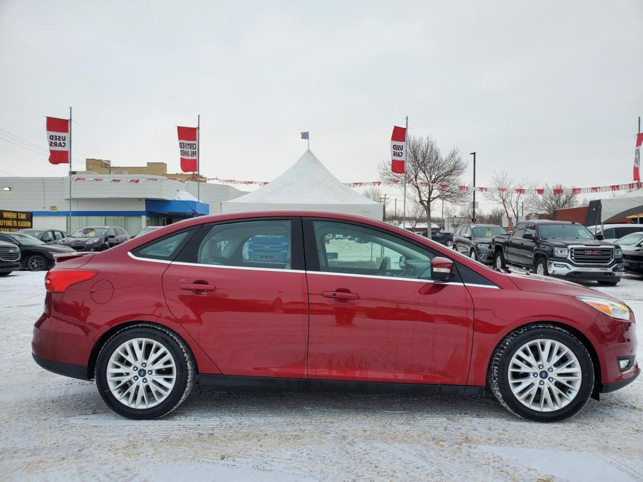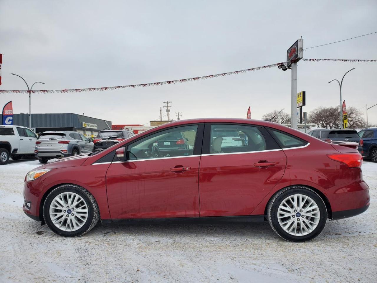 This 2016 Ford Focus Titanium in Ruby Red Metallic with beige leather interior is stylish, reliable, fuel-efficient, and fully loaded with premium features. It's the perfect sedan for daily driving in Saskatchewan.