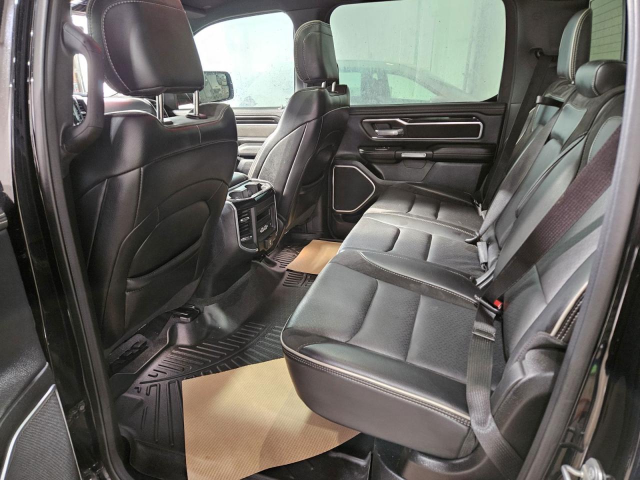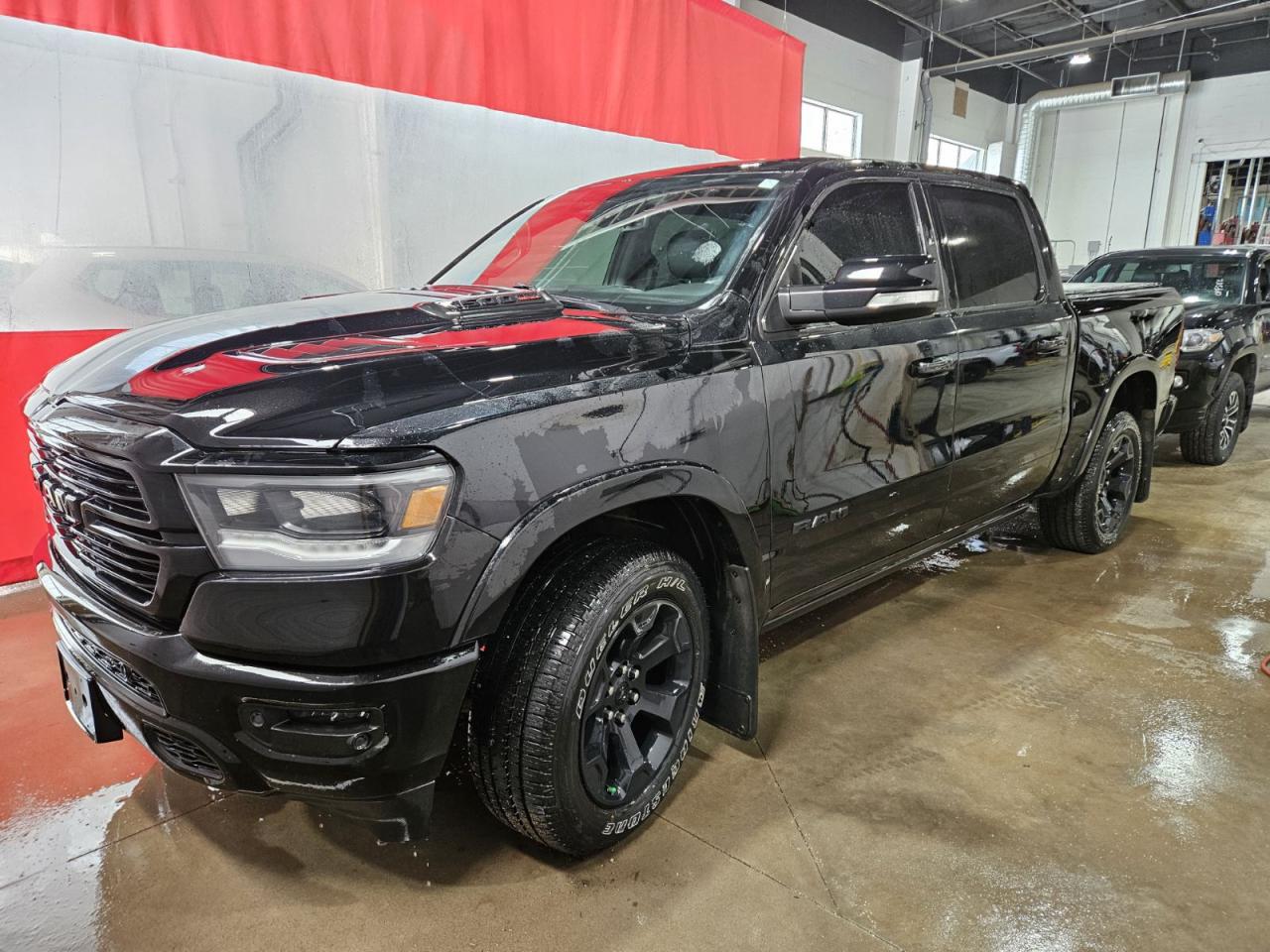 Turn heads with this accident-free 2020 RAM 1500 Laramie Night Edition Crew Cab - a striking Diamond Black Crystal Pearl truck that blends premium comfort with serious capability. Under the hood, the 3.0L EcoDiesel six-cylinder turbo delivers strong torque and excellent fuel efficiency while the 4x4 drivetrain and 3.92 rear axle ratio make towing and winter driving confident and controlled. The Night Editions 22-inch black forged aluminum wheels, body-colour bumpers and sport performance hood give it a menacing, modern stance matched by LED headlamps, fog lamps and LED bed lighting. Inside, the cabin is built for long hauls and everyday life with cooled and heated perforated leather seats, heated rear seats, heated steering wheel and dual-zone automatic climate control keeping everyone comfortable year-round. Technology takes center stage on the 12-inch touchscreen with navigation, Apple CarPlay/Android Auto compatibility, wireless charging and a 19-speaker Harman/Kardon system that turns the truck into a rolling concert hall. Safety and driver aids are comprehensive - adaptive cruise control with stop-and-go, lane keep assist, blind-spot and cross-path detection, forward collision warning with active braking, Park-Sense front/rear and ParkView backup camera, plus parallel and perpendicular park assist. A dual-pane panoramic moonroof brightens the interior, remote start and remote proximity keyless entry simplify daily use, and an integrated 4G LTE Wi-Fi hotspot keeps devices connected on the go. Practical capability is ready too, with a spray-in bedliner, Class IV hitch receiver with trailer brake controller and useful LED taillamps. If you want a premium, accident-free Laramie Night Edition that balances luxury, tech and towing-ready performance, stop by Saskatoon Auto Connection to see it in person.