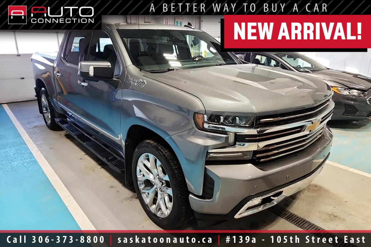 Available now at Saskatoon Auto Connection, this 2021 Chevrolet Silverado 1500 High Country in Satin Steel Metallic blends refined luxury with genuine capability for drivers who want both. Under the hood the proven 5.3L EcoTec3 V8 and Advanced Trailering Package - complete with integrated trailer brake controller - deliver a confident 9,200 lb. towing capacity so you can tackle work or weekend plans without hesitation. Step inside and the cabin reads like a premium lounge: Jet Black perforated leather, cooled front seats, heated front and rear seats and a heated steering wheel keep everyone comfortable no matter the season. Connectivity and convenience are seamless with navigation and voice recognition, Apple CarPlay/Android Auto, wireless charging, a 4G LTE Wi-Fi hotspot and an 8-inch multi-colour driver information centre with head-up display. Parking, trailering and low-speed maneuvers are made simple by HD Surround Vision with Bed View, rear camera mirror, front/rear park assist and an Advanced Safety suite that includes adaptive cruise with following-distance indicator, lane-keep and lane-change alerts, rear cross-traffic alert and automatic emergency braking. Practical touches like remote start, power moonroof, power-folding heated mirrors, power tailgate release, ChevyTec spray-on bedliner and a tonneau cover mean this truck is ready for daily life and heavy use. On the road the 22-inch polished-aluminum wheels, high-intensity LED headlamps and Bose 7-speaker system with Richbass subwoofer deliver presence and polish to match the capability. Whether you need a rugged hauler, a comfortable family vehicle, or a luxurious daily driver, this High Country strikes a rare balance of tech, safety and performance. Contact us today to arrange a test drive and experience why this Silverado stands out as the premium choice for serious truck buyers.