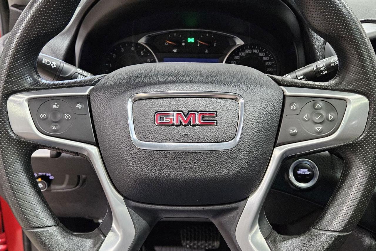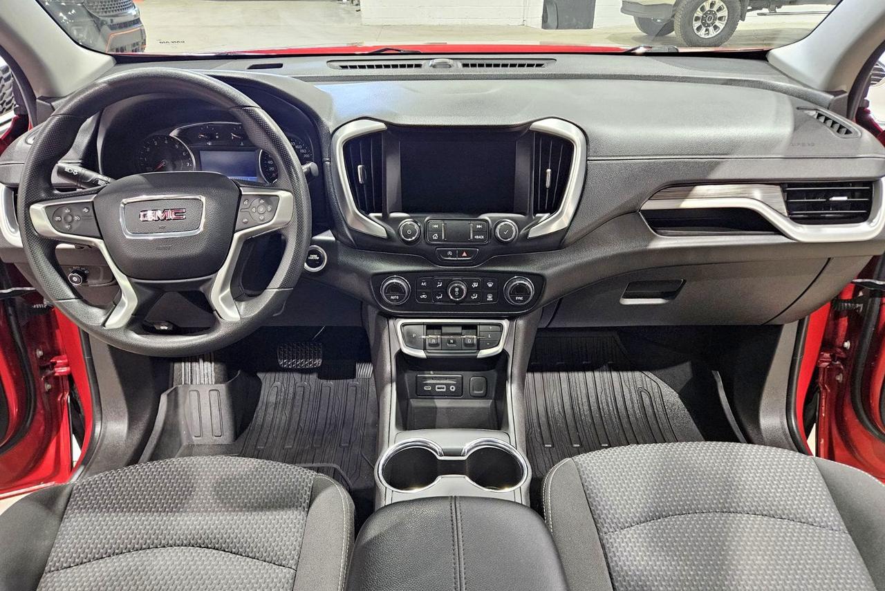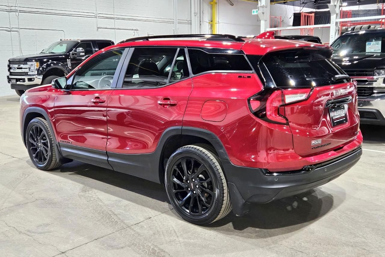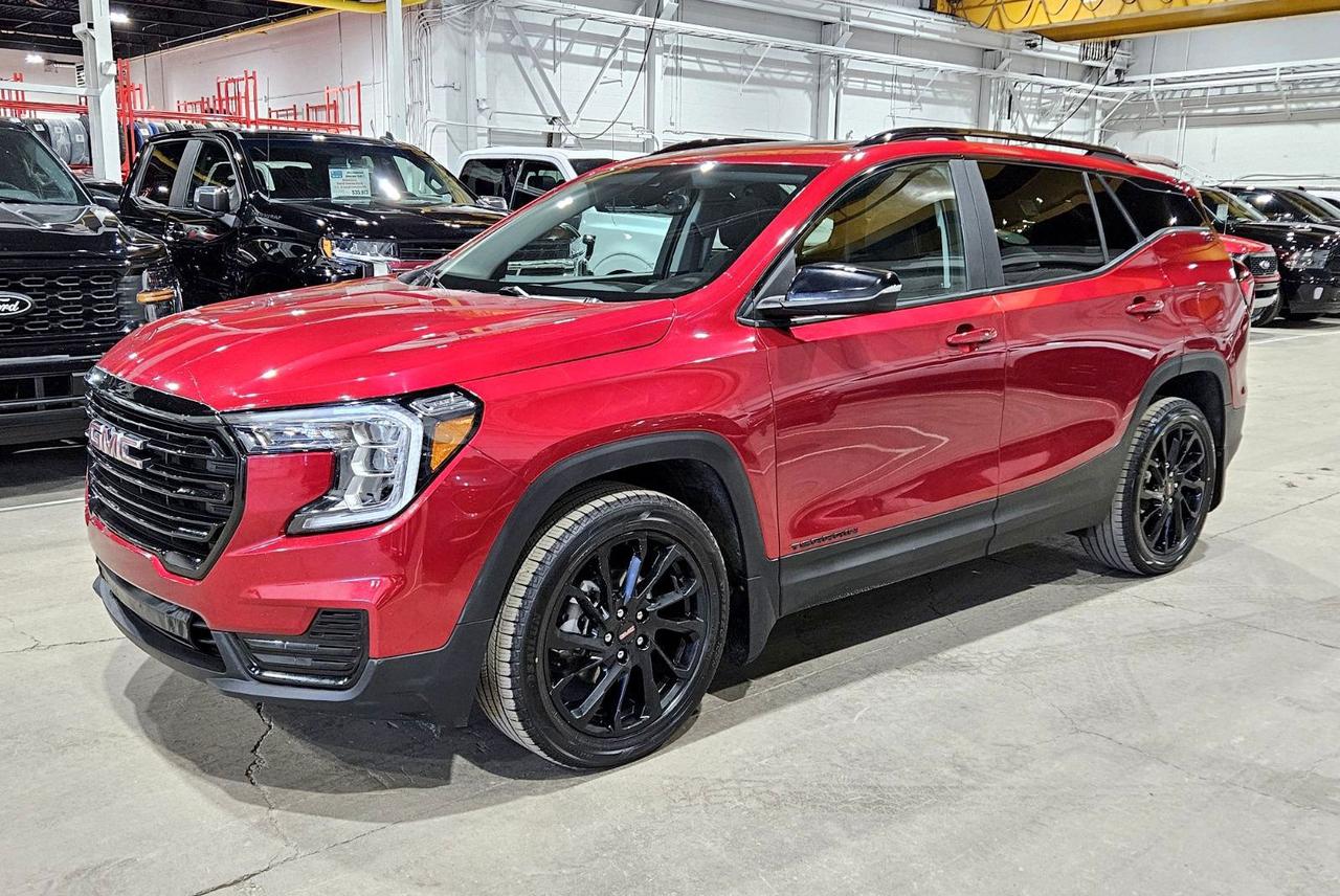 Turn heads in this accident-free, Saskatchewan-owned 2024 GMC Terrain SLE finished in striking Volcanic Red Tintcoat and trimmed in Jet Black cloth. The Elevation Edition styling pairs with gloss-black 19-inch aluminum wheels, a darkened grille and black roof rails and badging for a bold, modern presence that stands out on city streets or the highway. Under the hood the efficient 1.5L turbocharged four-cylinder and responsive All-Wheel Drive deliver confident acceleration and an impressive 9.3 L/100km combined fuel economy, making daily driving economical without sacrificing capability. Inside you will find a comfortable, tech-forward cabin highlighted by an 8-inch touchscreen with navigation and seamless Apple CarPlay and Android Auto compatibility, plus a 110V outlet for keeping devices charged on the go. The SkyScape power moonroof fills the interior with light, while heated seats and remote start make every commute and cold morning more enjoyable. Practical touches like the power liftgate, HD Rear Vision Camera and rear park assist simplify loading and parking, and the roomy cargo area swallows gear for weekend adventures. This Terrain is equipped with an array of active safety systems - adaptive cruise control, lane keep assist, lane change alert with side blind zone alert, rear cross-traffic alert, front pedestrian braking, and automatic emergency braking - adding layers of protection for you and your passengers. It also includes GMCs Pro Grade Package and Pro Safety Plus for enhanced capability and peace of mind. Come see it in person at Saskatoon Auto Connection to take a test drive and discover how this Terrain blends style, efficiency and safety into one well-rounded package.