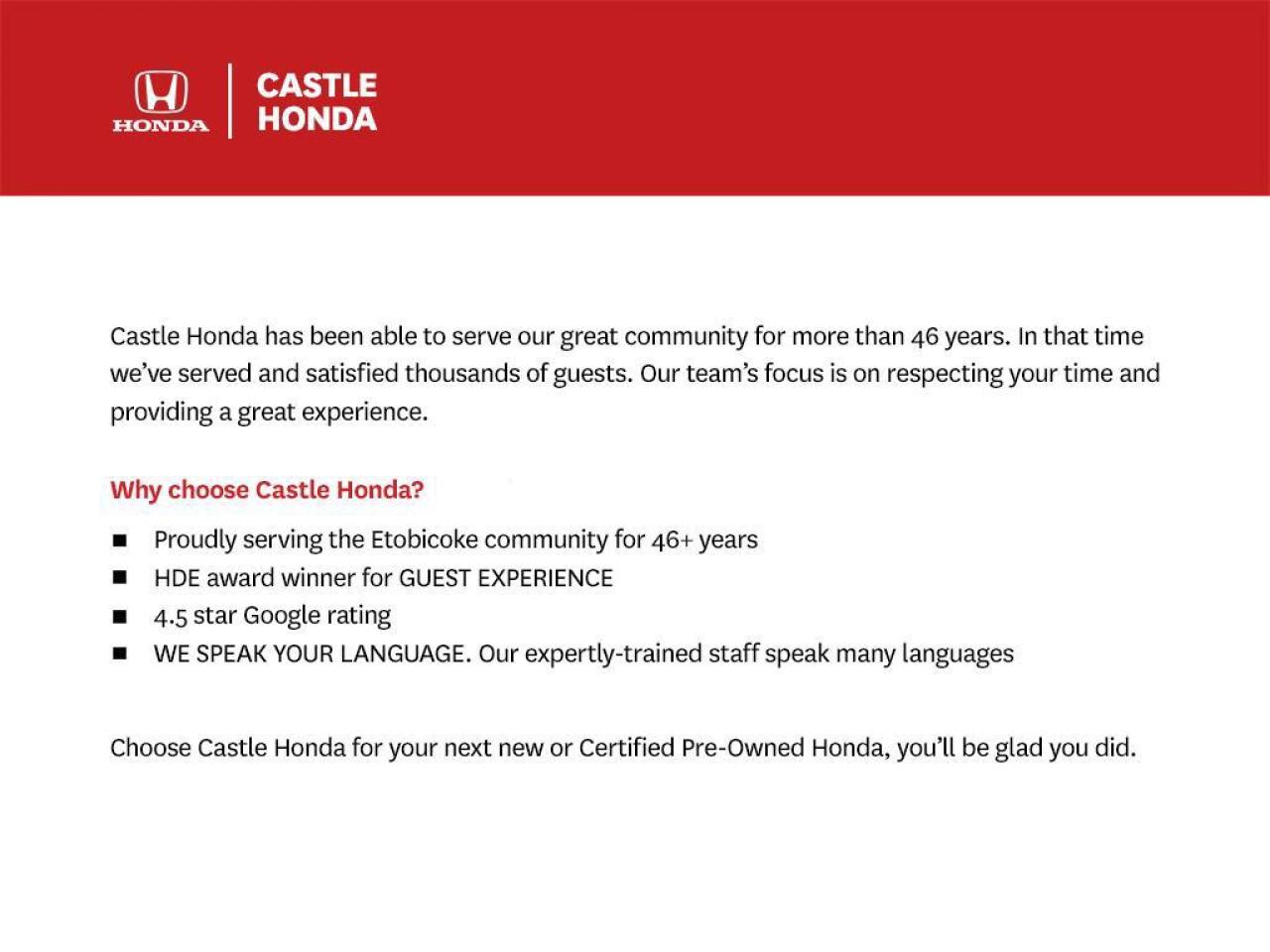 Make a Trip to Castle Honda For a New Honda in Etobicoke, Ontario Our knowledgeable sales staff have been trained and certified to provide amazing customer service. Our Etobicoke Honda Dealership has been selling and servicing the Toronto and the GTA for a long time - our experience is second to none! Castle Honda is the first and last place you will need to shop for your NEW Honda Car or SUV. We look forward to the opportunity to earn your business. Try out or hassle free E-Pricer or Make An Offer form if you need immediate assistants please call us at 416-745-7060 __________________________________________________ Make a Trip to Castle Honda For a New Honda in Etobicoke, Ontario Our knowledgeable sales staff have been trained and certified to provide amazing customer service. Our Etobicoke Honda Dealership has been selling and servicing the Toronto and the GTA for a long time - our experience is second to none! Castle Honda is the first and last place you will need to shop for your NEW Honda Car or SUV. We look forward to the opportunity to earn your business. Try out or hassle free E-Pricer or Make An Offer form if you need immediate assistants please call us at 416-745-7060